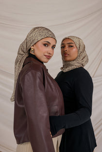 Khadija takes inspiration from @nawalsari here, who put this look on the map. Using the Silk Crocodile Square tied back in a bandana style, with Gravity Grey underneath, this two-in-one style is the kind of carefree we love.