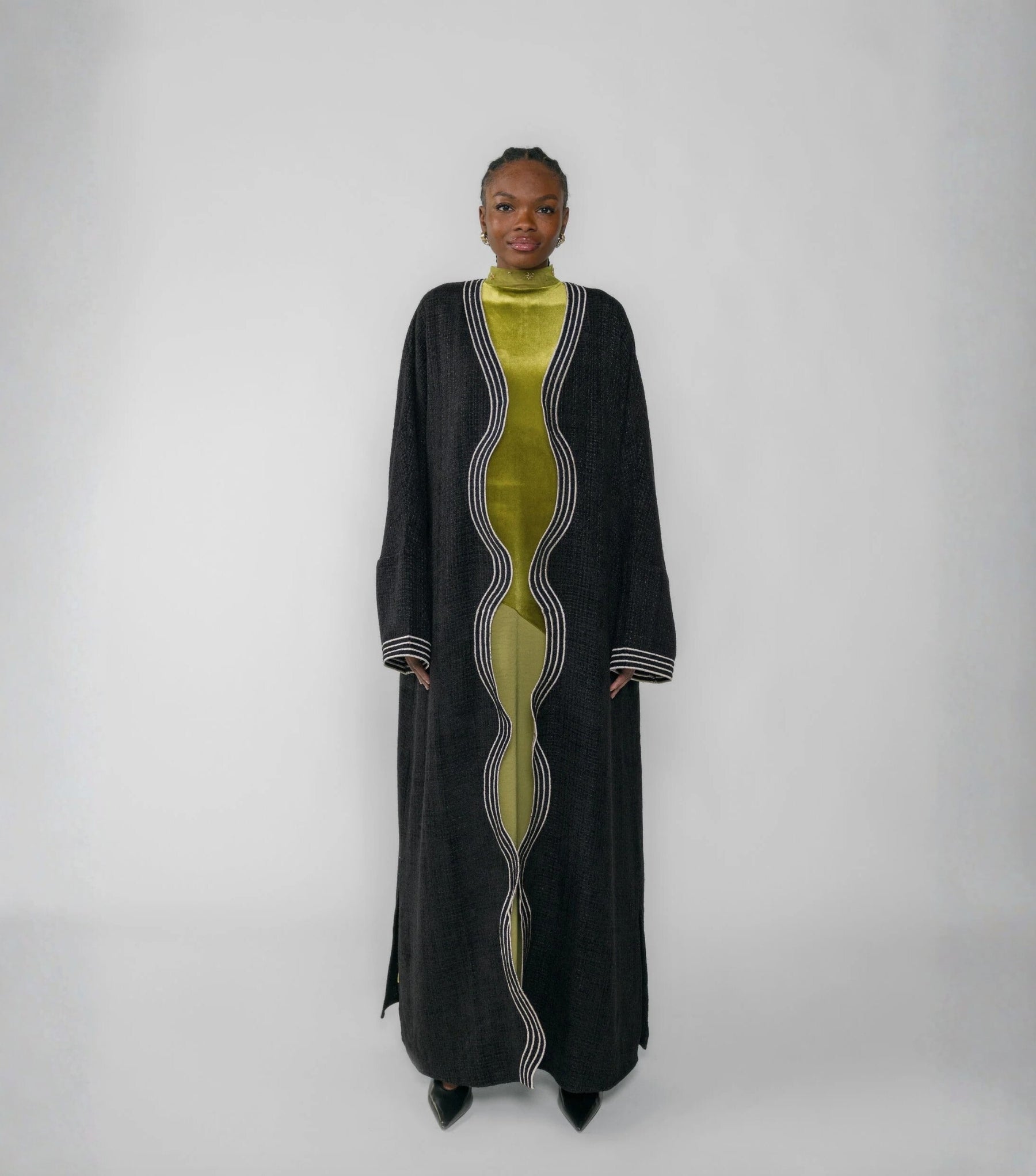 Person wearing a black abaya with white trim over a green top against a neutral background