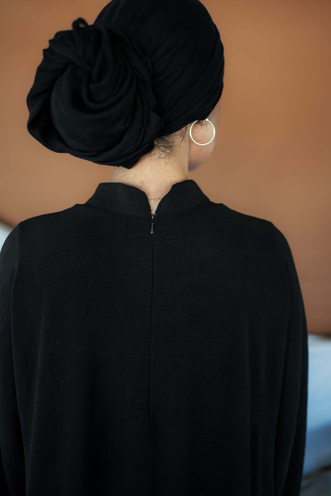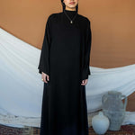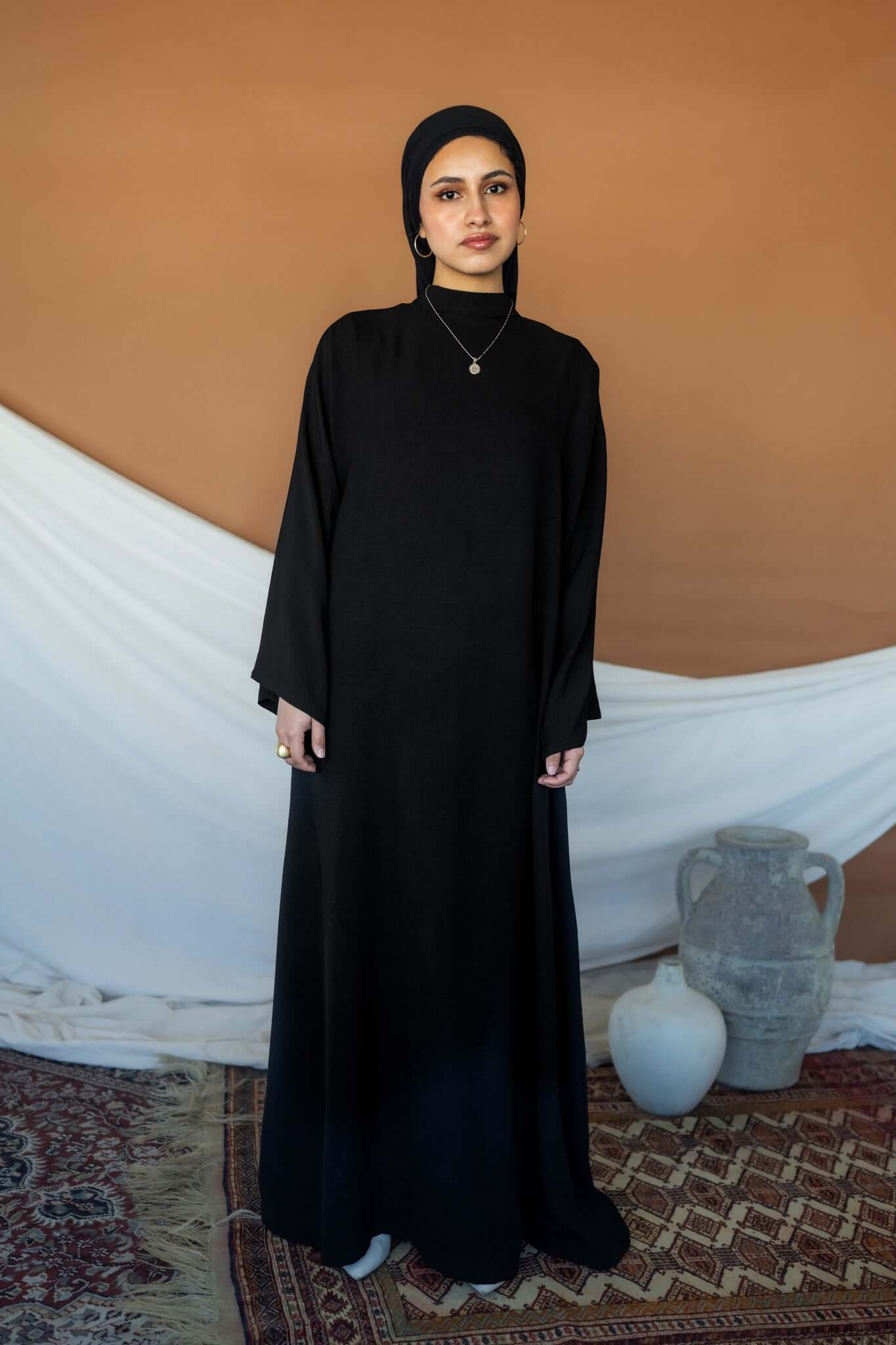 The perfect addition to your Ramadan wardrobe. With long sleeves and a modest mock neck you can wear this flattering black underdress alone or pair it with one of our abayas for an even more elevated look!