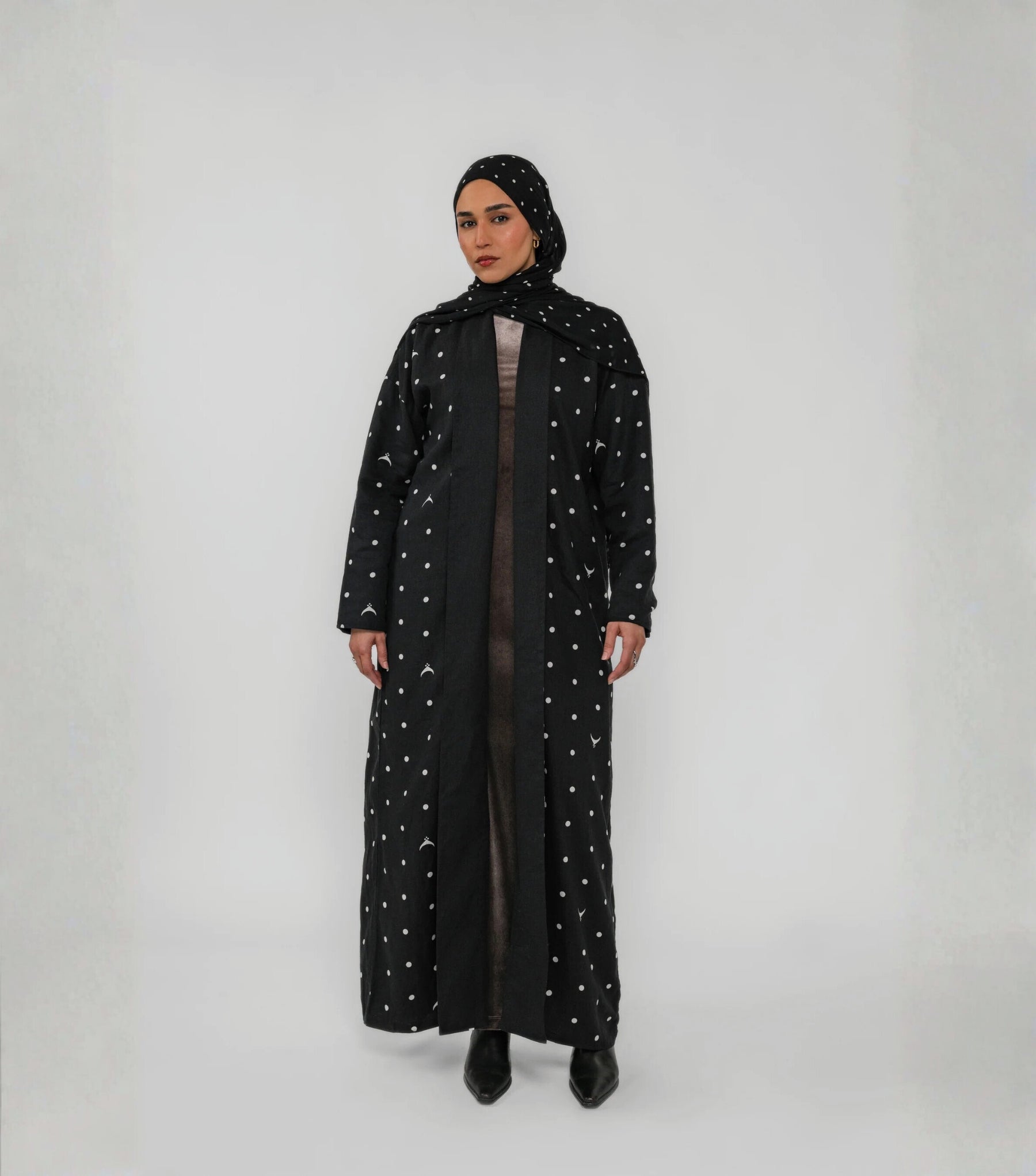 Woman wearing a black abaya with white polka dots on a gray background