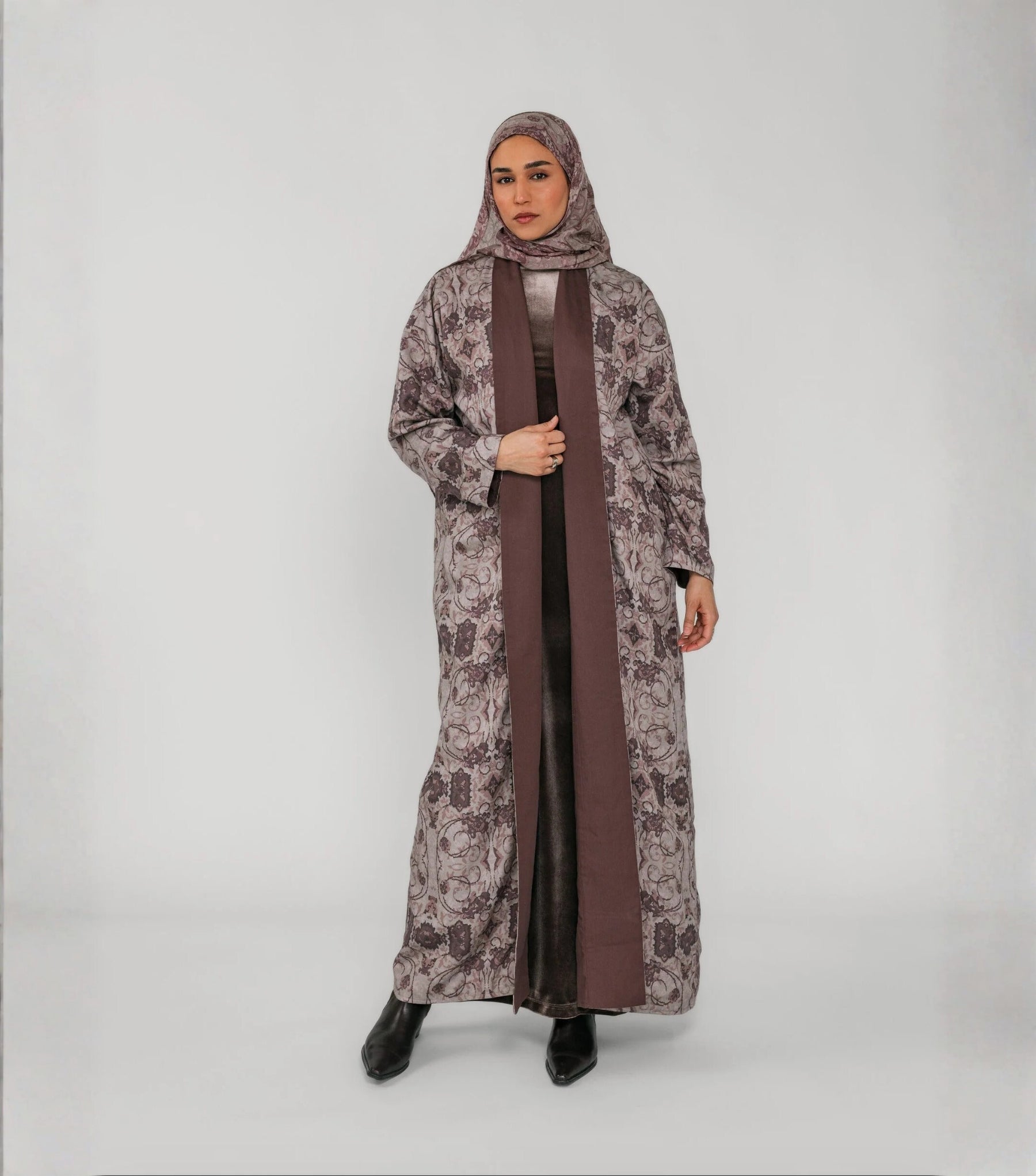 Woman wearing a brown abaya and patterned hijab on a gray background