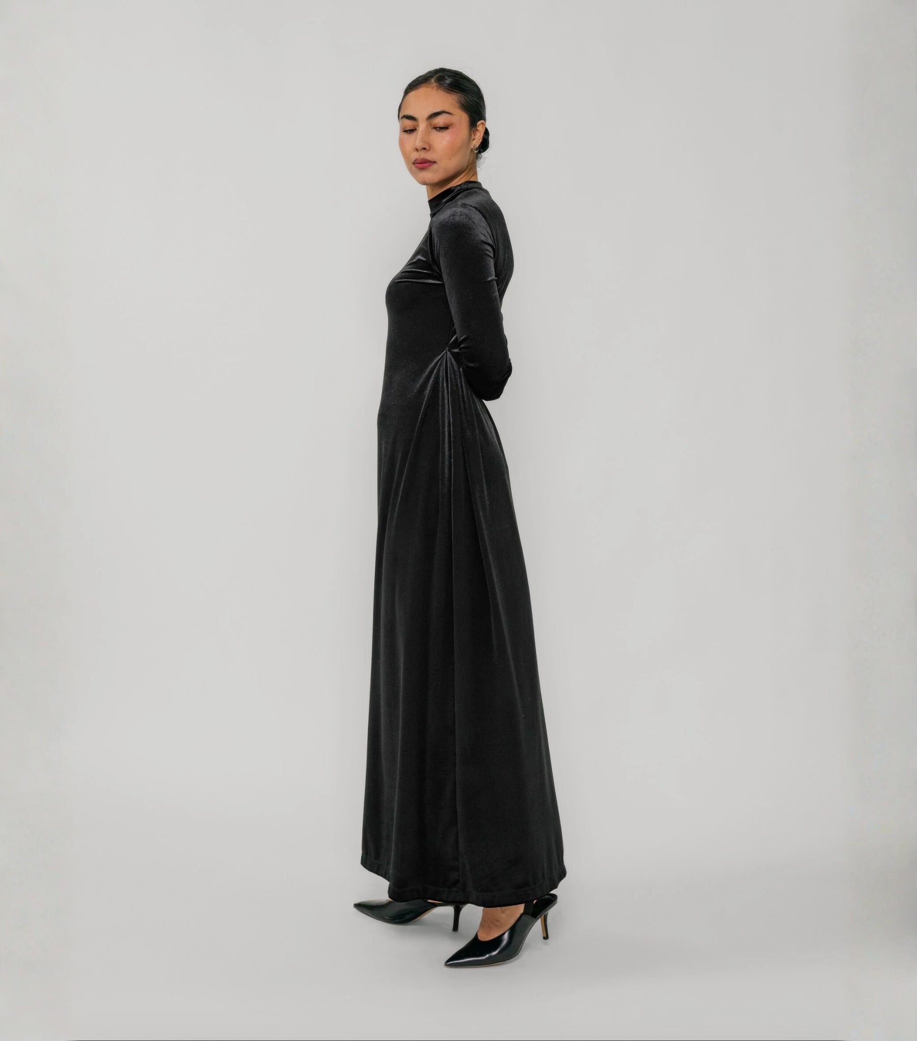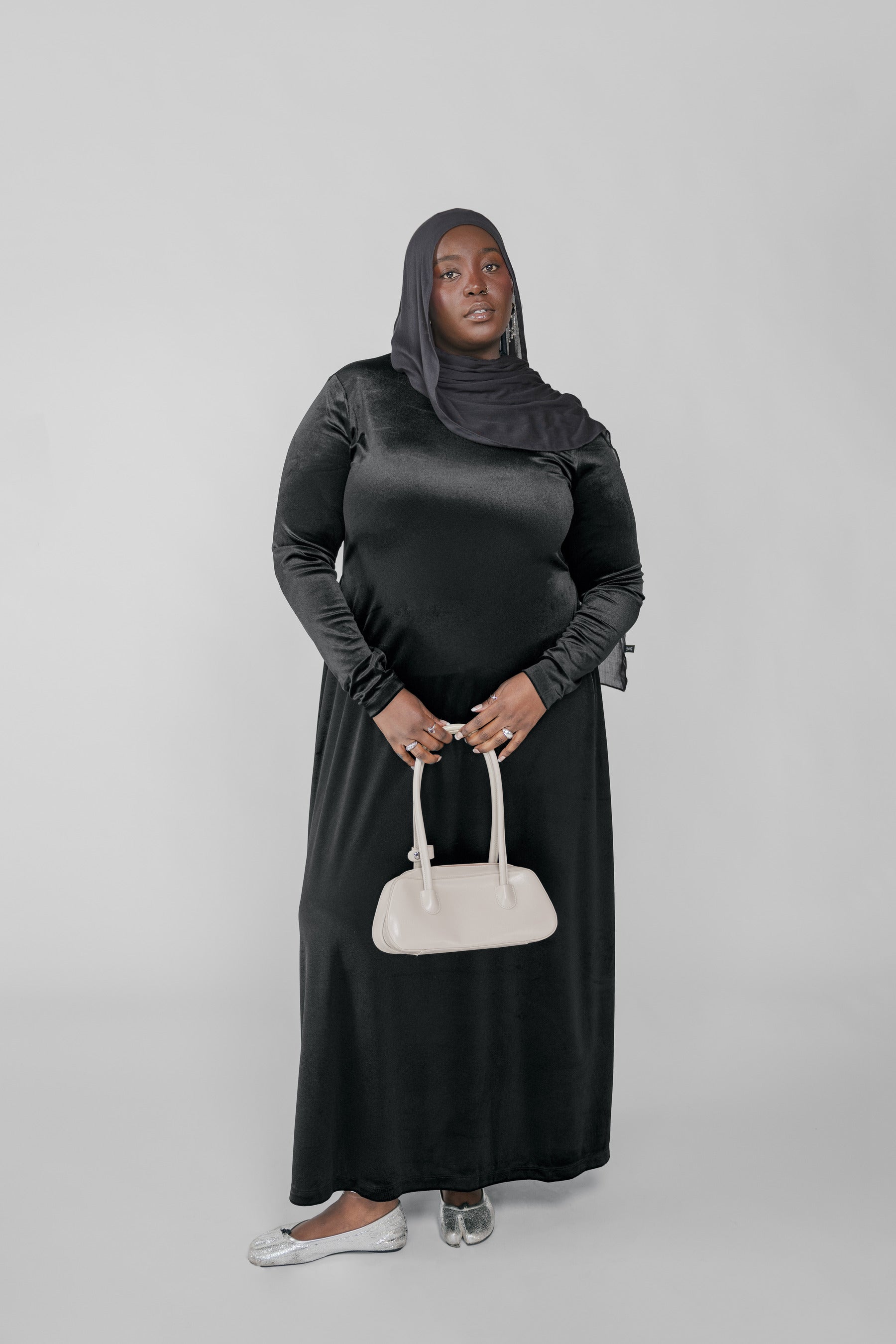 A timeless velvet essential designed for any occasion, the Velvet Dress offers a smooth, flattering drape with a soft hand feel. Wear it on its own for a clean, elevated look or layer it beneath abayas for added style and dimension during evening wear. Available in Black and Mink, in sizes XXS–3XL.