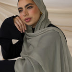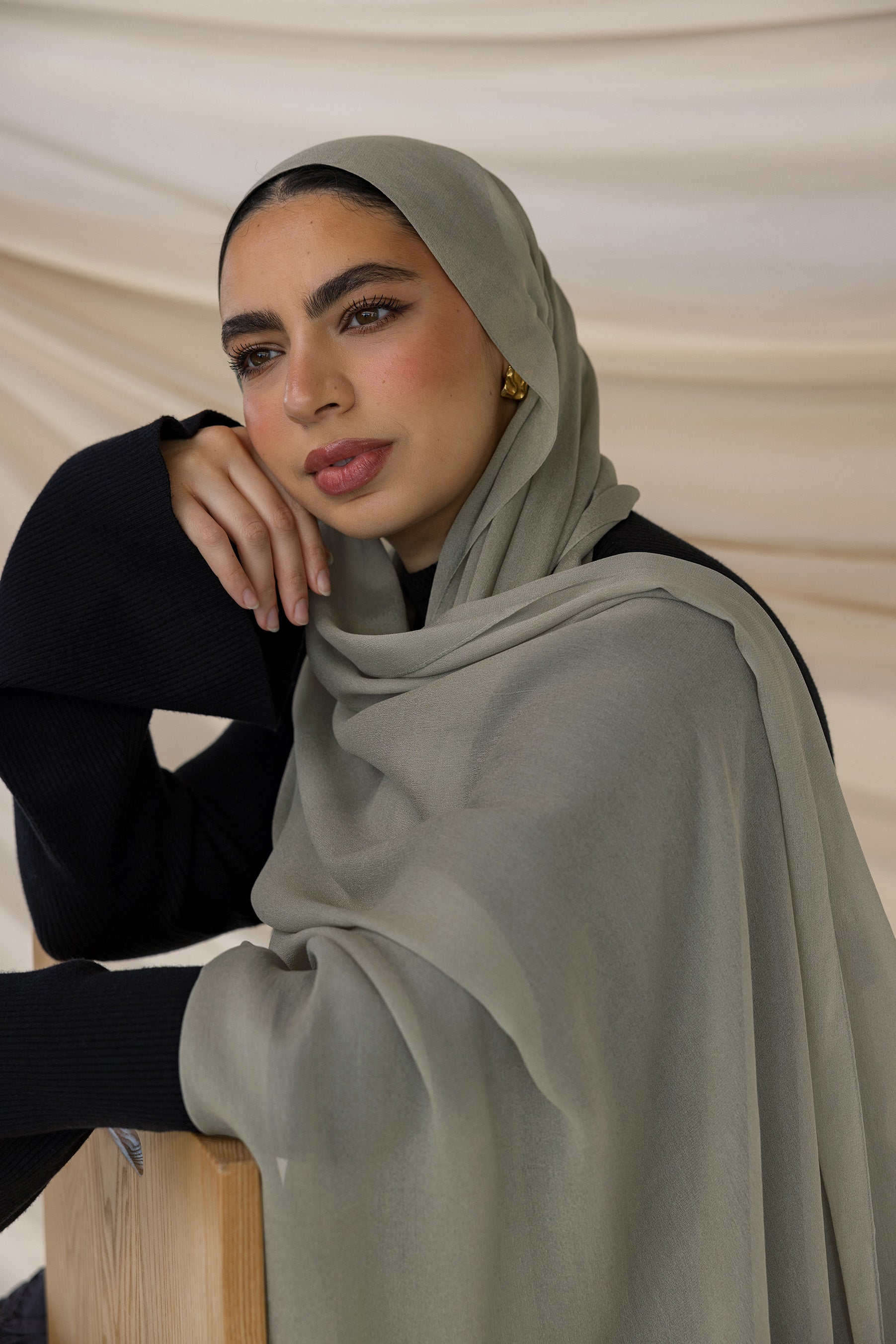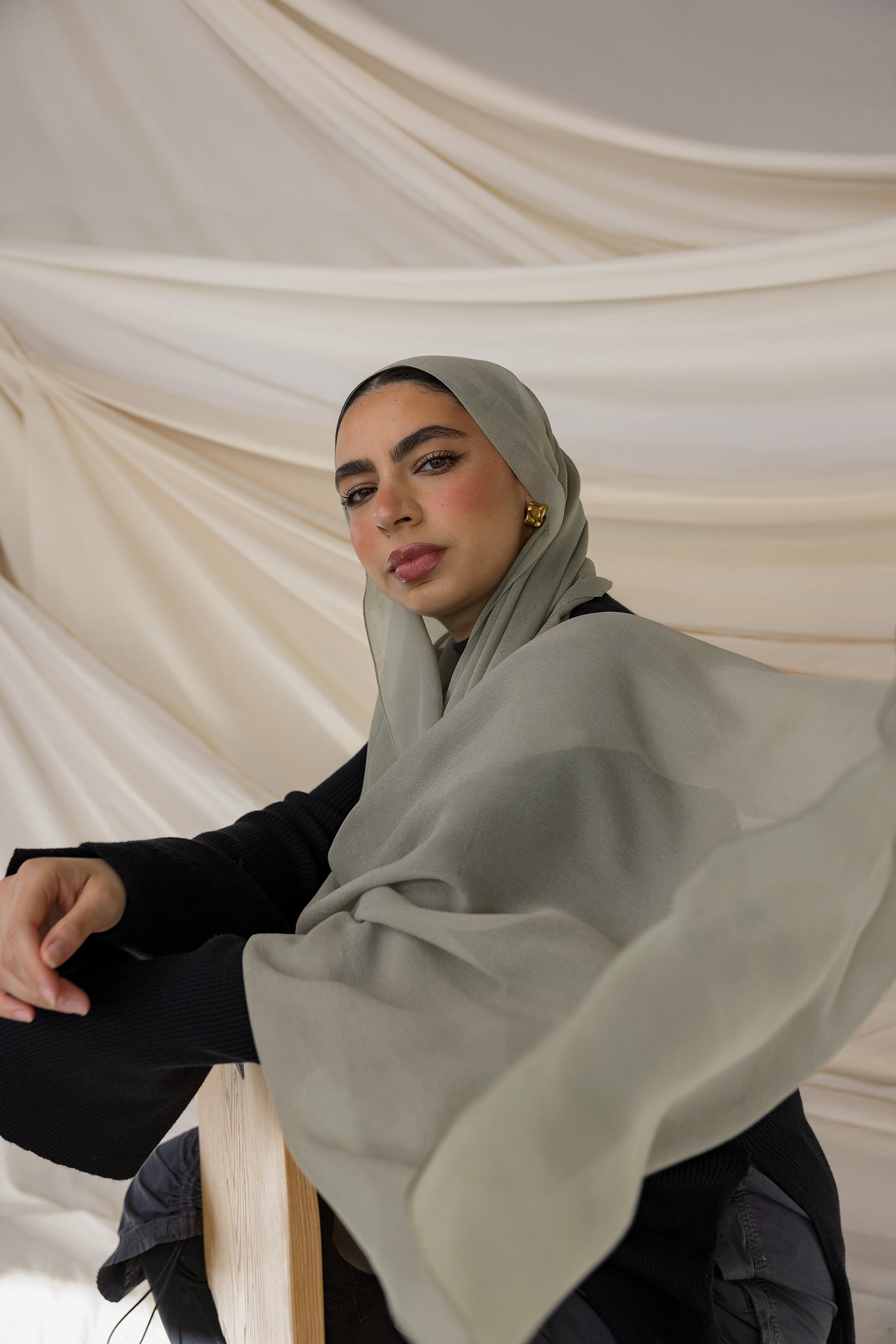 Inspired by the beauty of our classic Desert Sage, Cedar Mist Silk Chiffon Hijab is a cool-toned green with touches of greys that create a breath-taking hue. This hijab in 100% silk offers a sophisticated drape with a non-slip texture and a subtle shine, making it a seasonal essential. Perfect for any occasion, this Silk Chiffon Hijab combines elegance and comfort, making it a must-have in your Silk Hijabs collection. Elevate your style with this timeless Silk Chiffon Scarf.