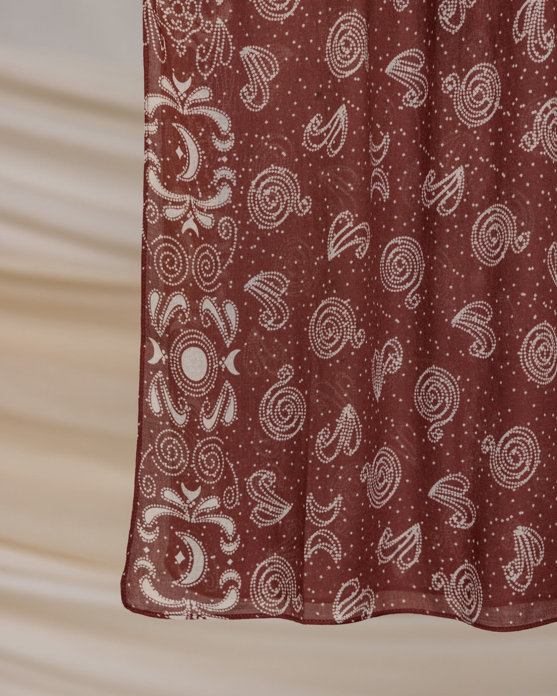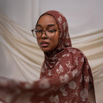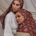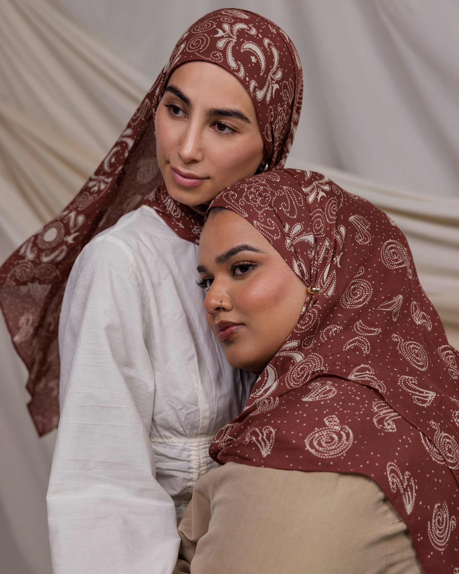 With earthy tones and swirling paisley motifs, this hijab embodies the warmth of Ramadan gatherings. The paisley motif, known as buta/boteh, has long been woven into the cultural fabric of Kashmir. With its curved, droplet-like form, the design merges elements of a floral spray and a cypress tree, symbols of life and eternity rooted in Persian influence. In Kashmir, this motif took on new life through the art of pashmina weaving, becoming a staple of intricate shawls and cultural heirlooms, passed down through generations and worn during life’s most meaningful moments.