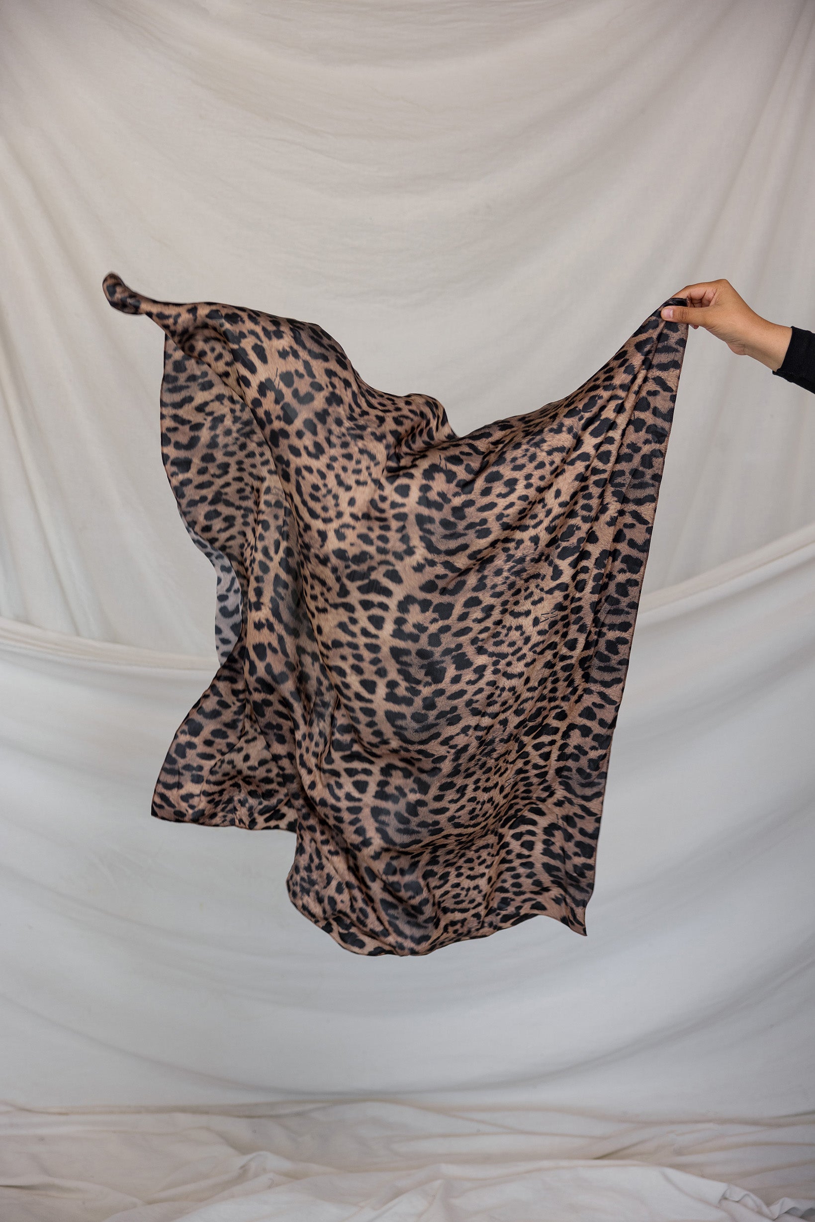 Model styled in a print silk hijab featuring leopard design.