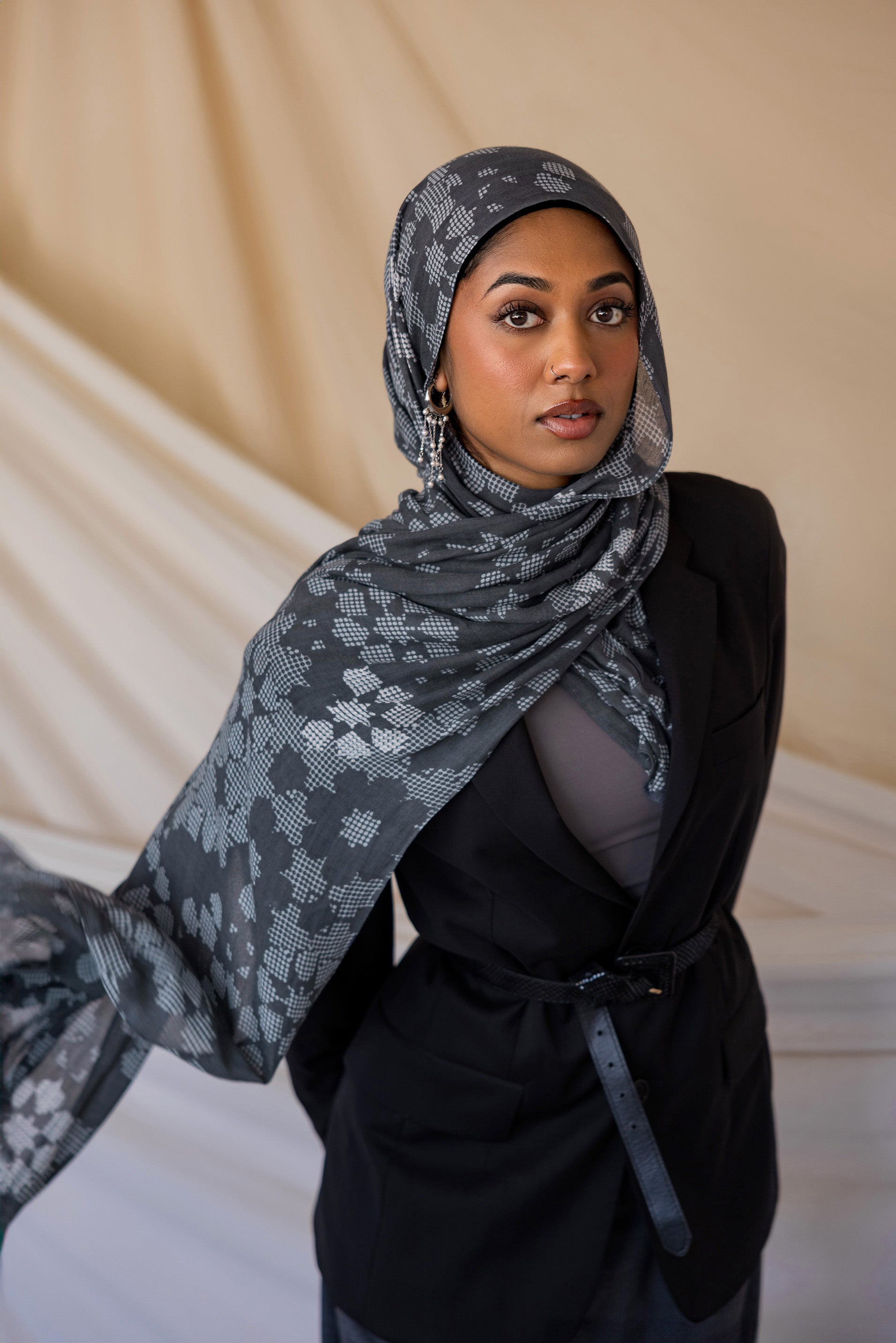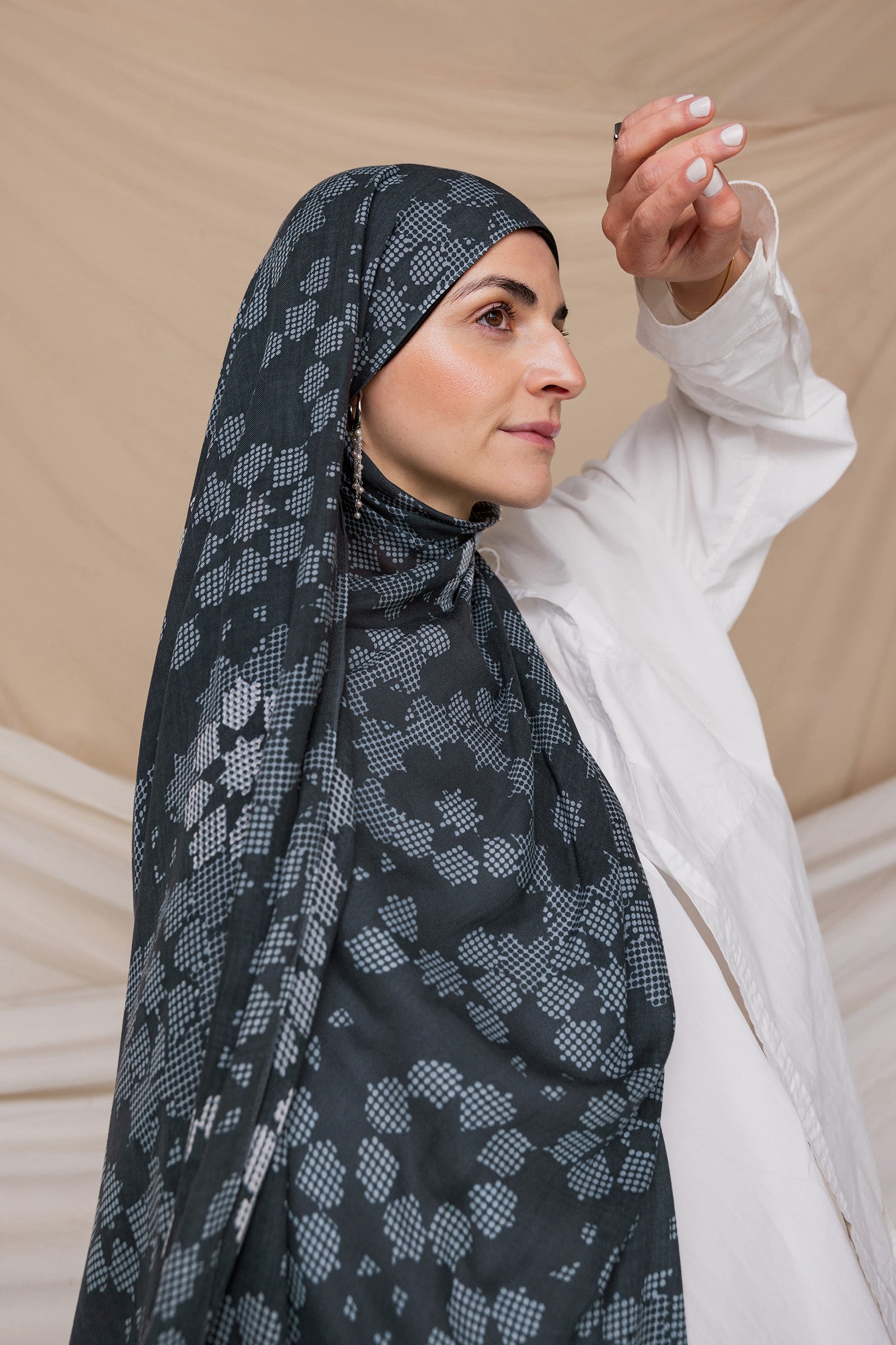 Stars elegantly twinkle across this classic navy hijab. Crafted in the softest modal fabric and with the Islamic year printed in Arabic, you’ll want to keep this hijab forever. Shop the Starry Mosaic hijab online and explore the VELA double hijab for a touch of sophistication.