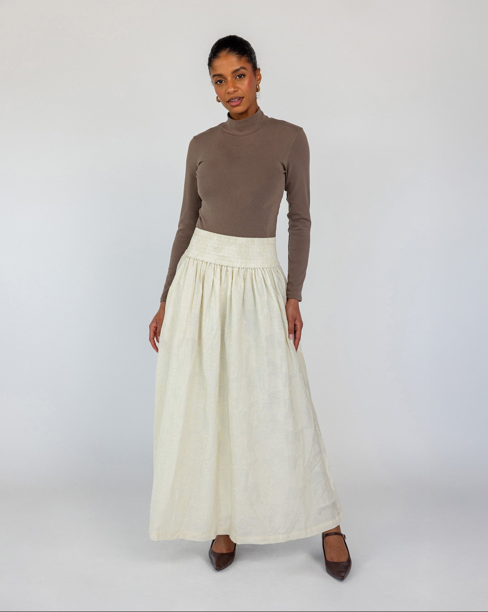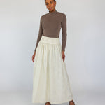 Full-length cream skirt with woven texture, designed for modest and easy styling.