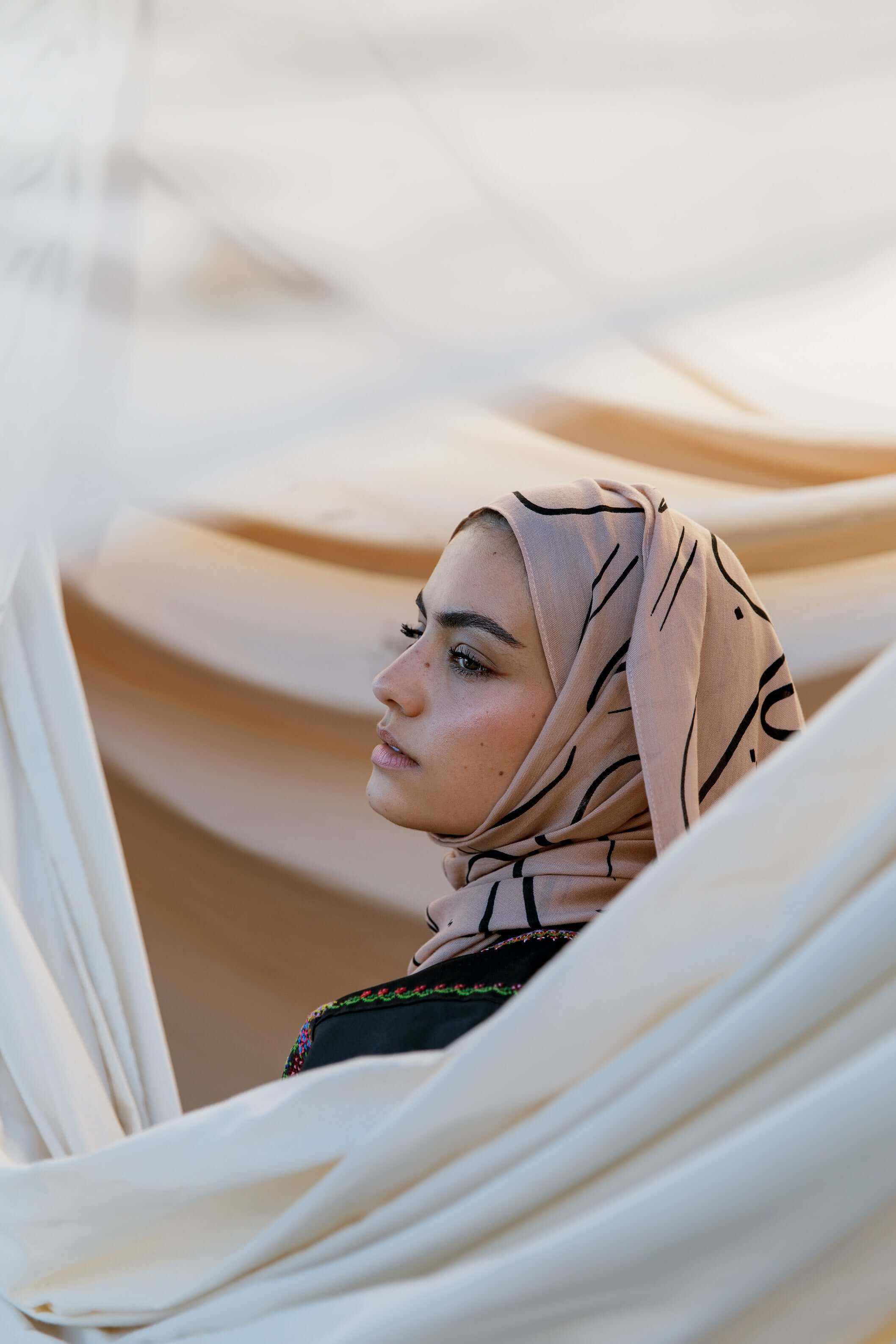 I came to know love the moment I found Your love” - Sufi mystic Rabia al Basri poetically speaks of her love for Allah (swt). Her heartfelt poetry is rendered in flowing black Arabic script against a light latte backdrop. Woven in the softest modal fabric, this nude hijab is a must-have addition to your collection of scarves and woven hijabs, exclusively curated by Vela. Discover the Divine Love hijab online and experience its elegant beauty in every style.