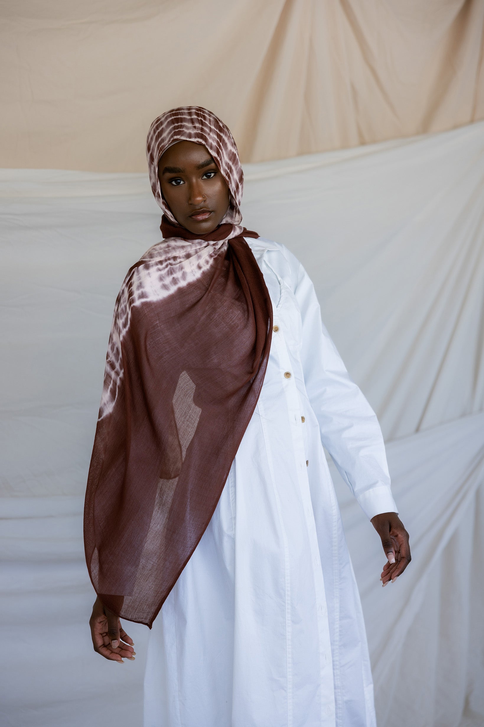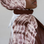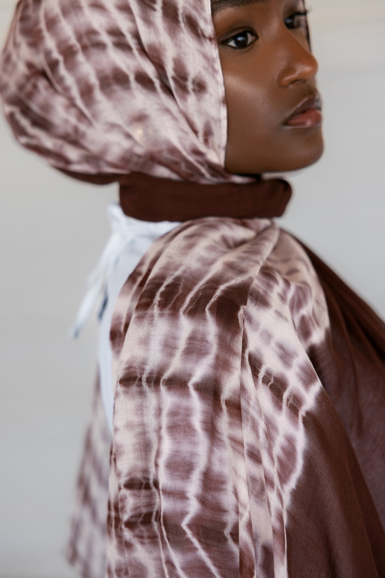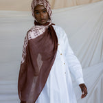 Dark coffee brown ripples with swirling milk to create this one of a kind hijab. Tied and dyed by hand, this hijab adds a subtle twist to any look while still being timelessly neutral.