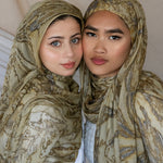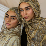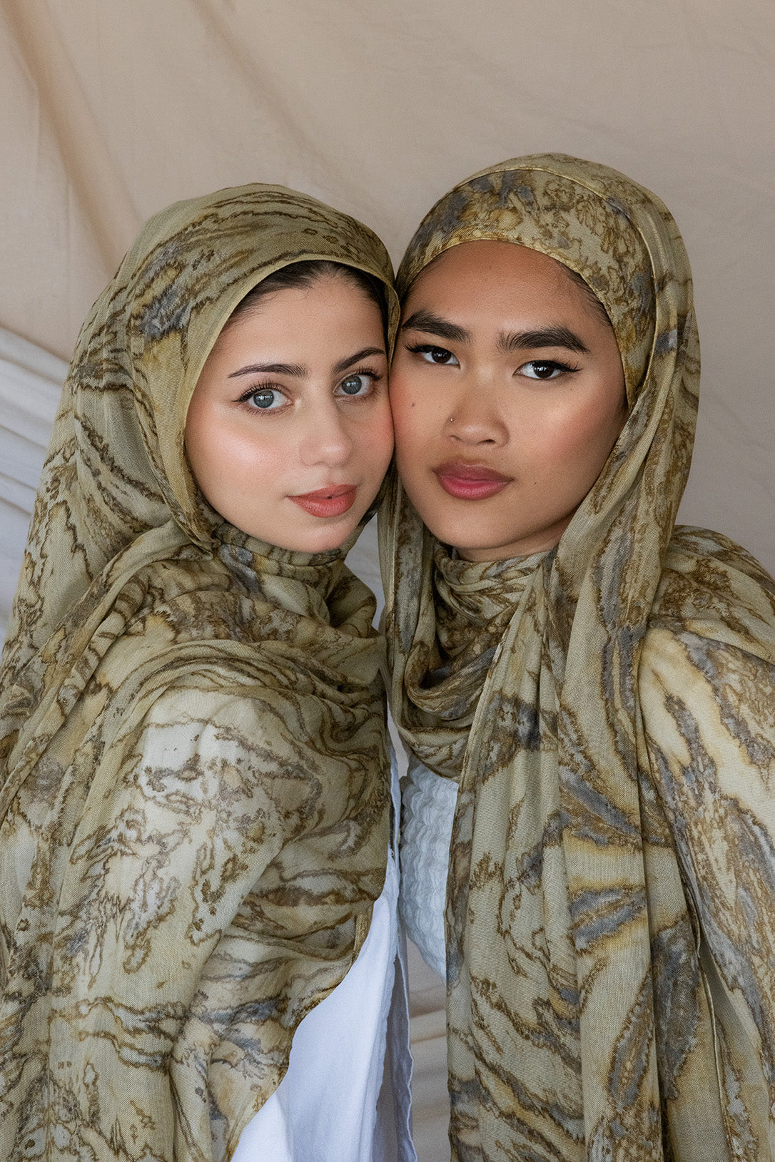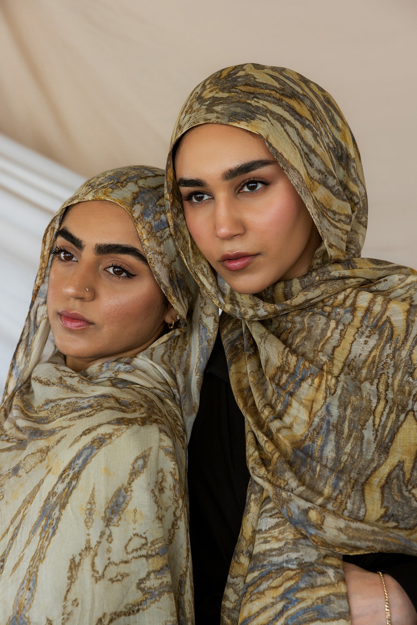 Shades of light olive, grey, and sand intermingle to create this entrancing, one-of-a-kind Sand Dunes hijab. Artisans tie and dye each hijab by hand, creating a unique print for every piece. Please expect color variations. Due to the individual crafting process and distinct tie-dye technique used for each piece, every Sand Dunes hijab showcases a one-of-a-kind print and color combination, ensuring that no two pieces are alike. VELAs are uniquely crafted in batches; variations are expected.