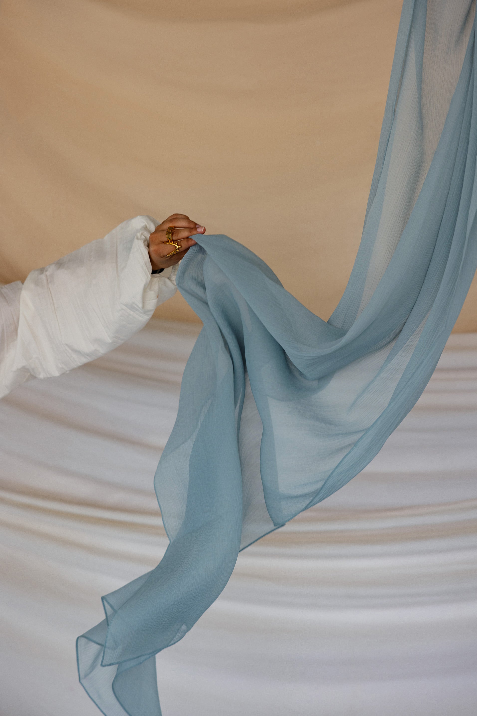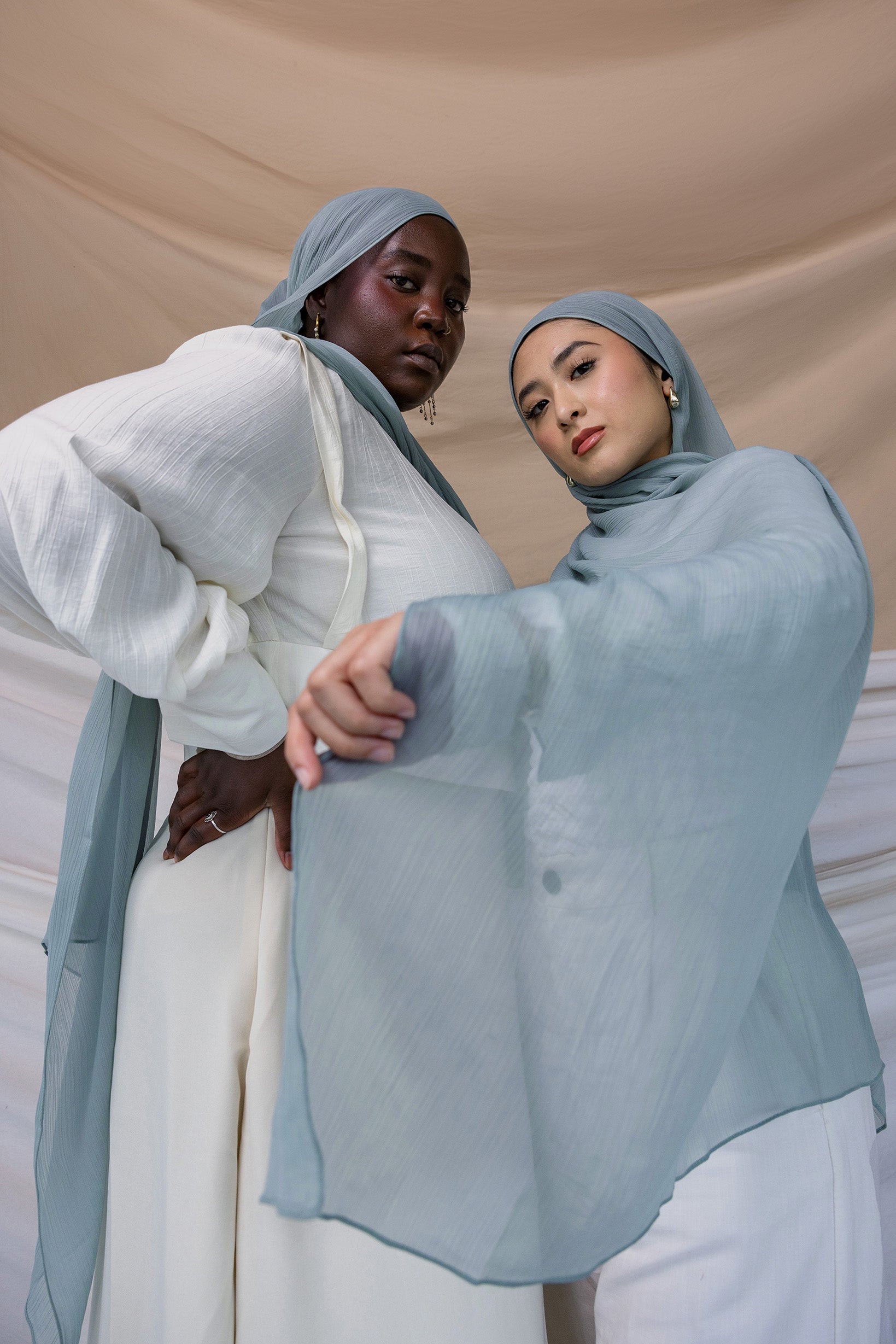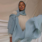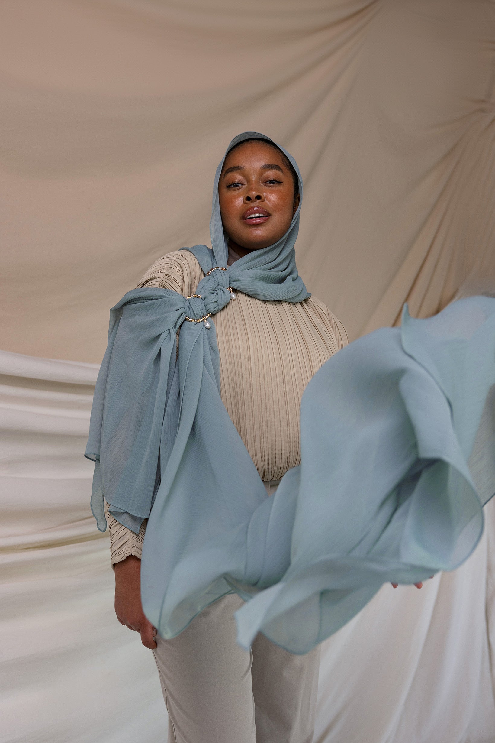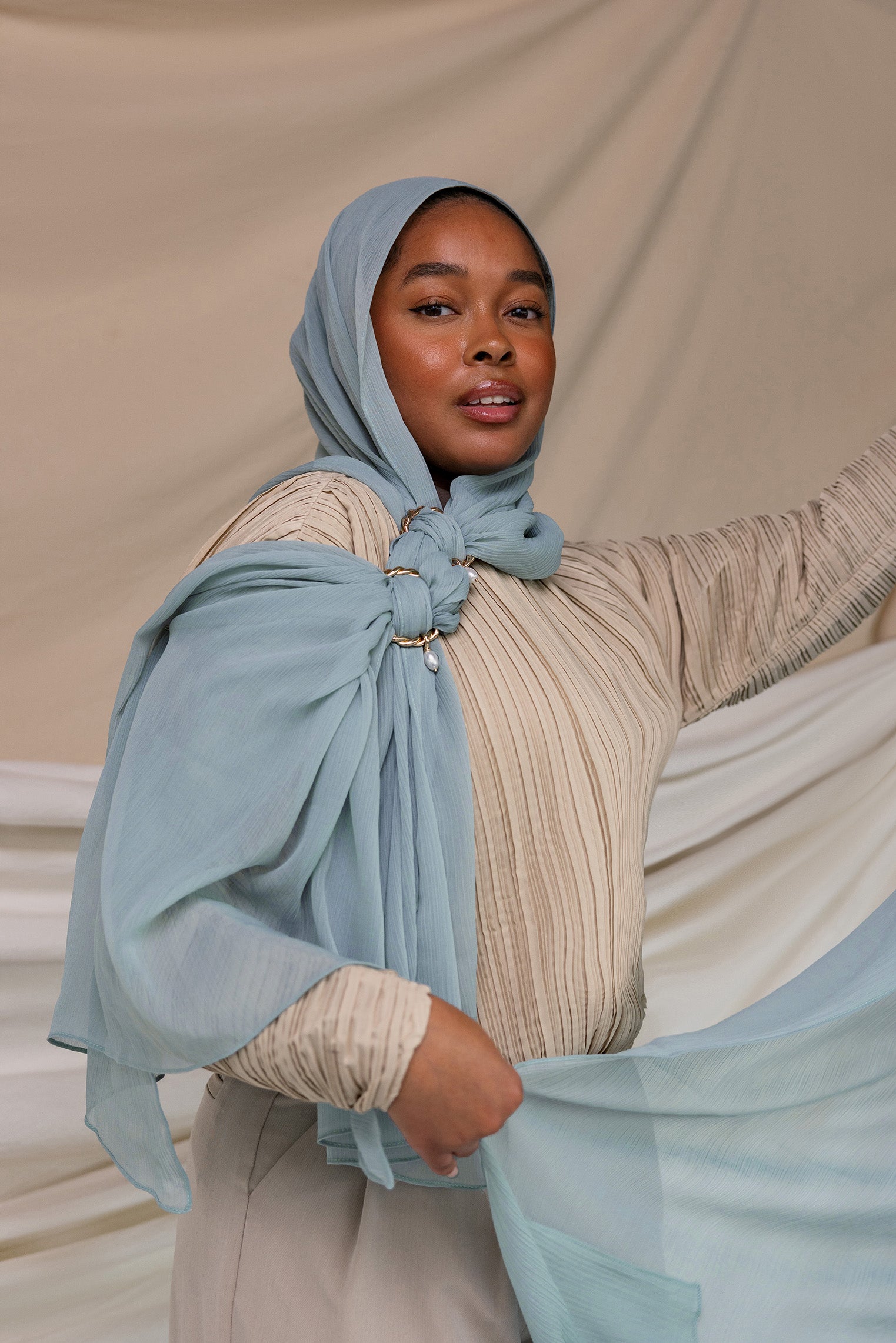 Dive into the serenity of Blue Opal. This soft, cool blue crinkle chiffon is reminiscent of tranquil waters. Lightweight and no-slip, this hijab offers a calm, polished finish that’s perfect for any occasion. Experience the ultimate in comfort and elegance with this soothing, sophisticated shade. Shop Blue Opal Crinkle Chiffon Hijab online for a crinkle chiffon hijab that blends beauty and ease.
