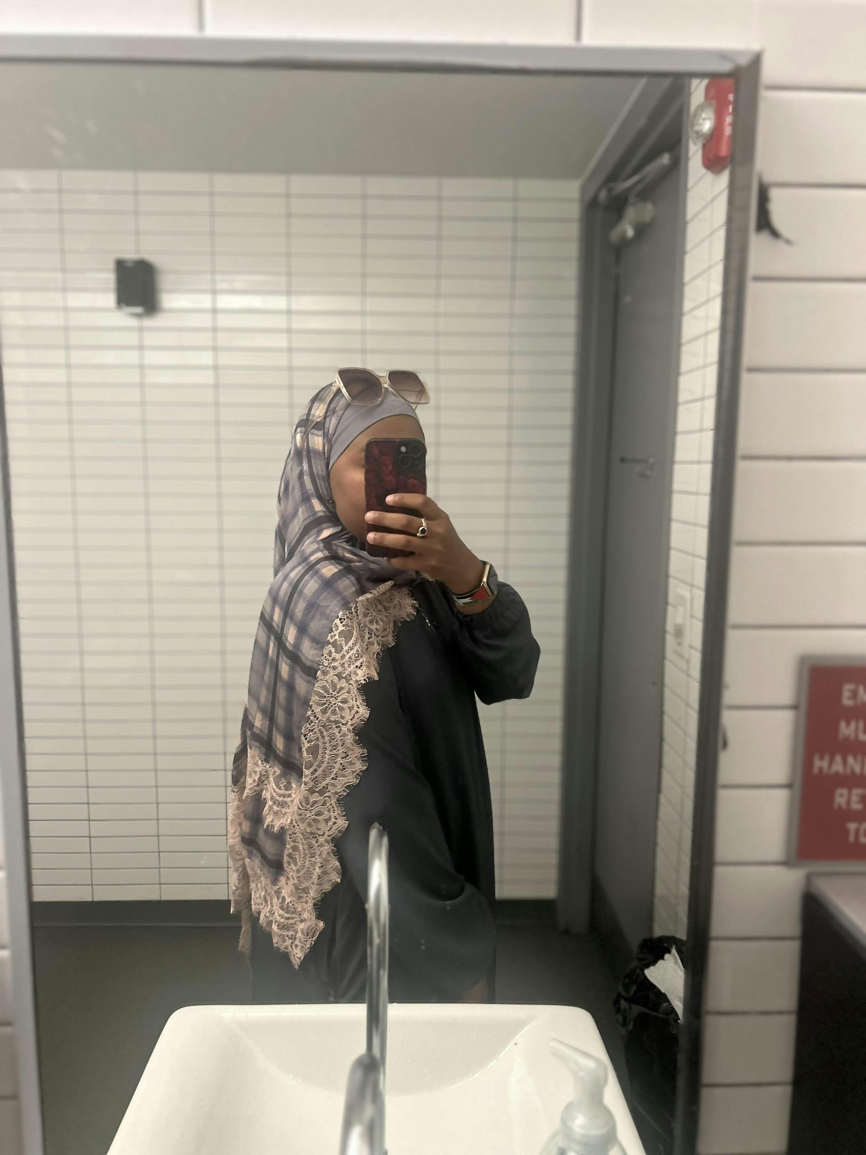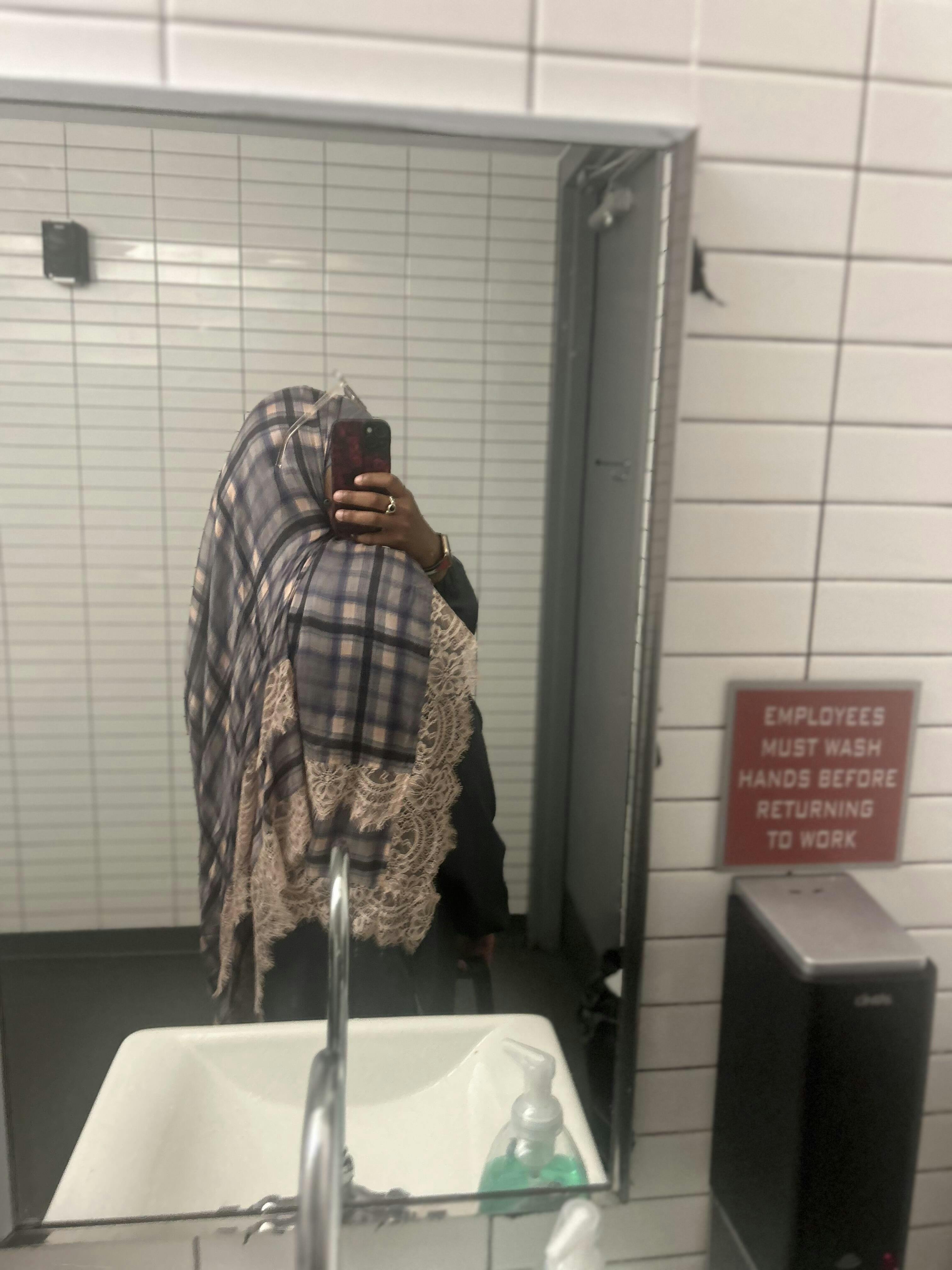 Woman wearing a plaid hijab with pink lace over a blue top and gray pants against a beige curtain background