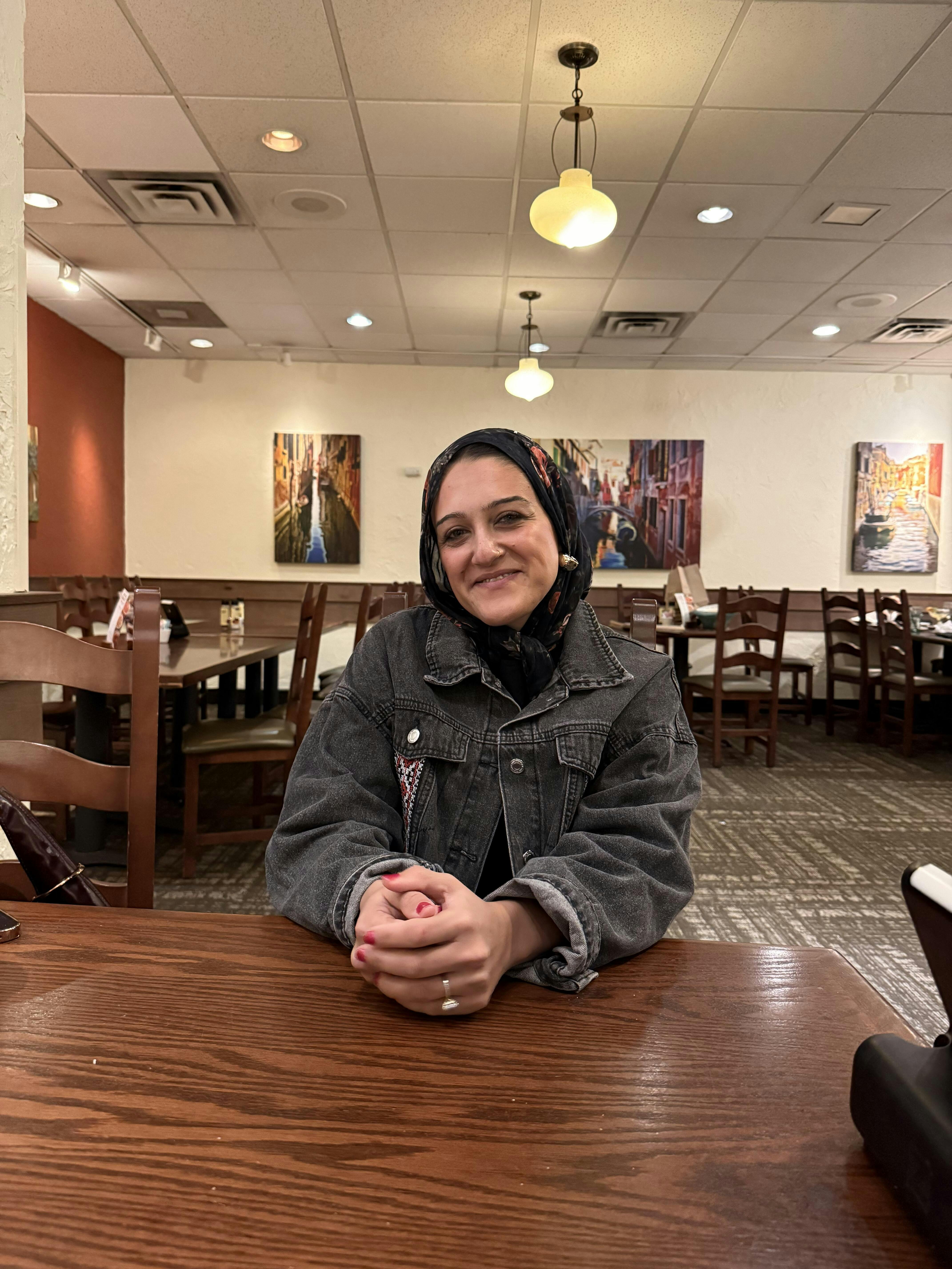Woman wearing a black pomegranate hijab against a plain background