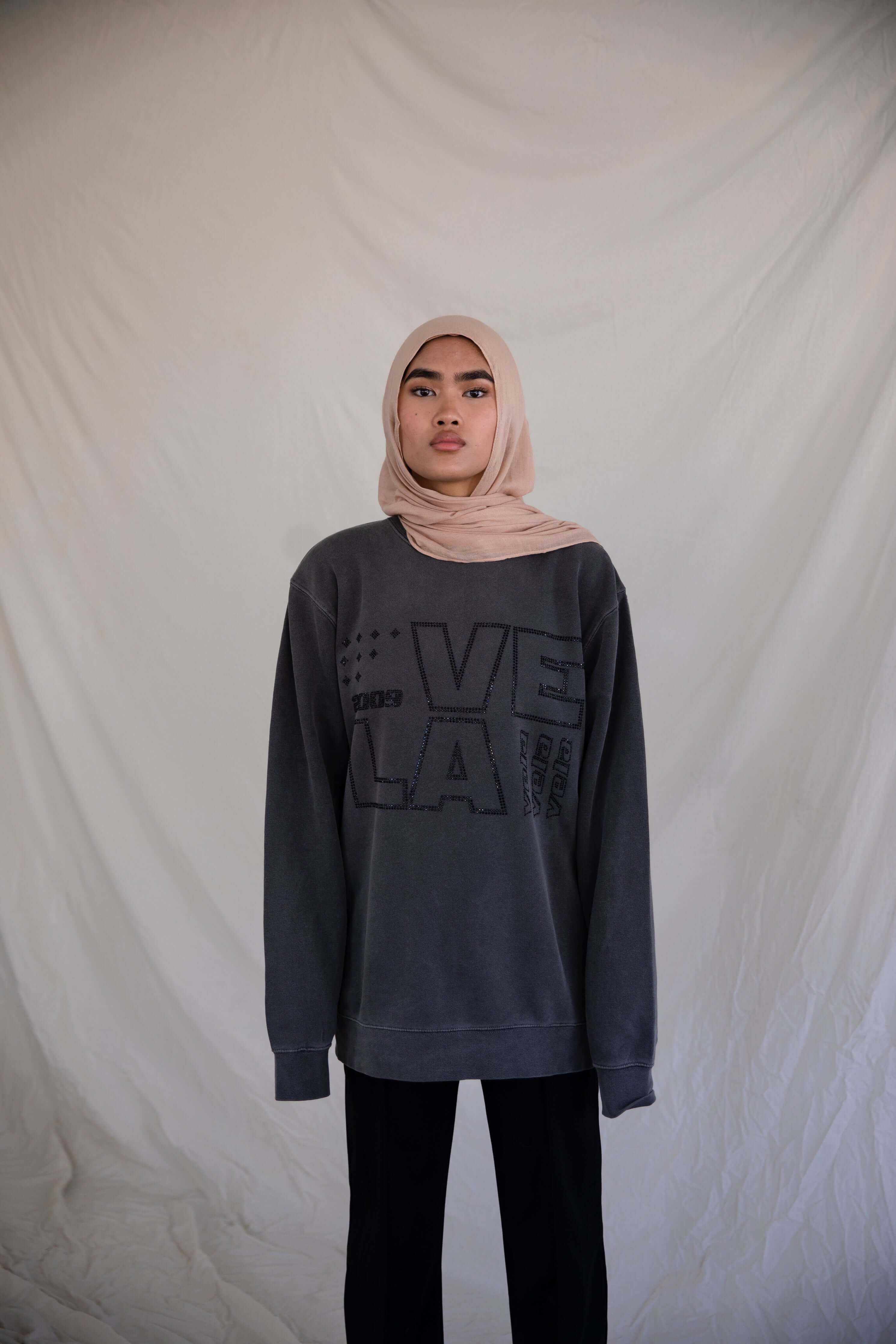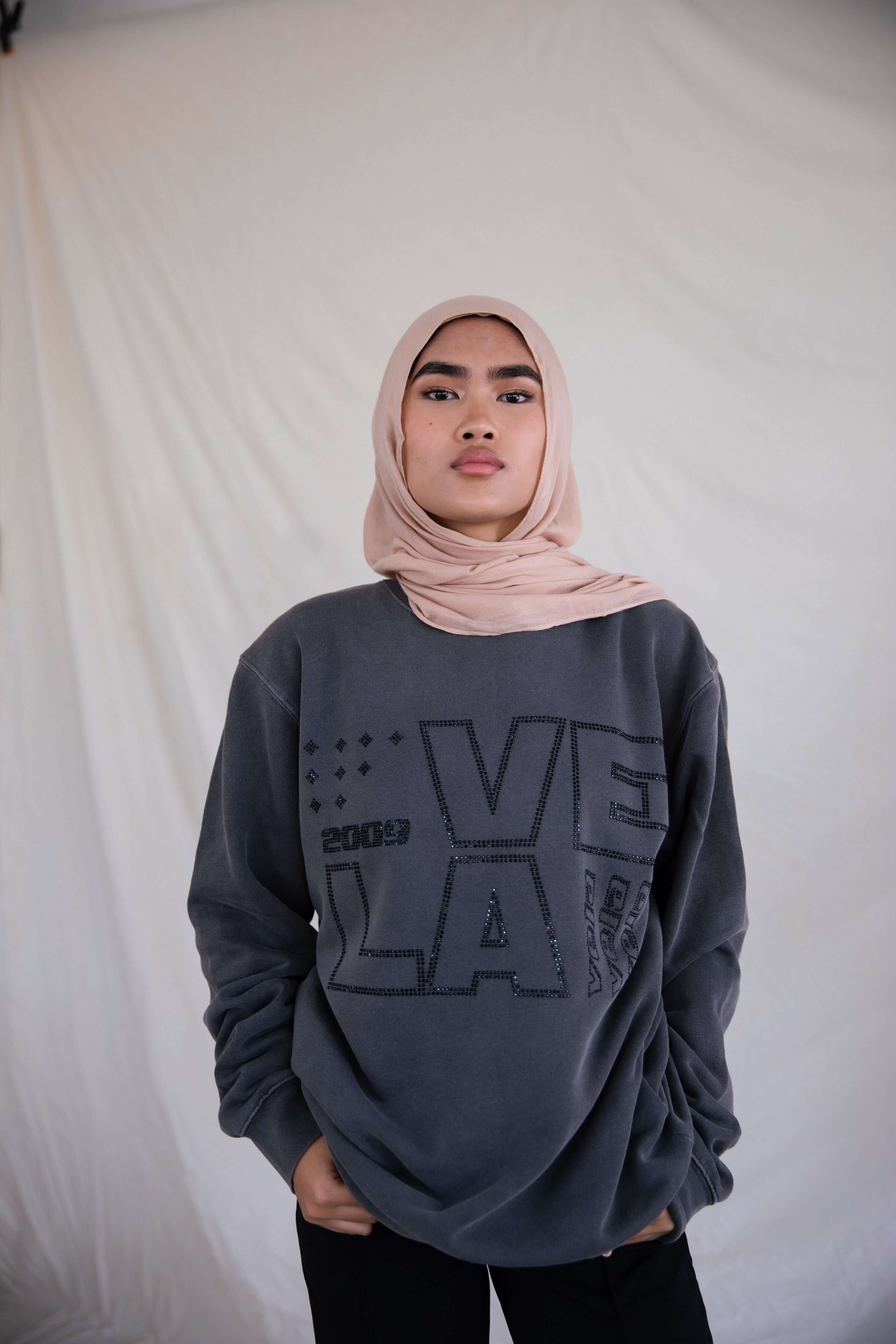 Bring back those ‘09 vibes with this iconic Vela crewneck. Shine bright like a rhinestone on gorgeous stone grey fabric.