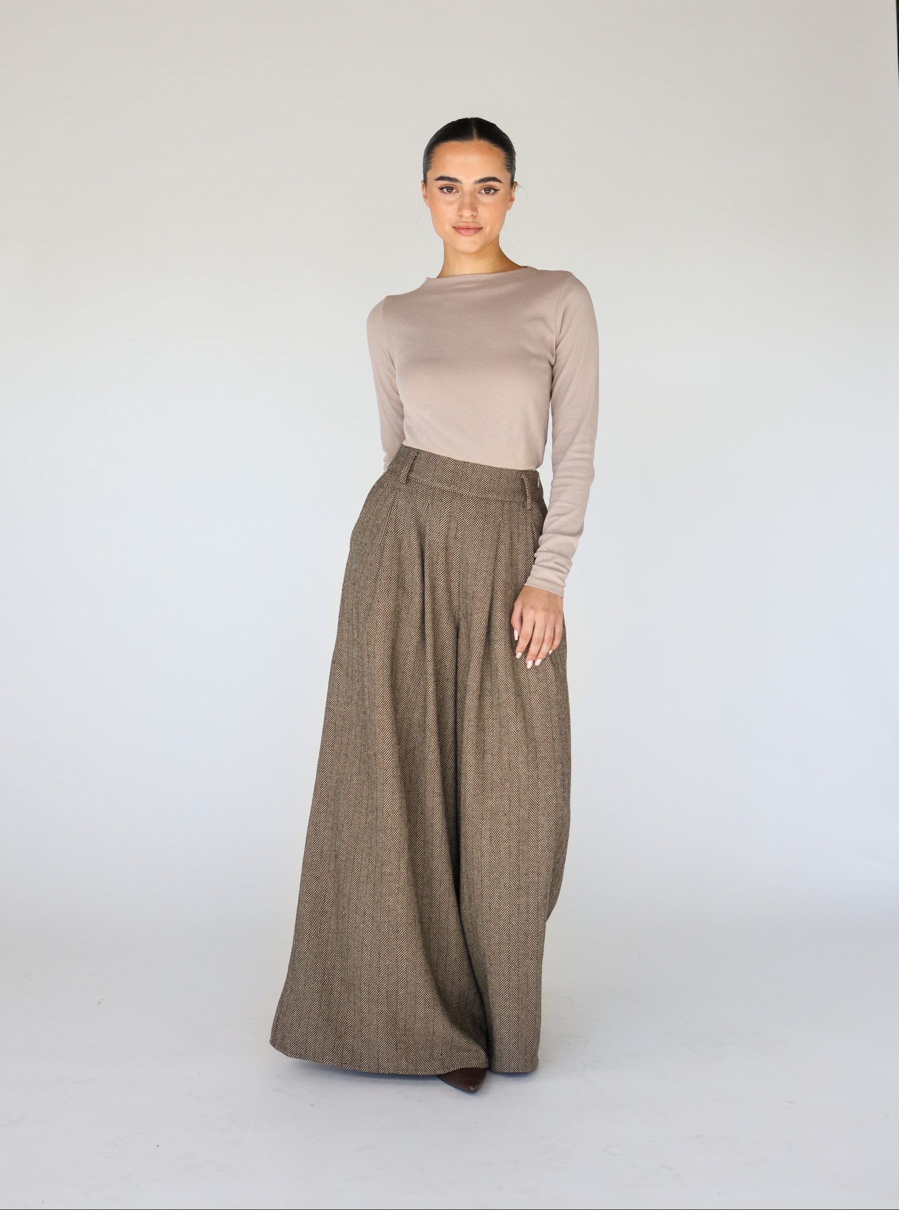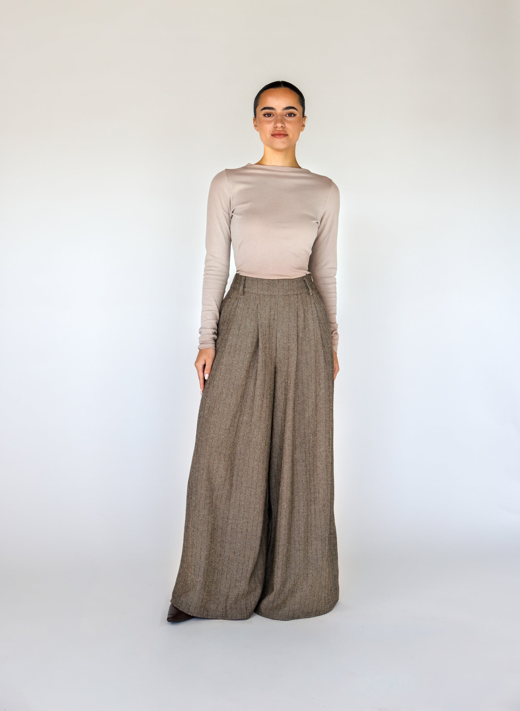 Wide-leg elegance with a textured herringbone weave, designed for effortless layering. Woven from herringbone/twill, these pants offer structure without restricting movement. Available in Brown and Charcoal in sizes XS–3XL. Pair with the matching Sculpted Button Up. These Herringbone Palazzo Pant Brown are women’s brown palazzo trousers, designed as elegant herringbone wide leg pants and brown high waisted palazzo pants for a polished, versatile look.