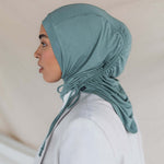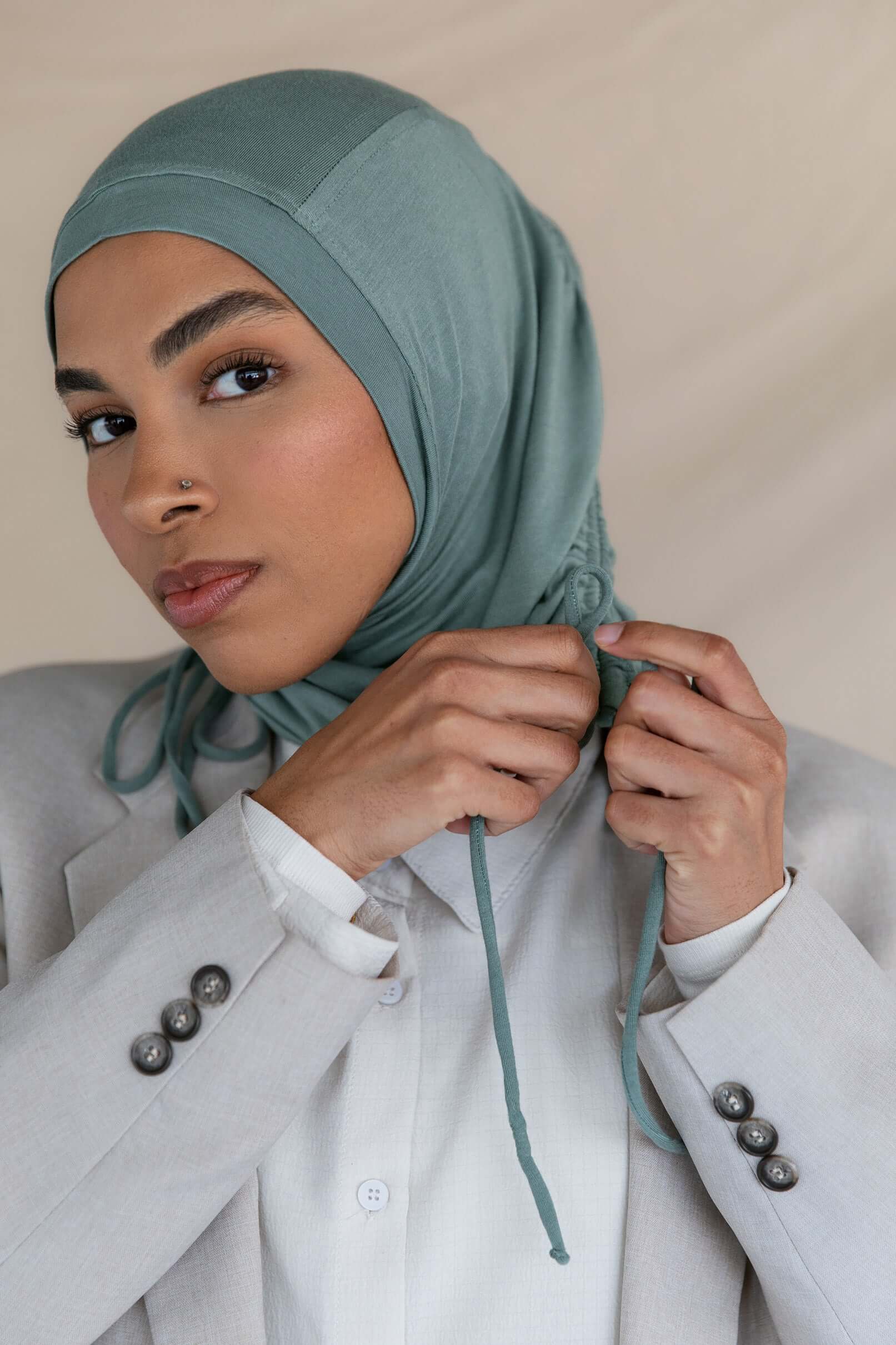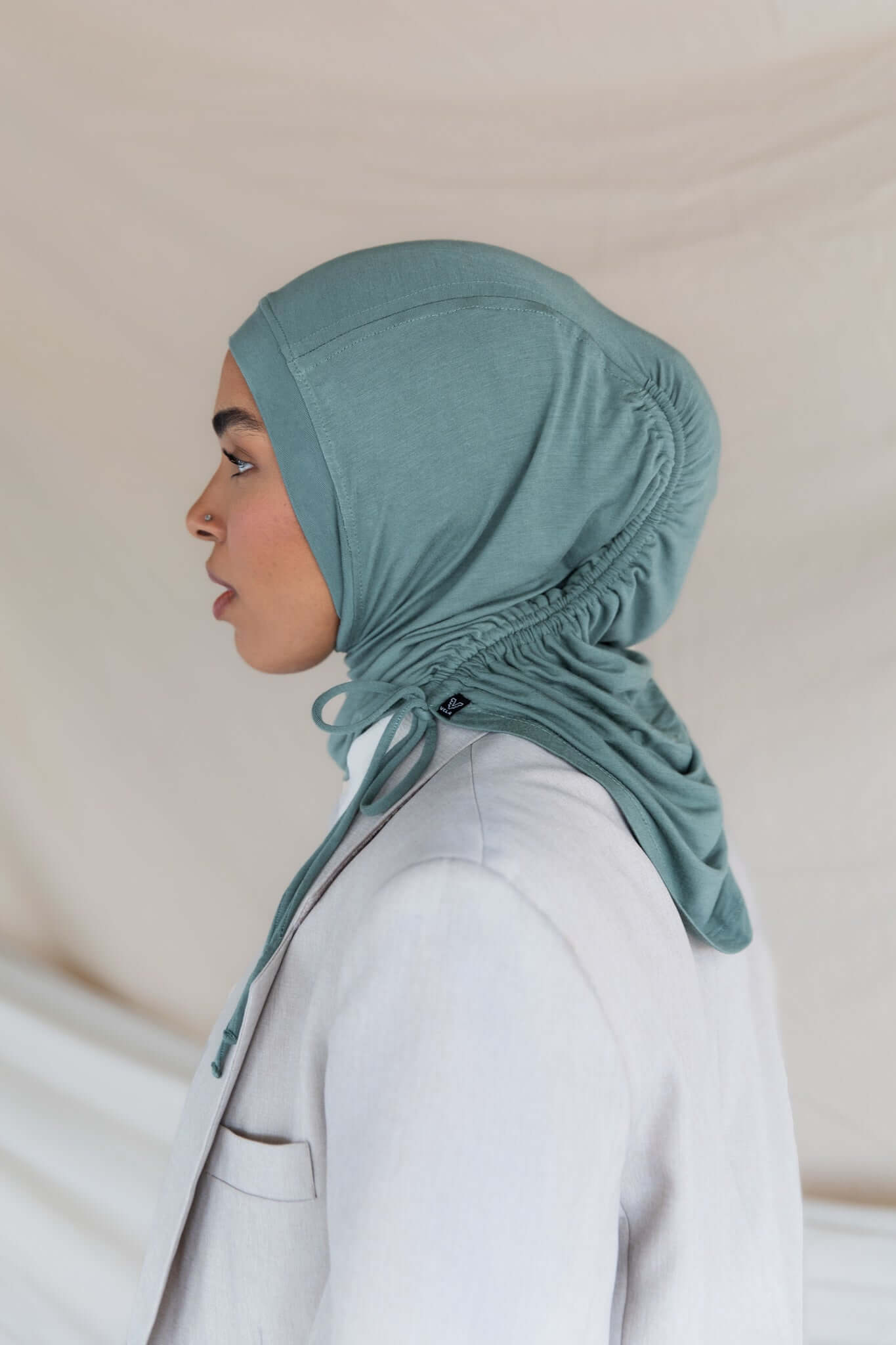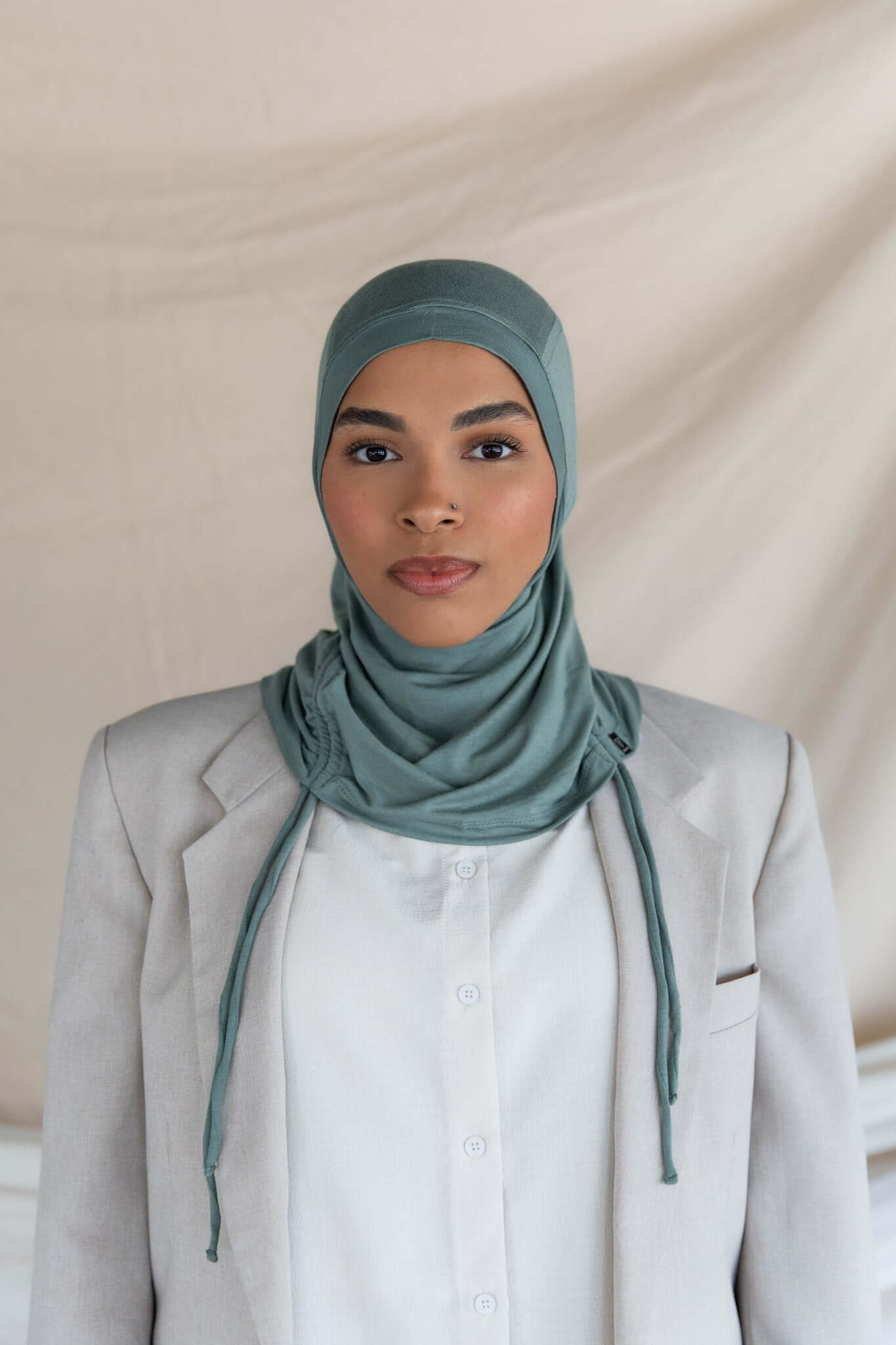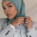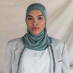 Instantly look put together in serene mineral green. Crafted with breathable jersey-modal fabric that’s wrinkle resistant. This soft ivy green hijab features a green gathered ruching design for a beautifully textured finish.