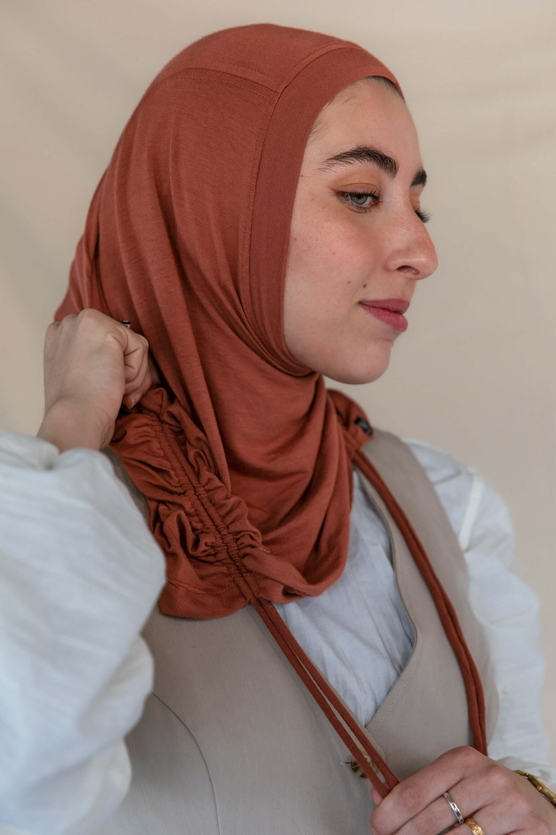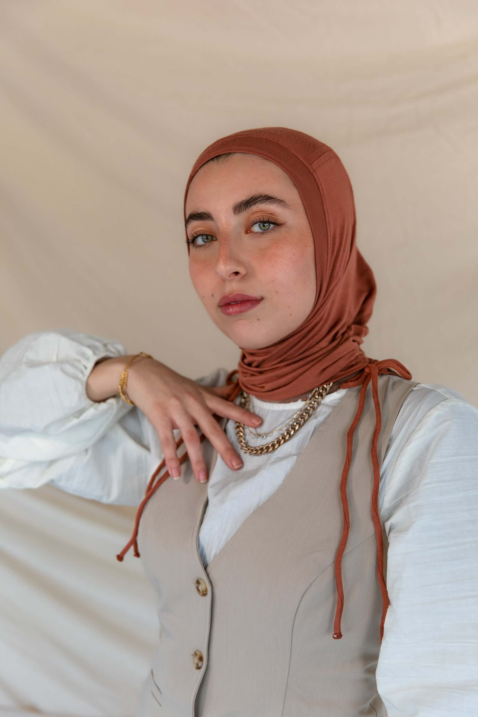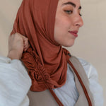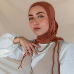 This warm terracotta brown hijab is the perfect one-and-done choice. Woven in the softest jersey-modal for effortless comfort. Featuring a breathable brown ruching design, this soft cinnabark hijab adds a touch of texture and elegance.