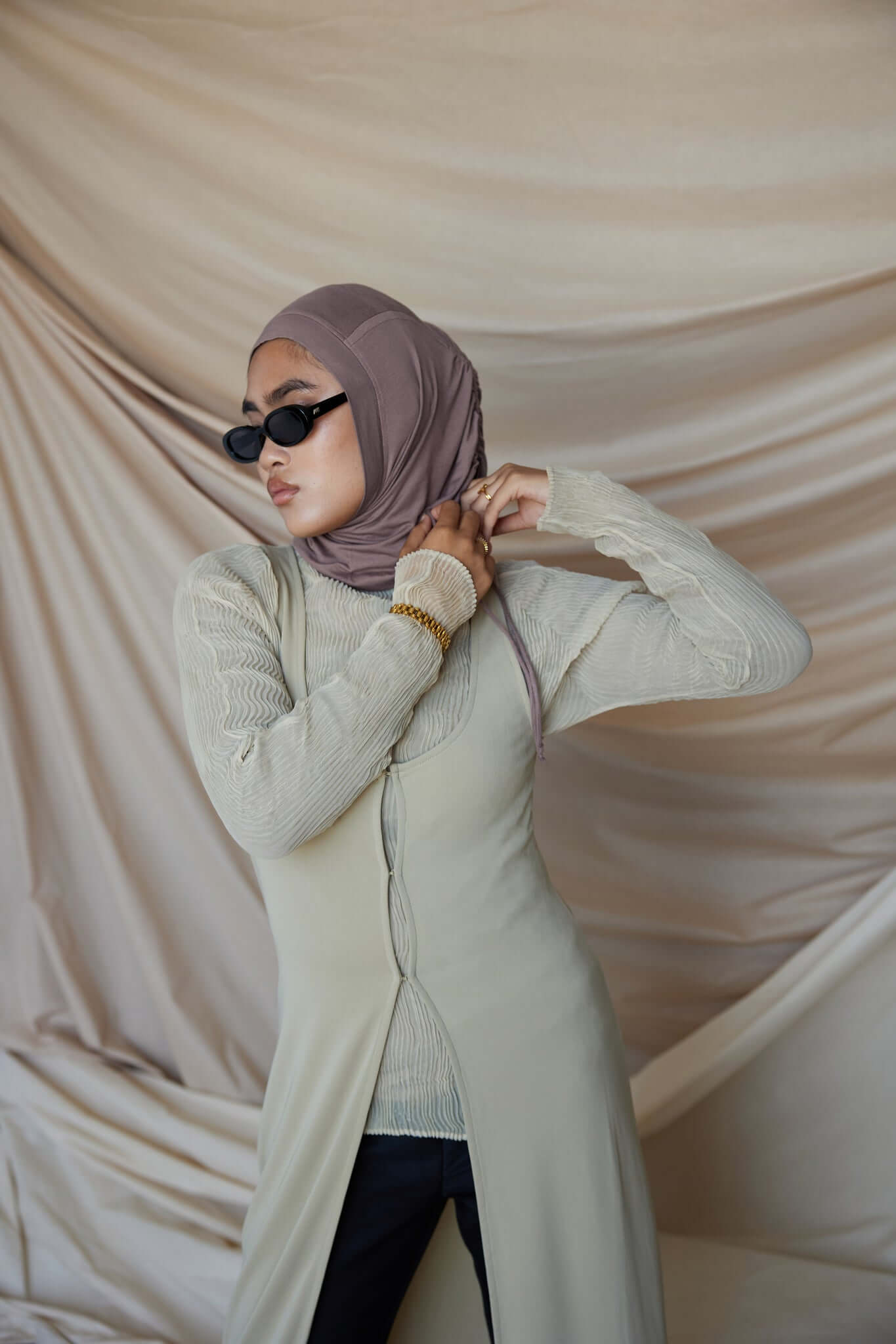 Mochas are not just for drinking! Make a statement with the ruching effect, adjust to fit your style with the drawstrings, and stay comfy in our breathable stretch jersey. This mocha gathered hijab in a mushroom color ruching hijab design adds a soft, textured elegance to your wardrobe, making it the perfect blend of comfort and style.