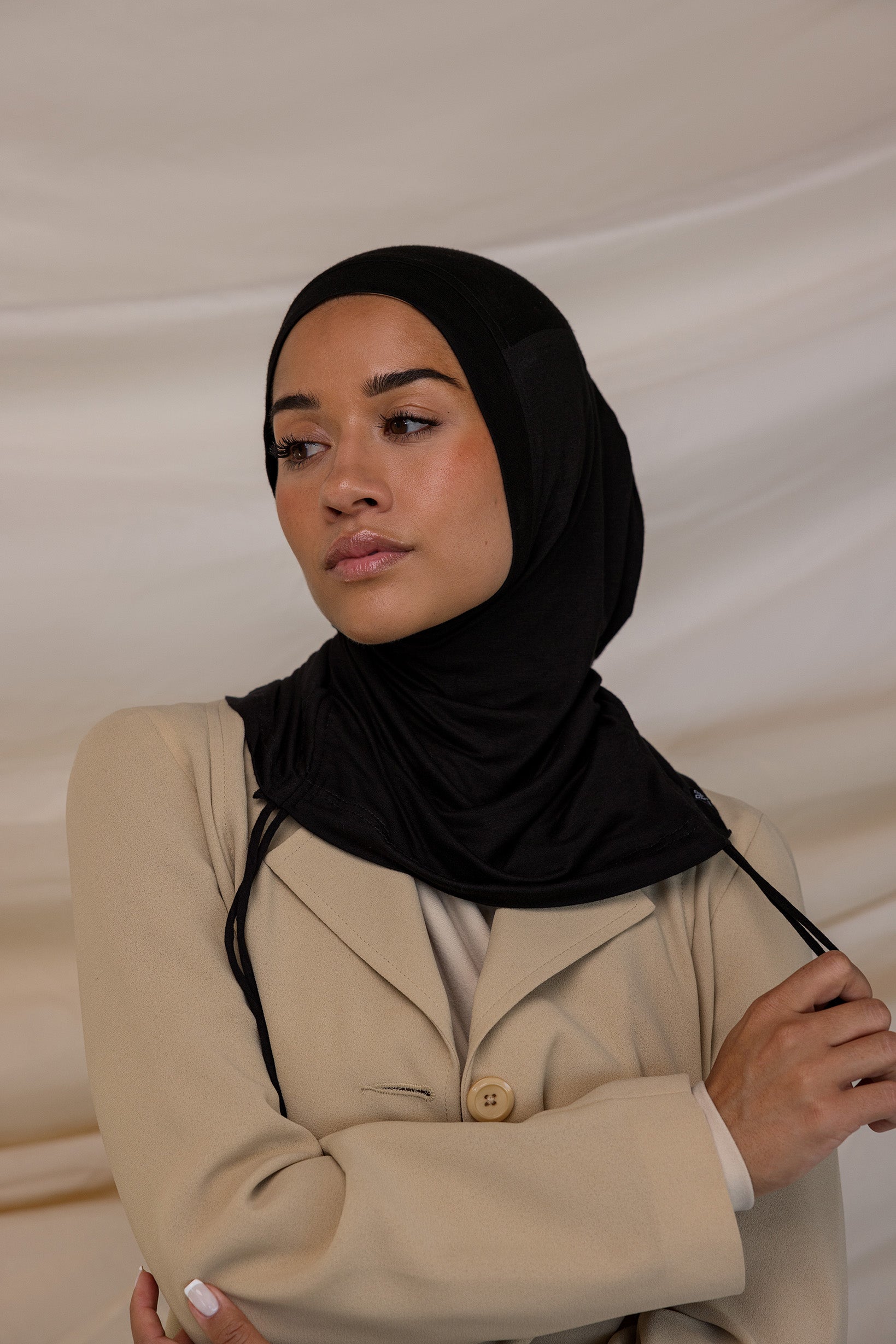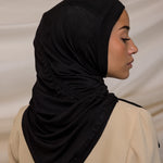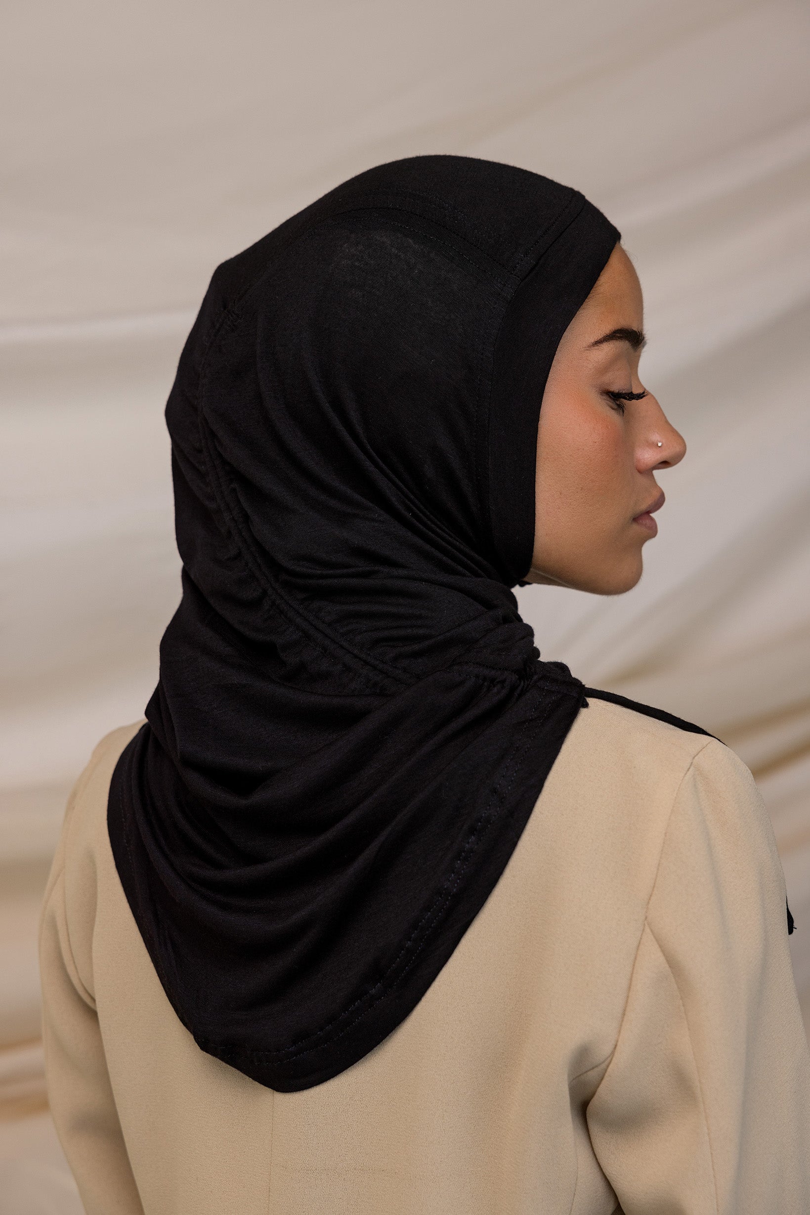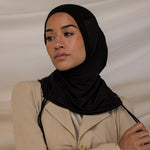 Experience timeless elegance with the Jet Black Ruching Lite hijab. This deep, inky black hijab is crafted from our lightweight, breathable fabric, combining the softness of jersey with the luxurious drape of modal. Featuring delicate ruching, this hijab offers a sophisticated look with a perfect blend of comfort and style. Wrinkle-resistant and with a 4-way stretch, it’s the ultimate go-to for an effortlessly polished appearance. This soft black ruching hijab is designed for versatility, offering the refined texture of a textured black ruching hijab, the ease of a lightweight black gathered hijab, and the airy comfort of a breathable jet black hijab.