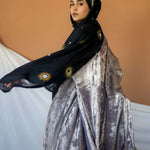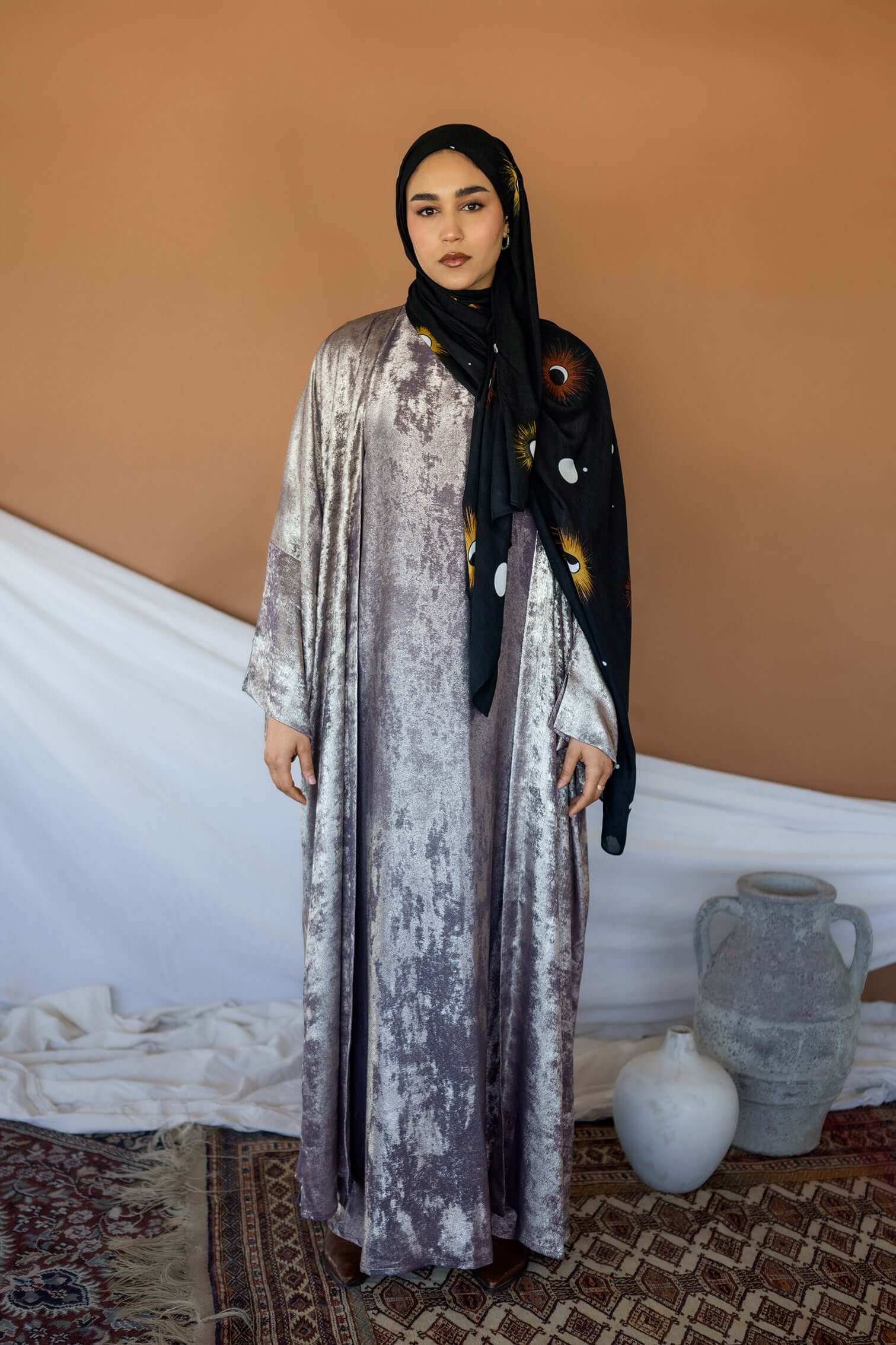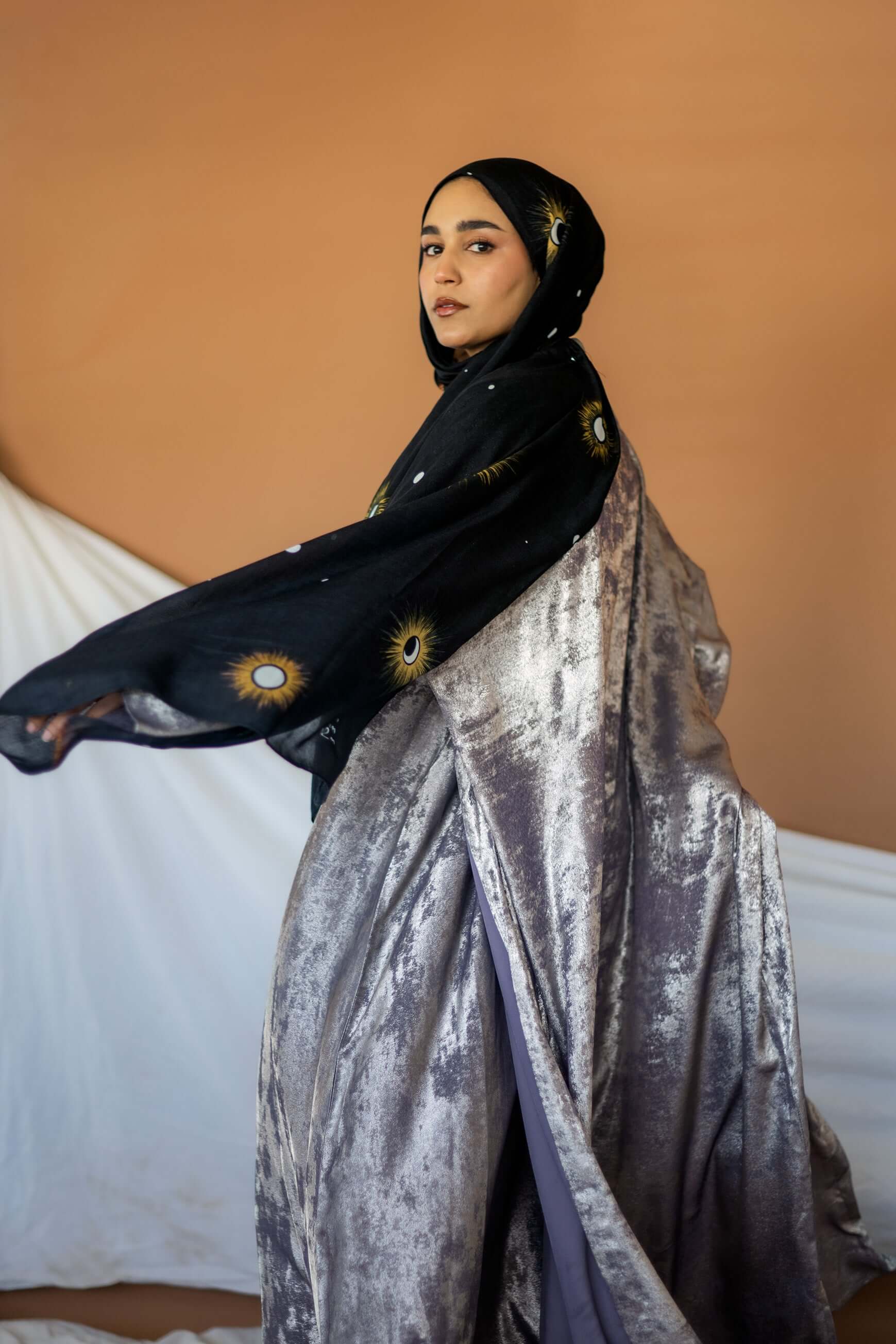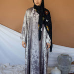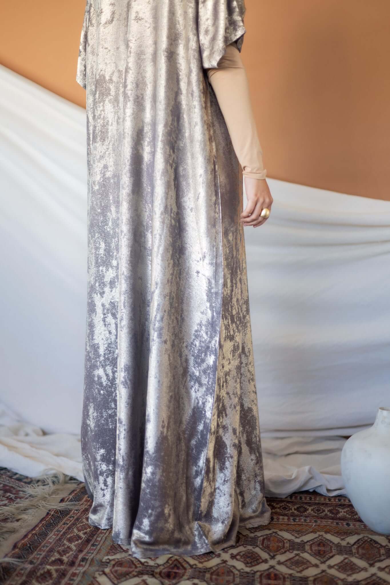 This timeless abaya gives the beautiful illusion of velvet dipped in liquid gold. The material is light and breathable to give a flowing silhouette. This is a 2 piece set and comes with  a matching underdress. Pairs well Crescent Phases & Moonlight.