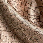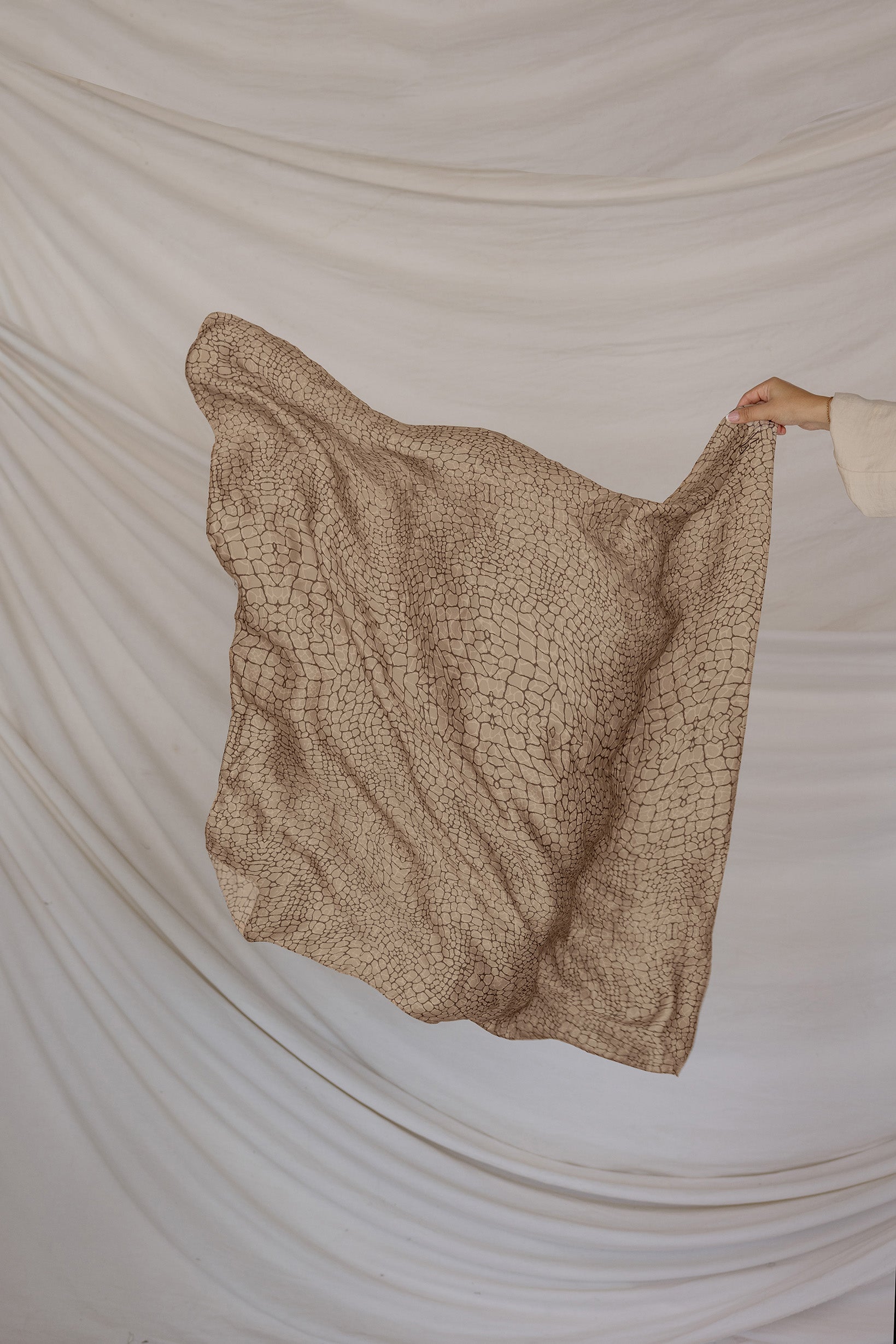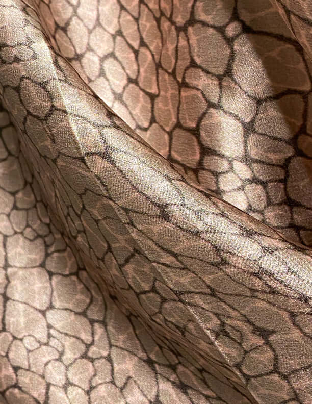 100% pure mulberry silk. Let out your wild side in this lush silk print. Safari brown with reptile mirrored veins of rich mocha will make you feel like you’re the queen of the jungle.