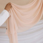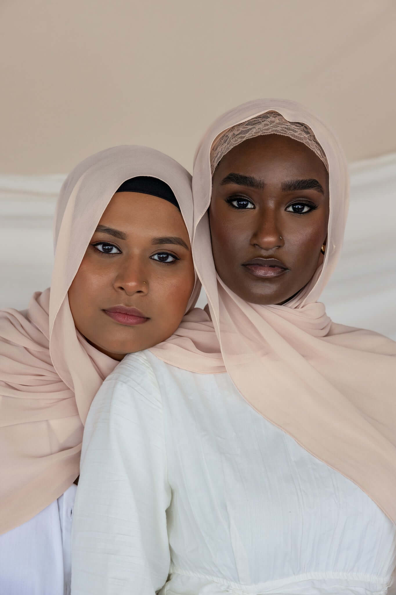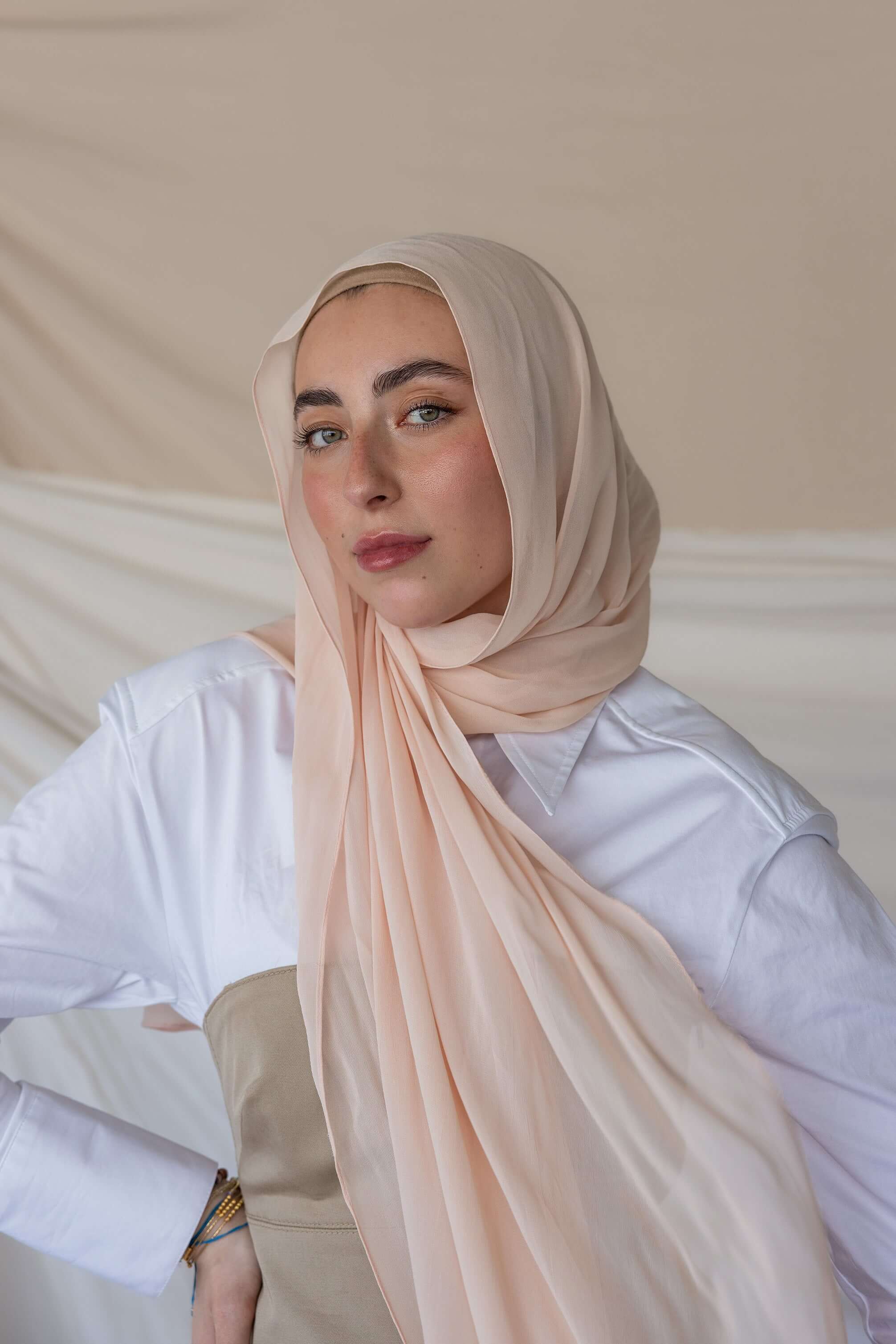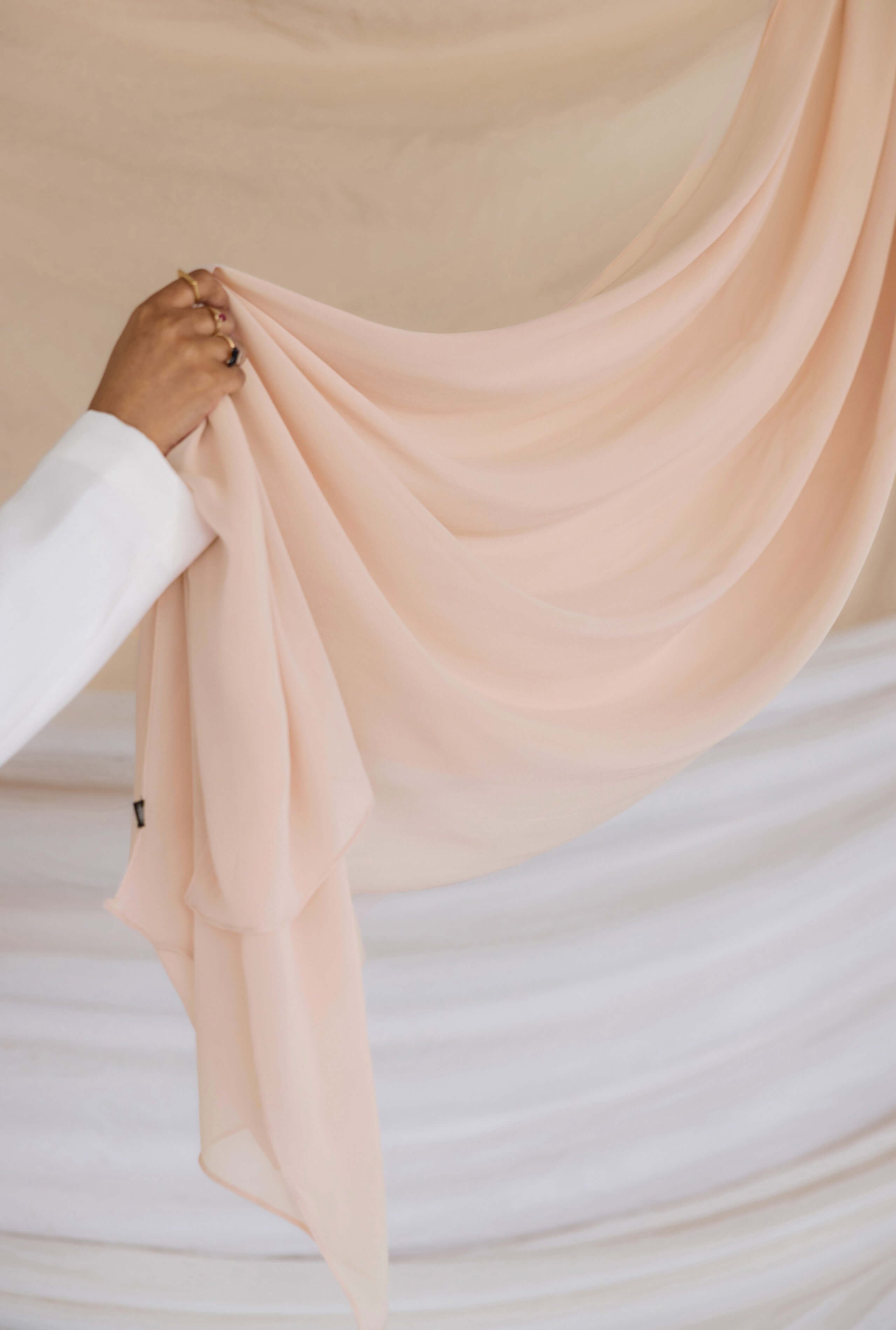 An ethereal hijab with a subtle hint of pink in the softest Crepe Chiffon fabric. With a warm undertone, this lovely hijab will complement any complexion. Get a breathable hijab with this all-new 100% cotton bemberg fabric. Discover the elegance of our Rosewater Crepe Chiffon Hijab and explore the luxurious Vela Crepe Chiffon collection.