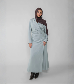 Woman wearing a light blue-gray hijab against a plain background