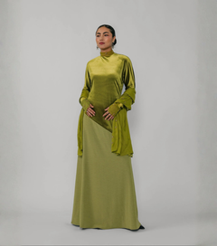Mia is a US 2 and 5'9, wearing our Tweed Curve Abaya in a size S/M in a 60" length. She pairs it with our Chartreuse Celestial Contrast Dress.