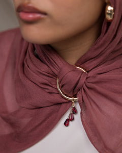 Close-up of a brown hijab with a gold ring and Henna Charm worn by a person.