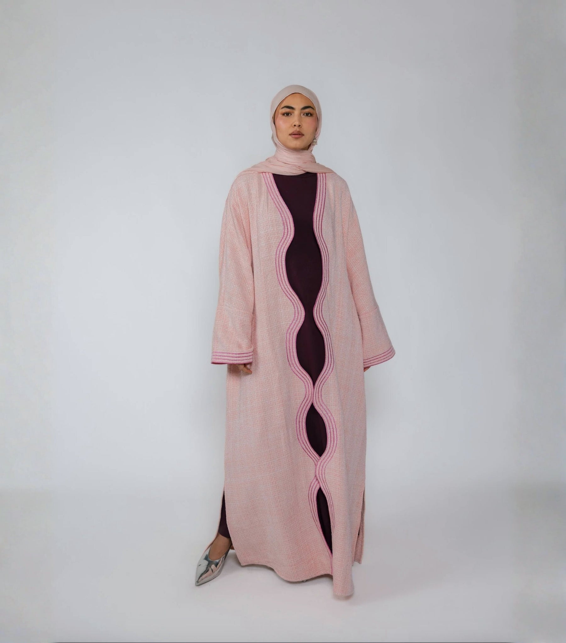 Featuring embroidered edges on our signature curved silhouette, this open abaya has wide sleeves and a softly structured drape for comfortable, all-day wear. Crafted in a textured tweed, it blends craftsmanship and ease ideal for prayer, Ramadan gatherings, and elevated everyday moments alike. Available in Black/Ivory and Pink/Magenta, in sizes XXS–3XL with lengths 53", 56", and 60".