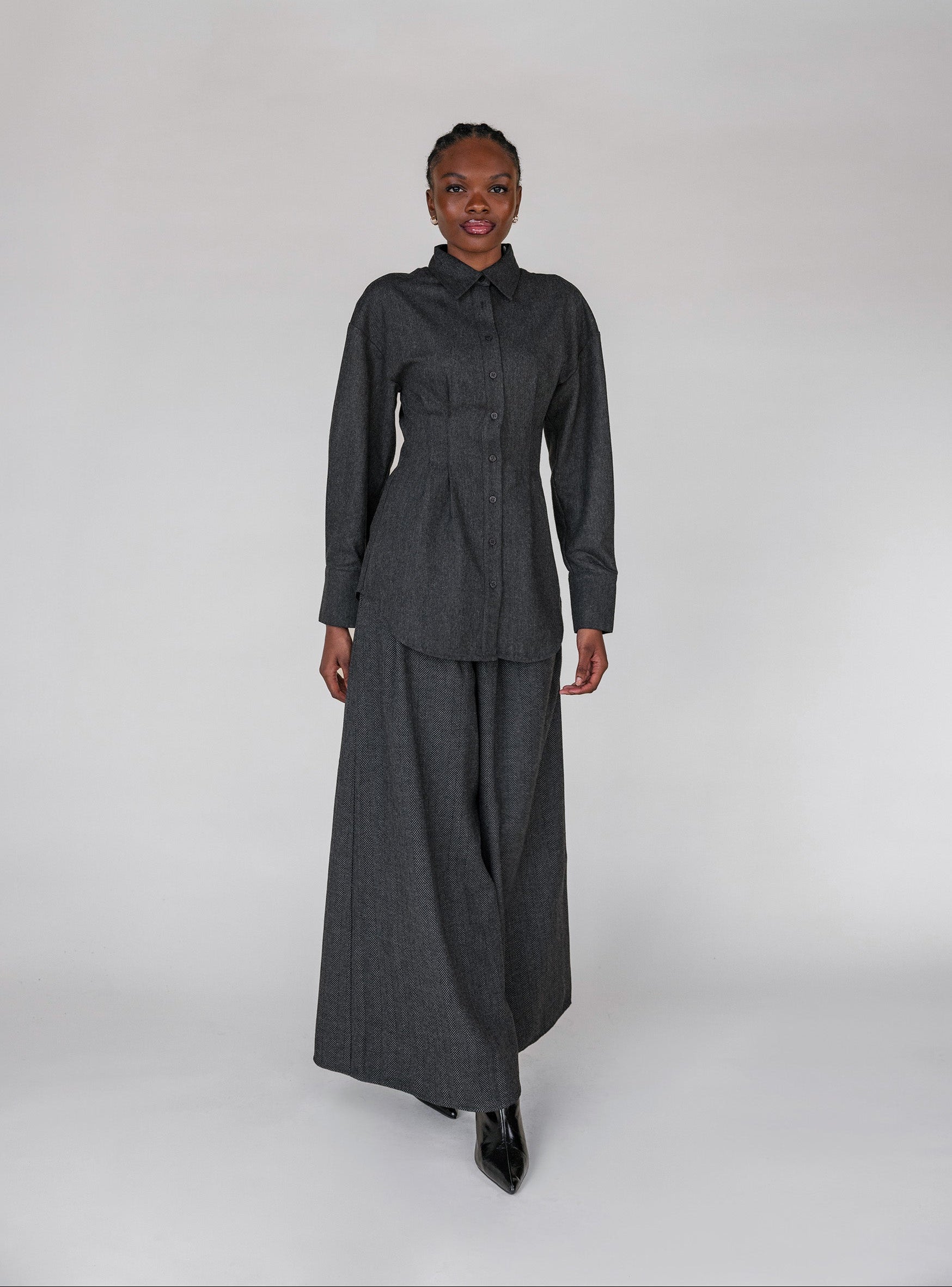 Wide-leg elegance with a textured herringbone weave, designed for effortless layering. Woven from herringbone/twill, these pants offer structure without restricting movement. Available in Brown and Charcoal in sizes XS–3XL. Pair with the matching Sculpted Button Up. These Herringbone Palazzo Pant Charcoal are women’s charcoal palazzo trousers, designed as elegant herringbone wide leg pants and charcoal high waisted palazzo pants for a polished, versatile look.