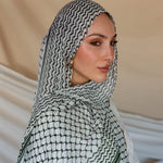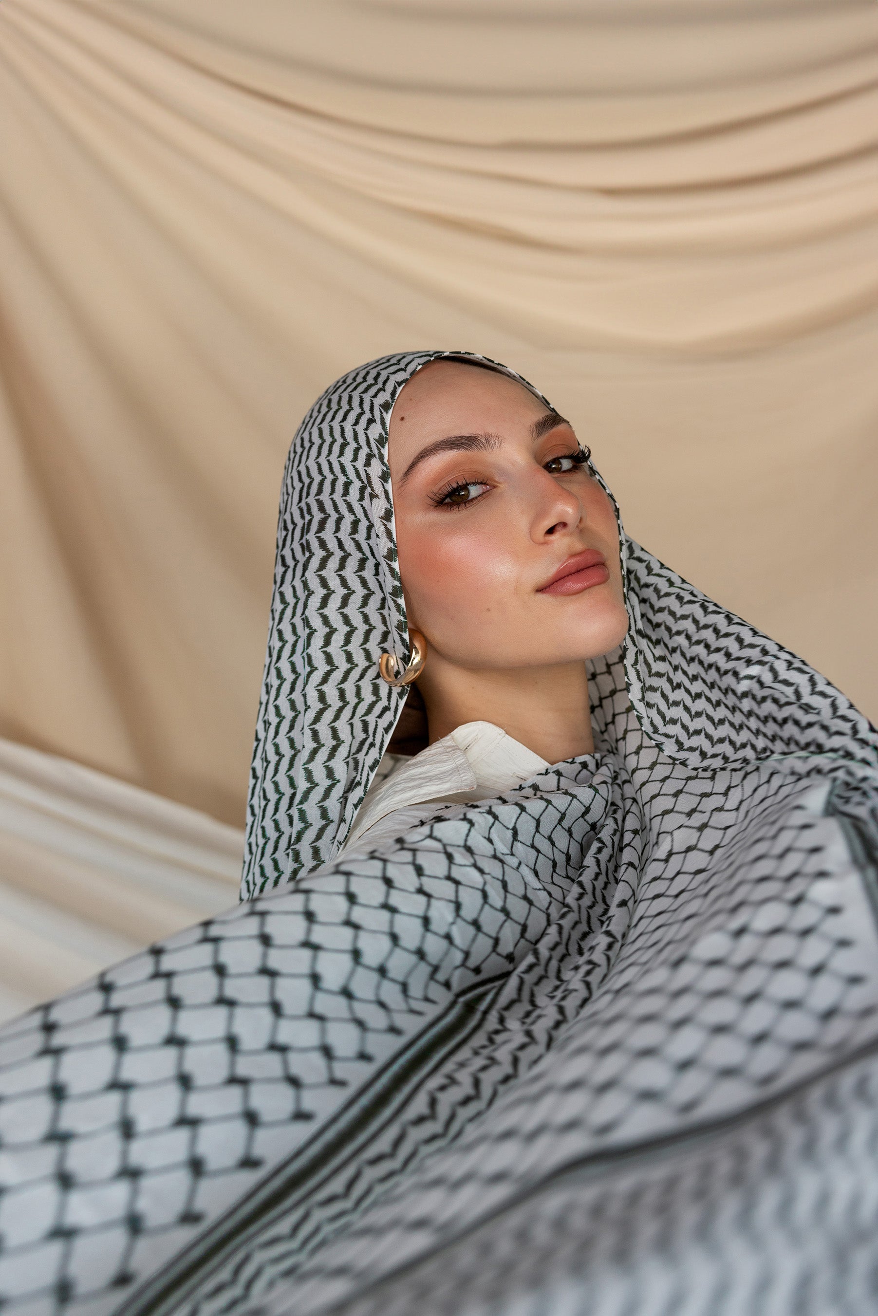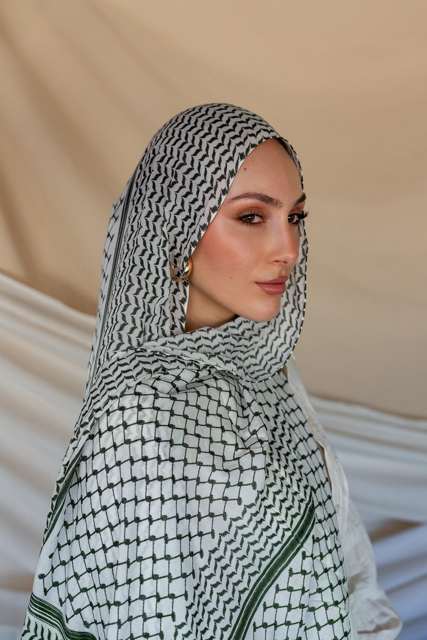 The iconic kuffiyeh pattern is printed on our signature modal fabric in order to deliver a breathable option for those who choose to wear it as a hijab.