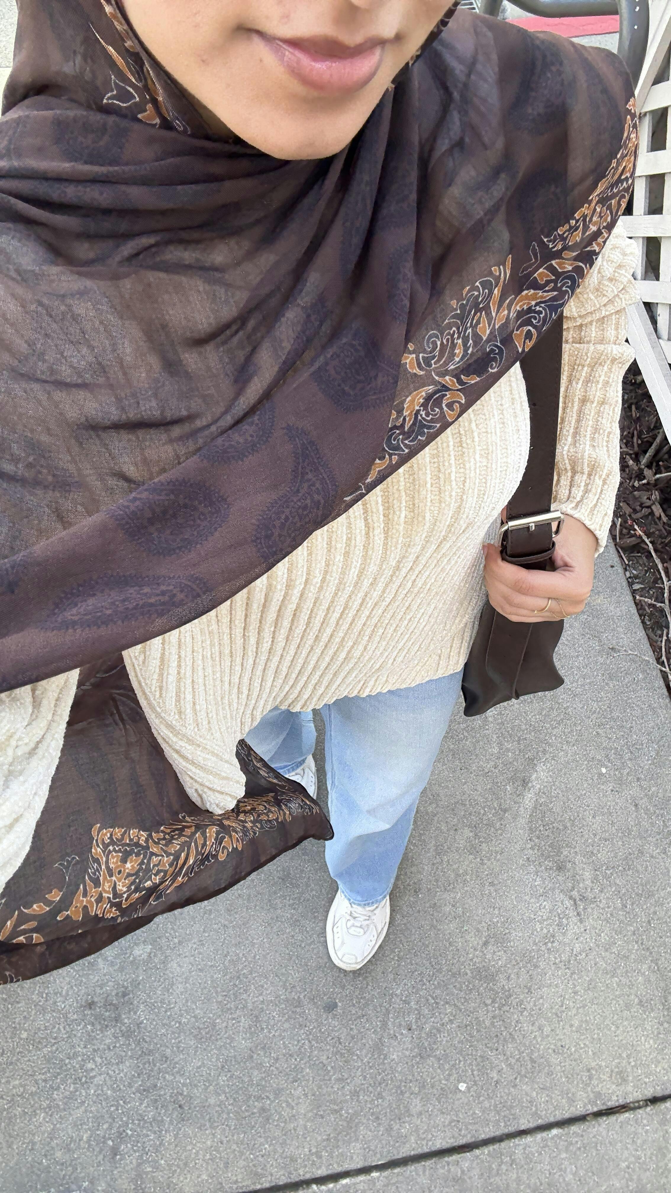 Front profile of model in Chocolate Paisley hijab, neutral background.