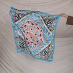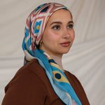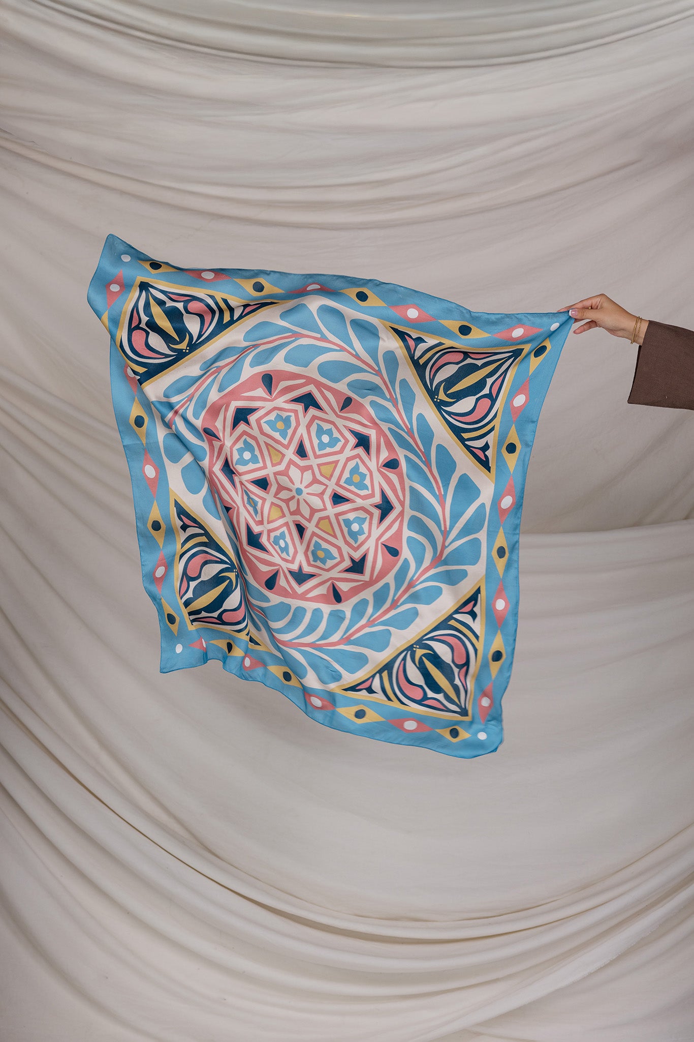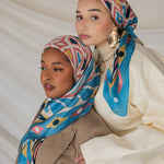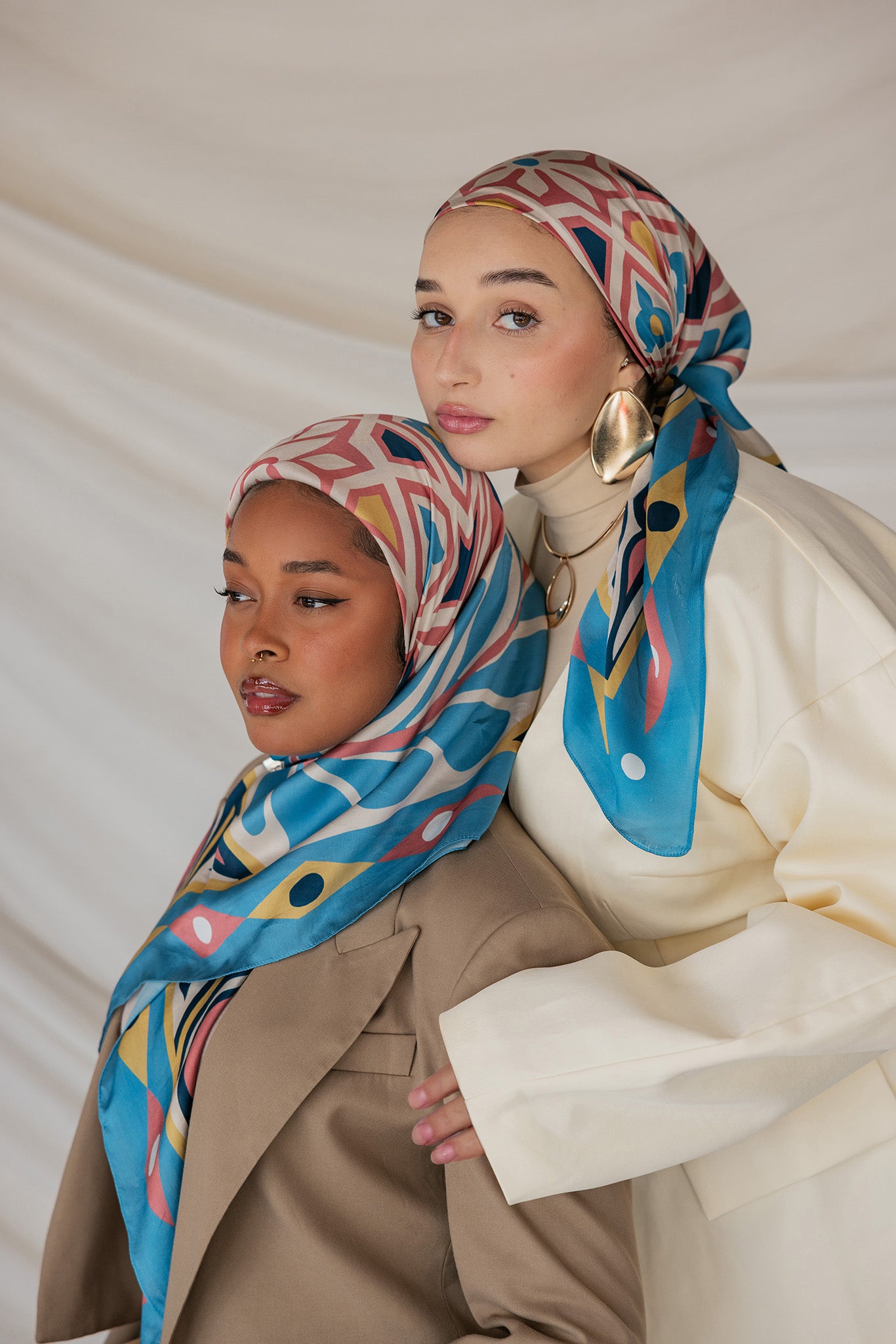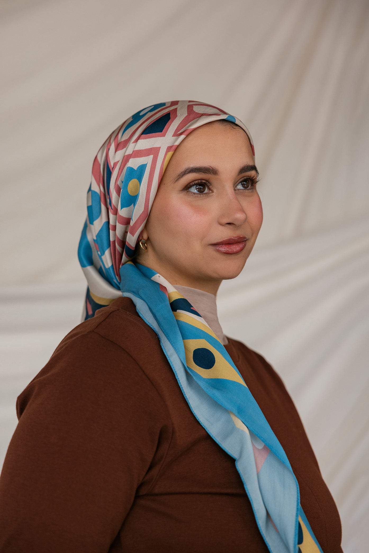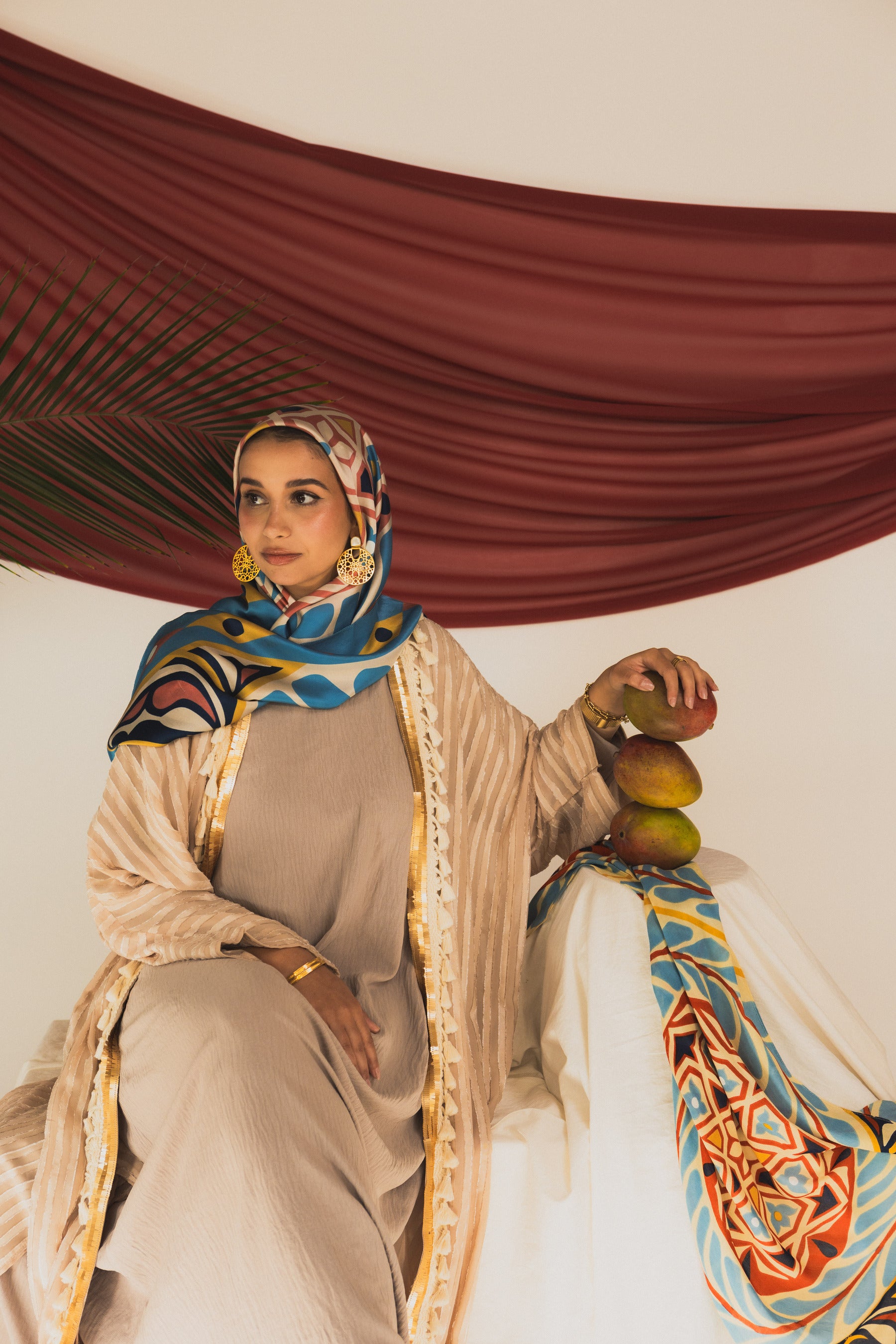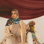 On 100% silk, Om Al Dunya Silk glides in emerald, sandy beige, and golden tones, reflecting the boldness and warmth of Egyptian heritage. Designed by Egyptian artist Jeneen Elbershawi, the print is a tribute to the women who inspire her, combining fluidity, elegance, and cultural storytelling in a luxurious, expressive hijab.