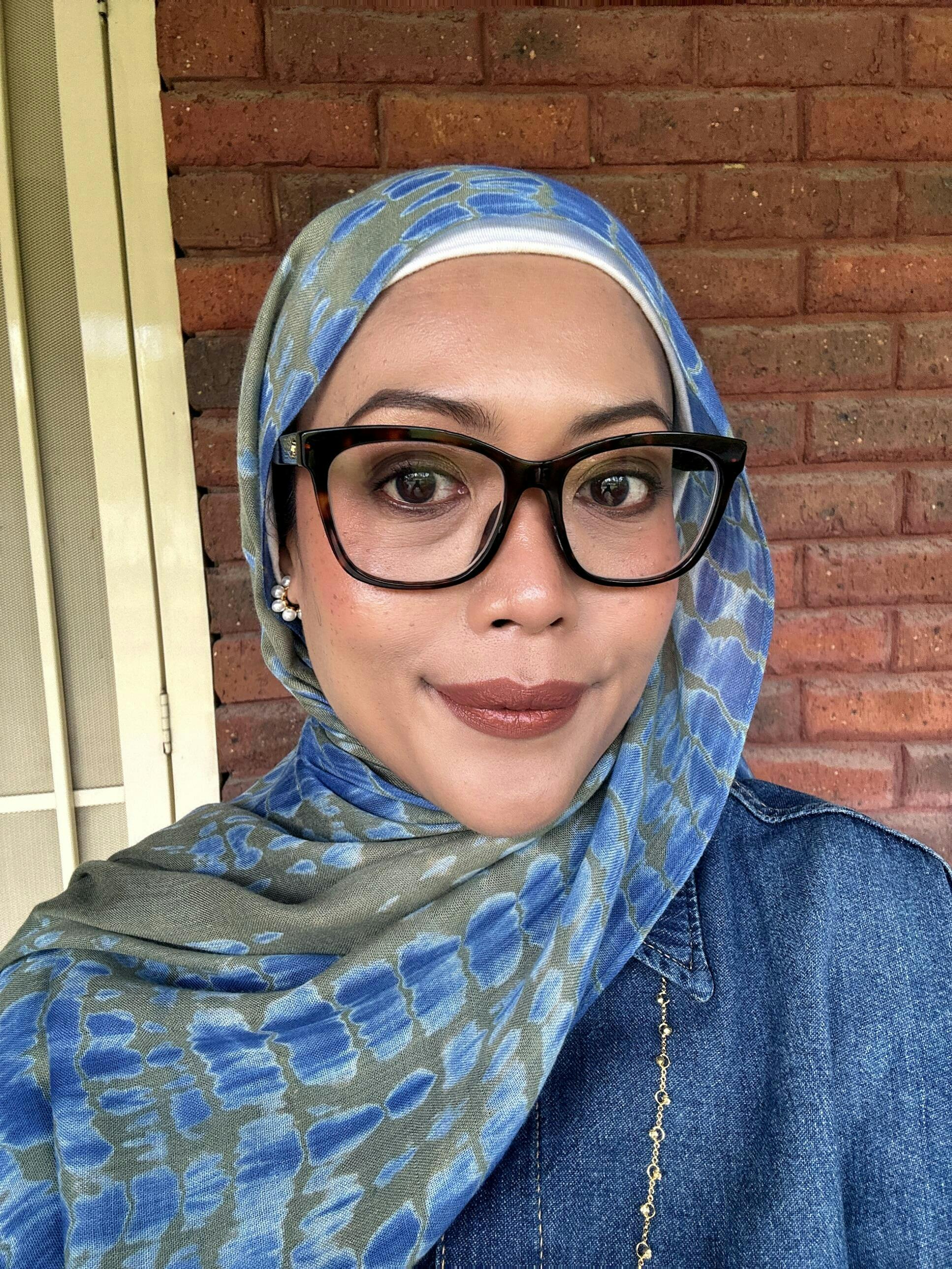 Woman wearing a green and blue ripple patterned hijab and beige coat against a white curtain background