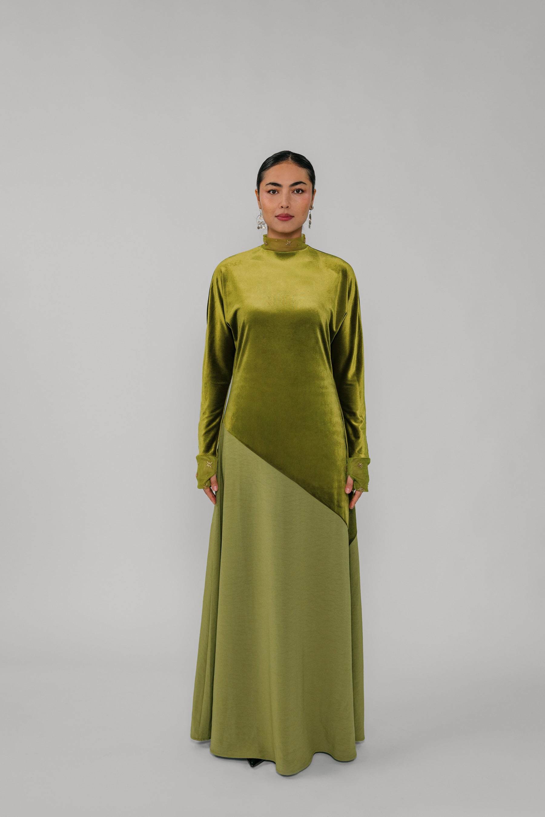 Person wearing a green velvet outfit with a long skirt on a gray background
