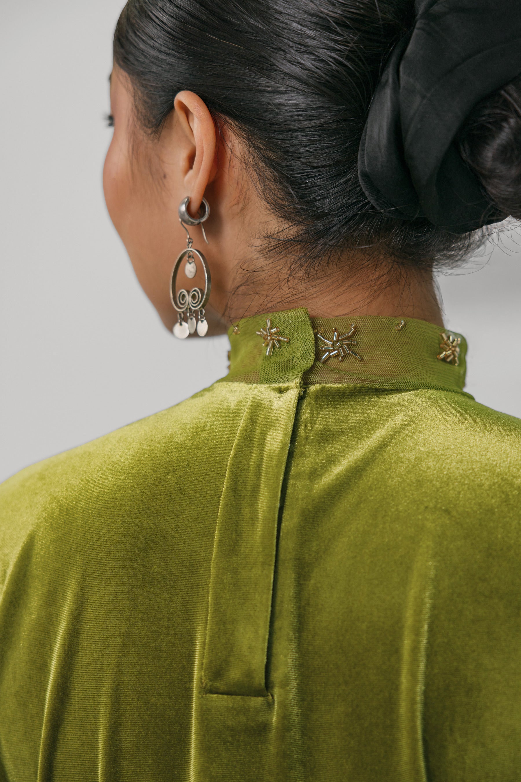 Green velvet garment with decorative collar and earrings on a neutral background