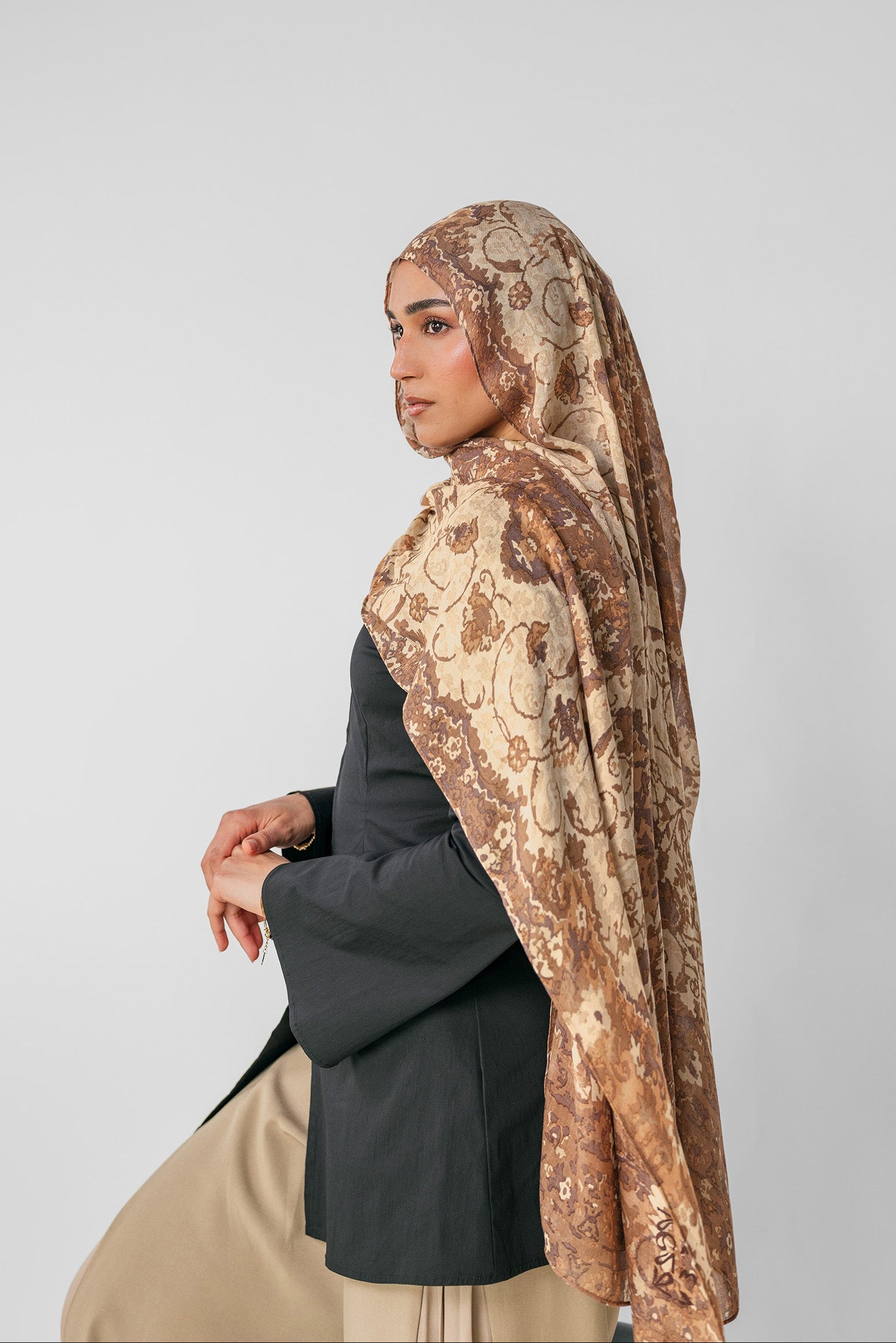 Brown and beige patterned hijab fabric on a plain background