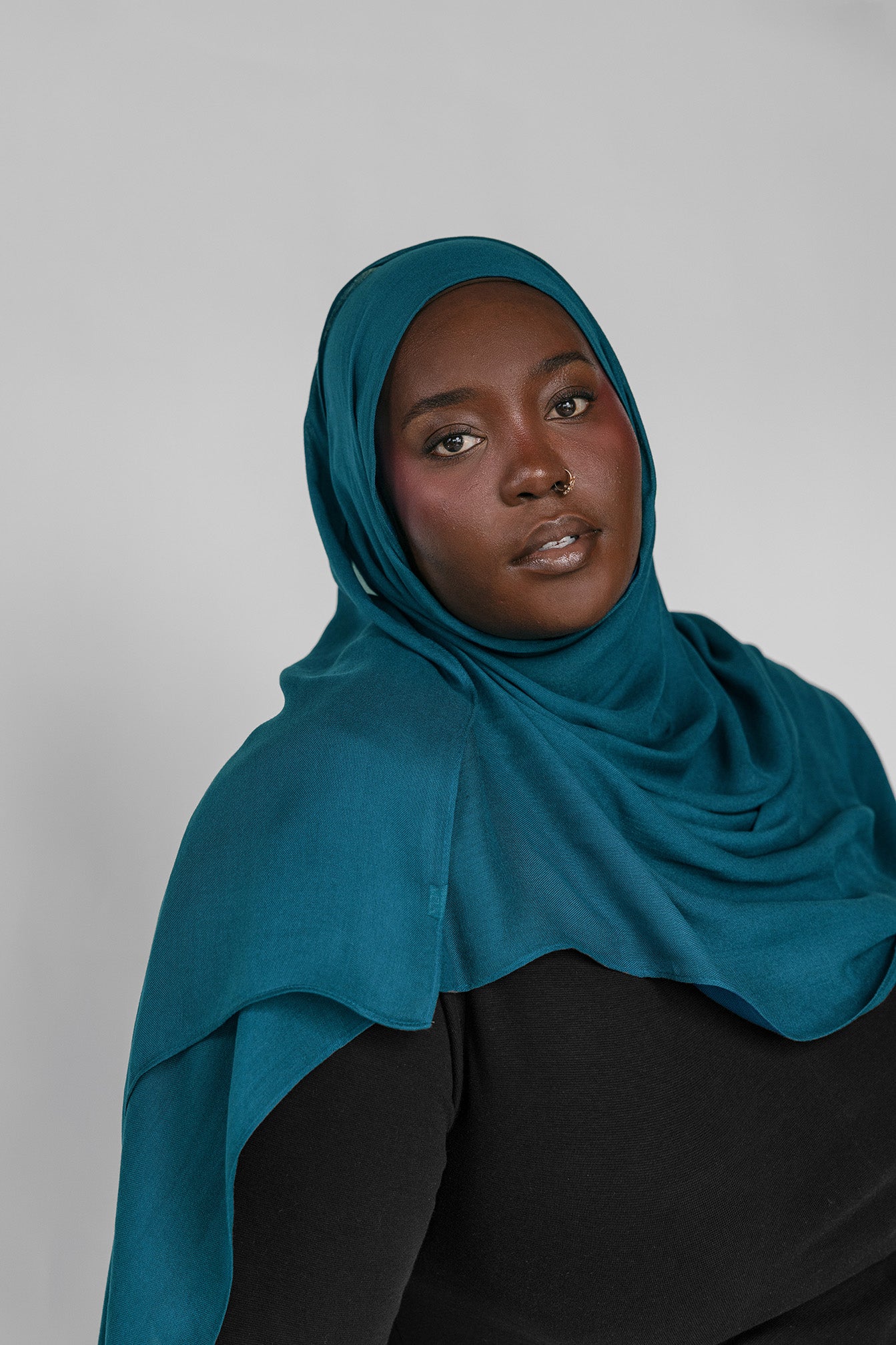 Woman wearing a teal hijab against a plain background
