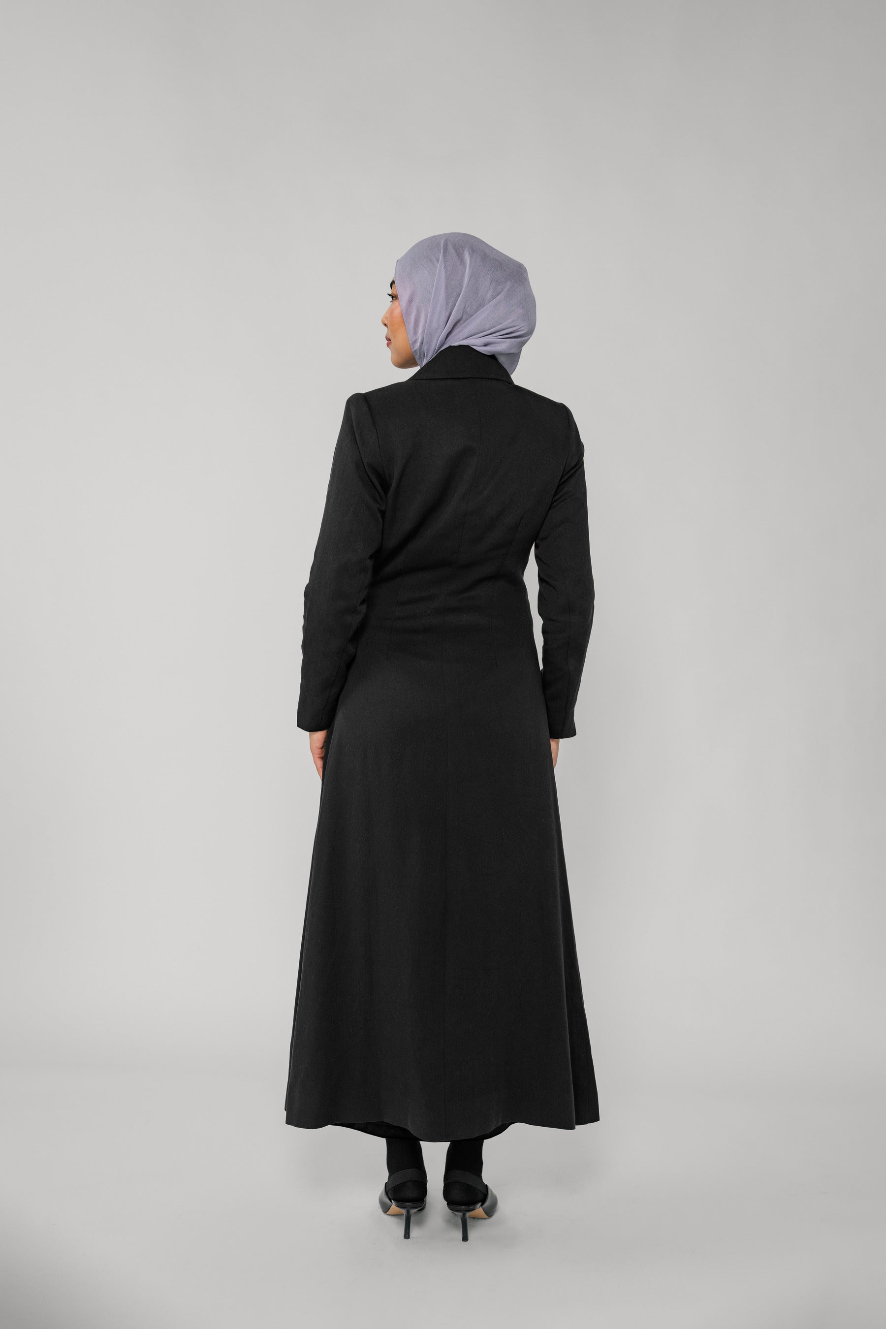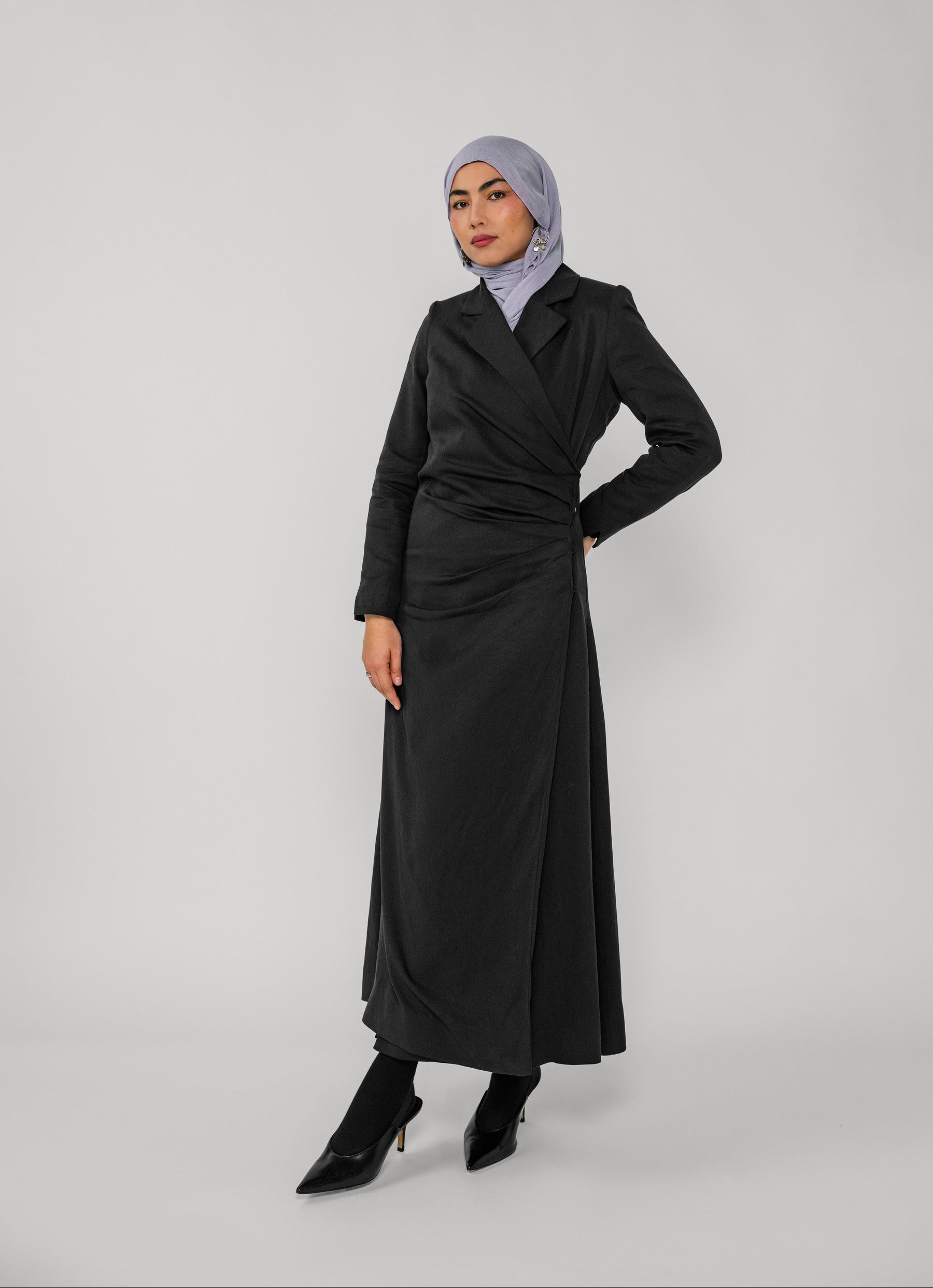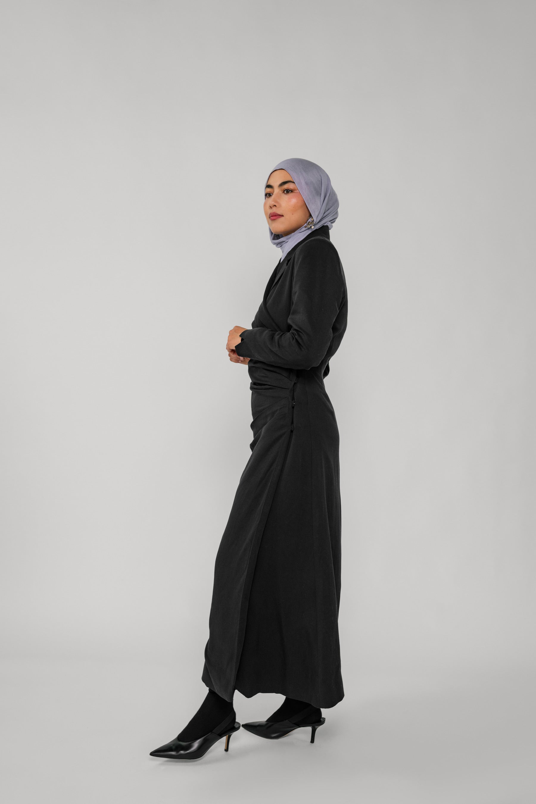 Assiya is a US 2 and 5'9, wearing our Ruched Trench Dress in a size S. She pairs it with our Dawn Skies hijab.