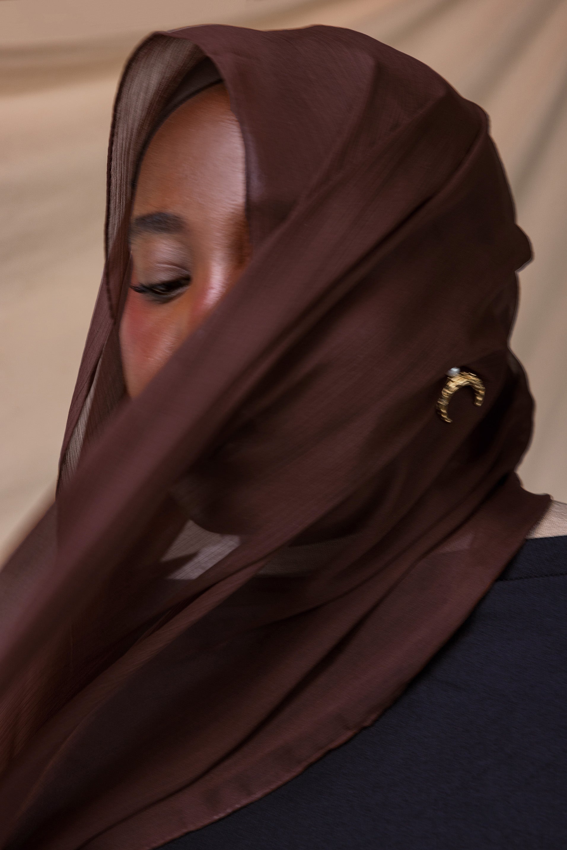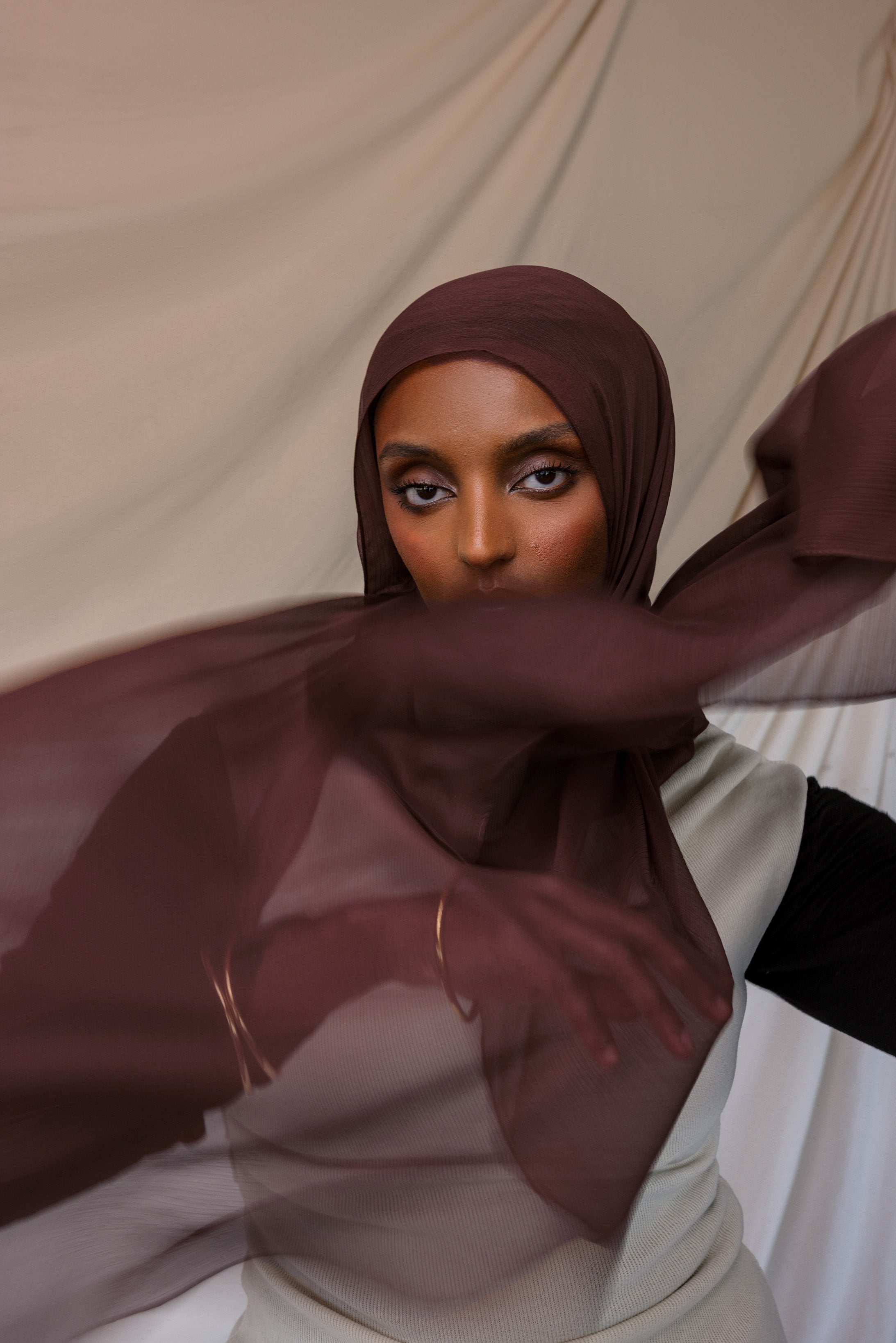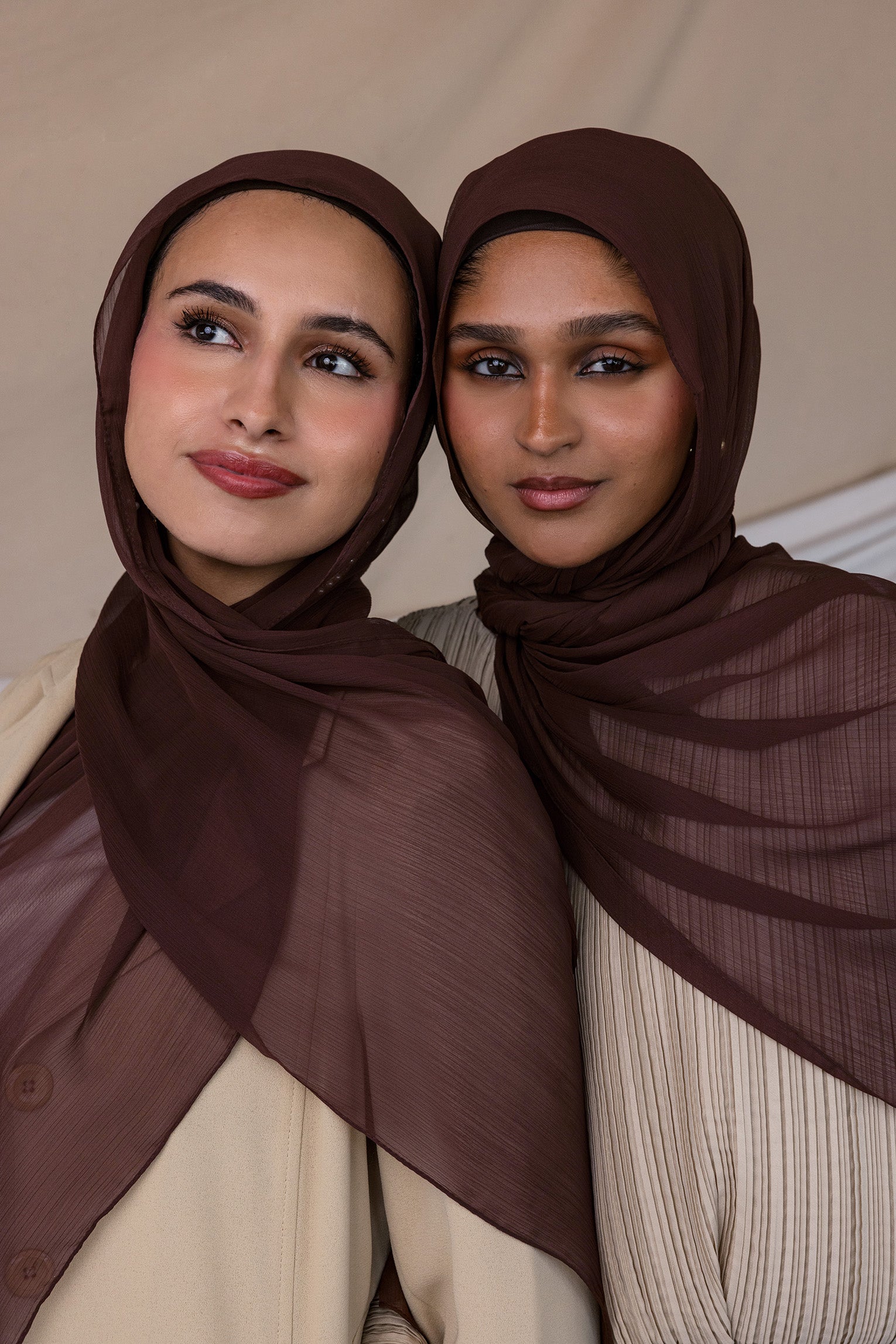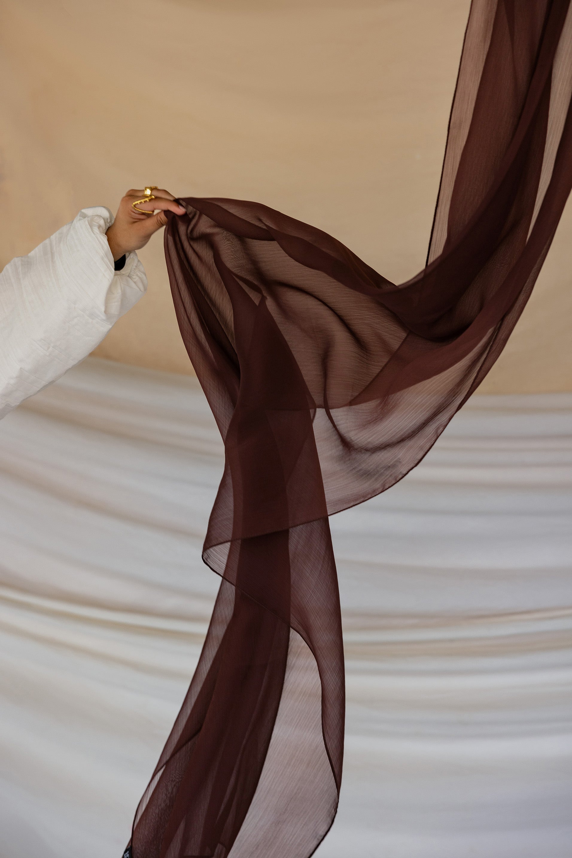 Indulge in the rich tones of Espresso Quartz. This deep brown crinkle chiffon is as smooth as a freshly brewed cup of coffee. No slip and luxuriously soft, this hijab is perfect for those who appreciate the finer things in life. Elevate your everyday look with this warm, sophisticated shade that pairs beautifully with any outfit. The espresso quartz crinkle chiffon hijab is a must-have scarf hijab for those seeking both elegance and comfort.