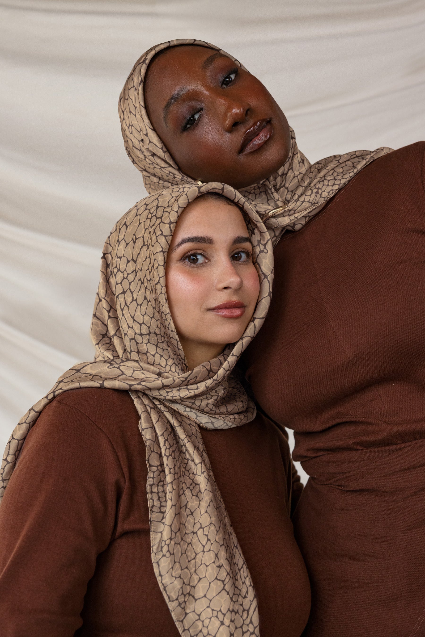 100% pure mulberry silk. Let out your wild side in this lush silk print. Safari brown with reptile mirrored veins of rich mocha will make you feel like you’re the queen of the jungle.