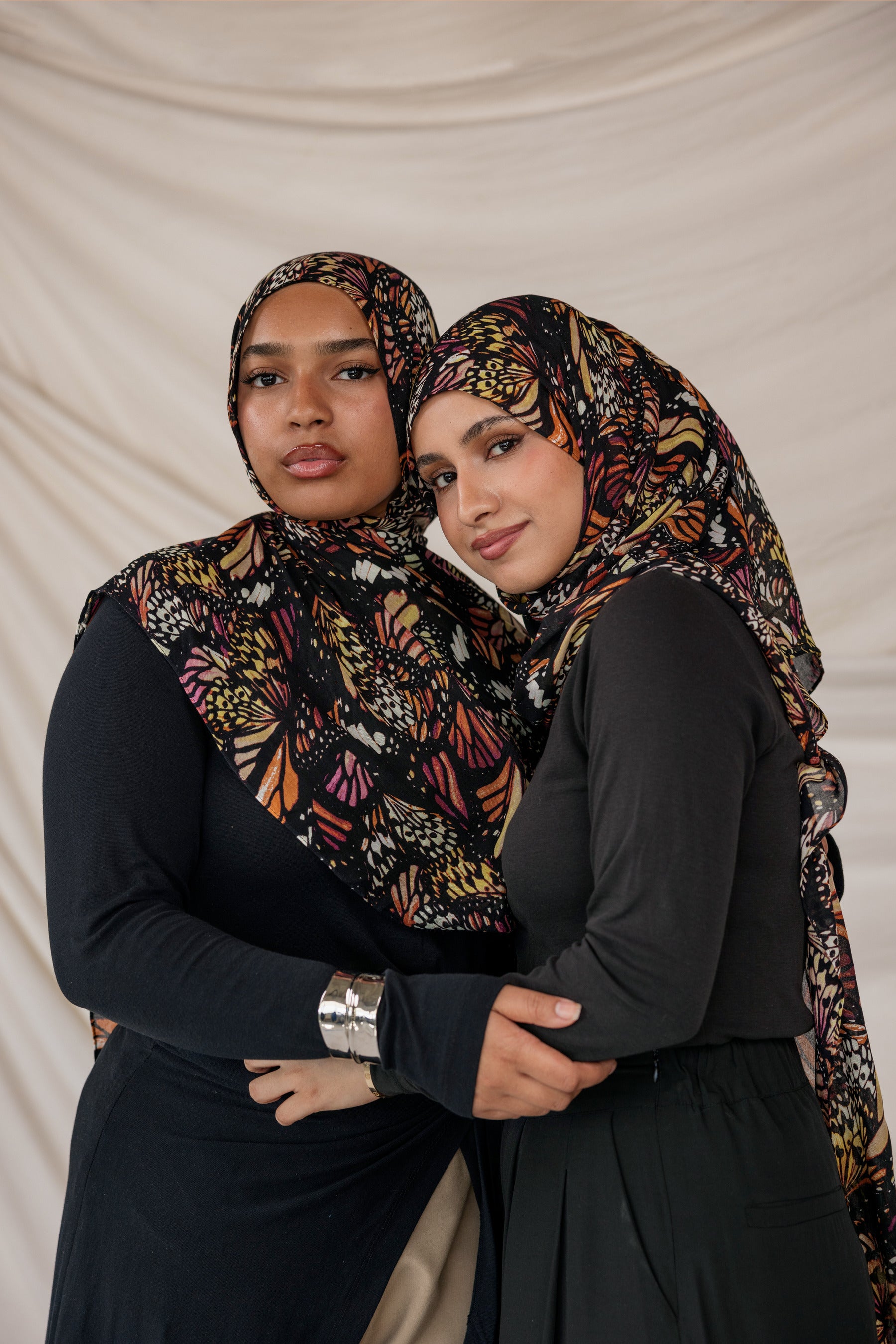 Embark on a journey of kaleidoscopic beauty with our Kaleidoscope hijab‚ a mesmerizing print inspired by the delicate wings of monarch butterflies. Capturing the essence of transformation and vibrancy, this hijab is a true work of art.