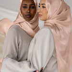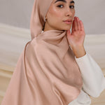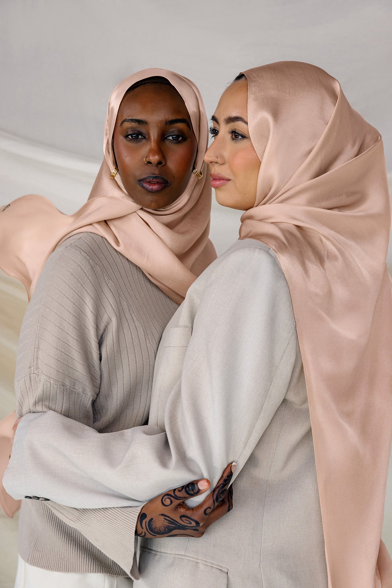 The Ballerina Pink Silk Satin hijab is the refined, high-shine sister to your beloved silk chiffon. Its 100% silk smooth satin texture and delicate sheen add a soft, polished touch to any formal look. Whether dressing up for a special occasion or elevating your everyday style, this hijab provides the perfect balance of luxurious shine and comfort, creating a beautiful, intentional drape. Elevate your wardrobe with the elegant Ballerina Pink Silk Satin scarf, designed for those who seek a timeless pink scarf or a sophisticated hijab.