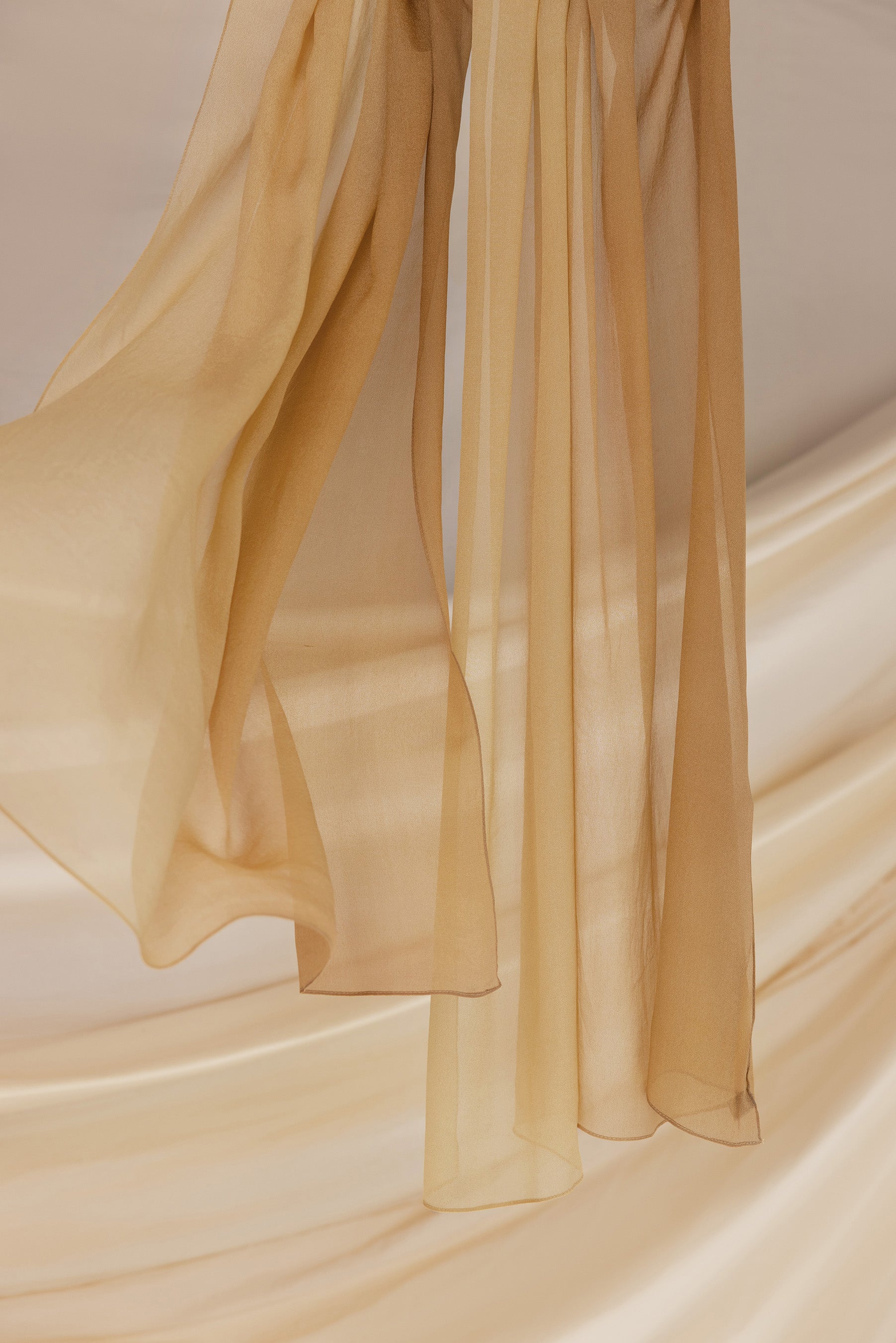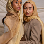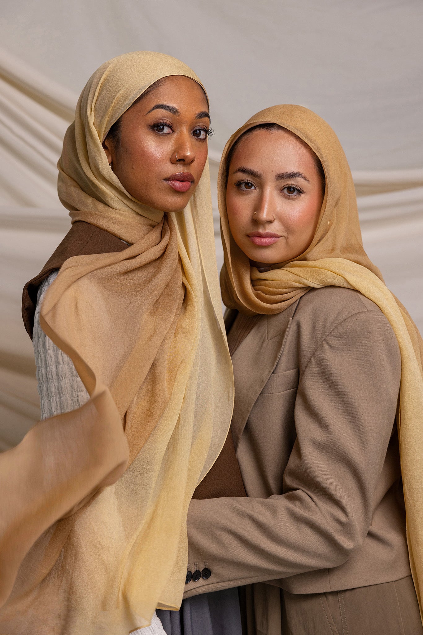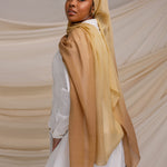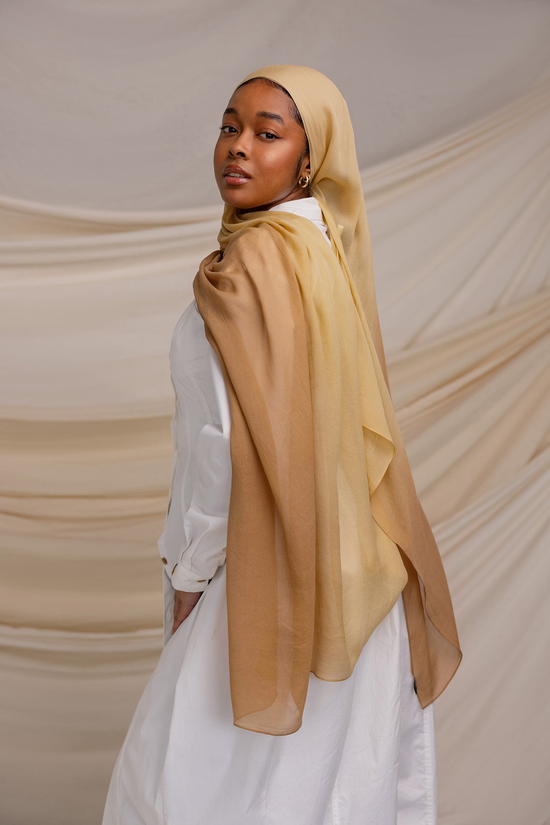 Golden hour, but make it silk. This luxurious ombre hijab transitions effortlessly from warm gold to a soft, glowing beige, creating a look that radiates elegance. Made from 100% pure silk with a chiffon-inspired drape, Gold Ombre Silk Chiffon is the perfect blend of shine, softness, and non-slip comfort. Crafted from premium Ombre Silk Chiffon Fabric, it offers a smooth, breathable texture.