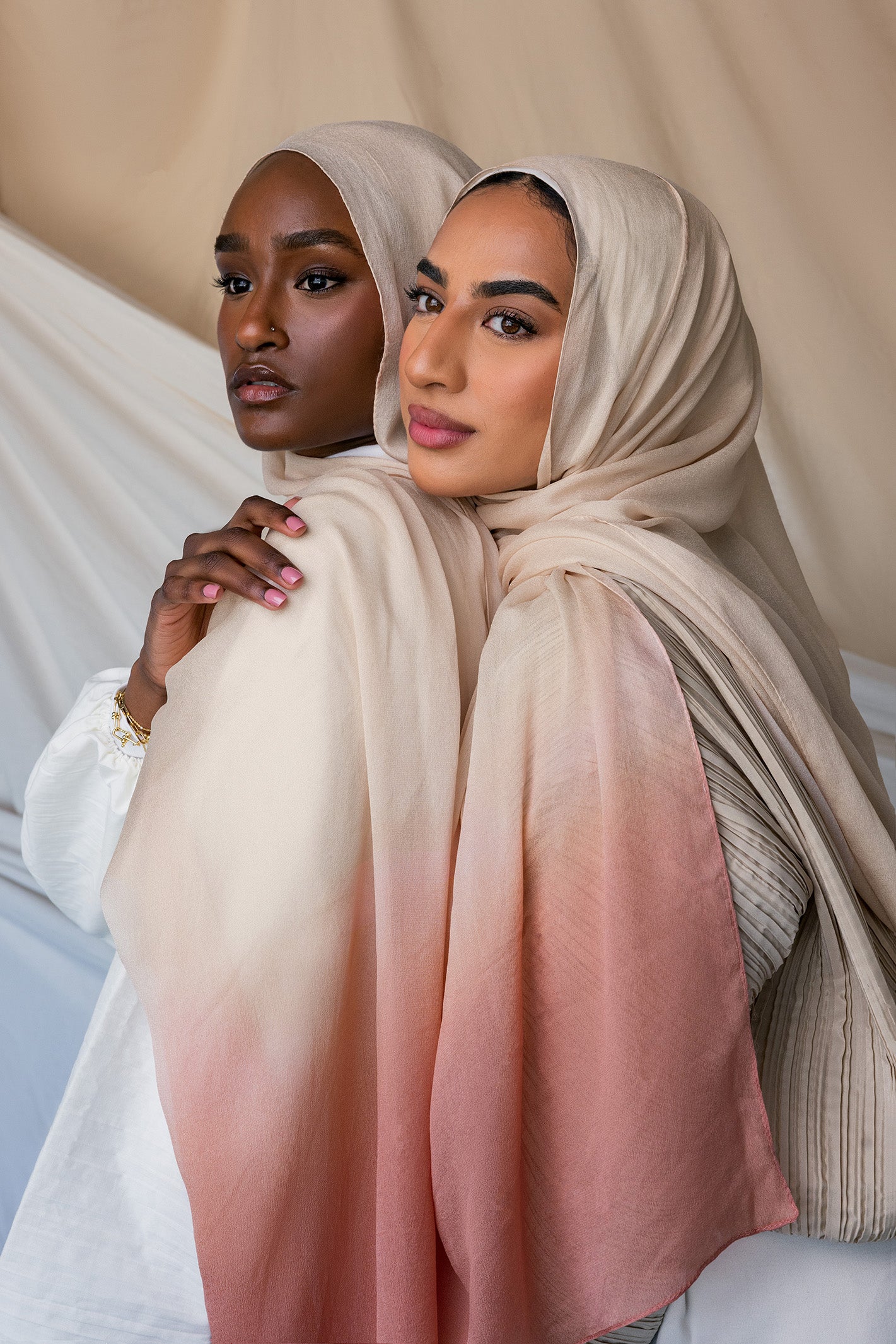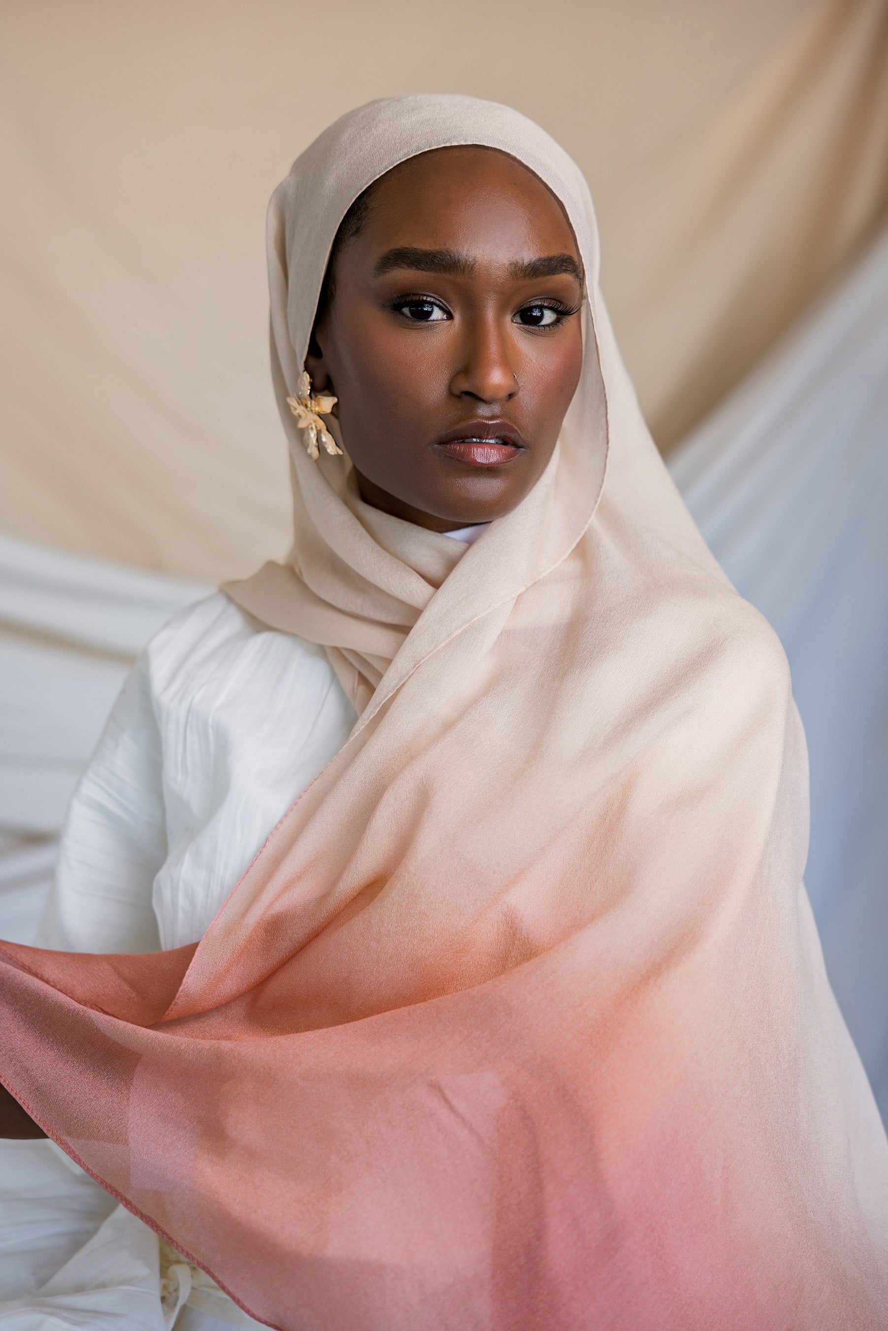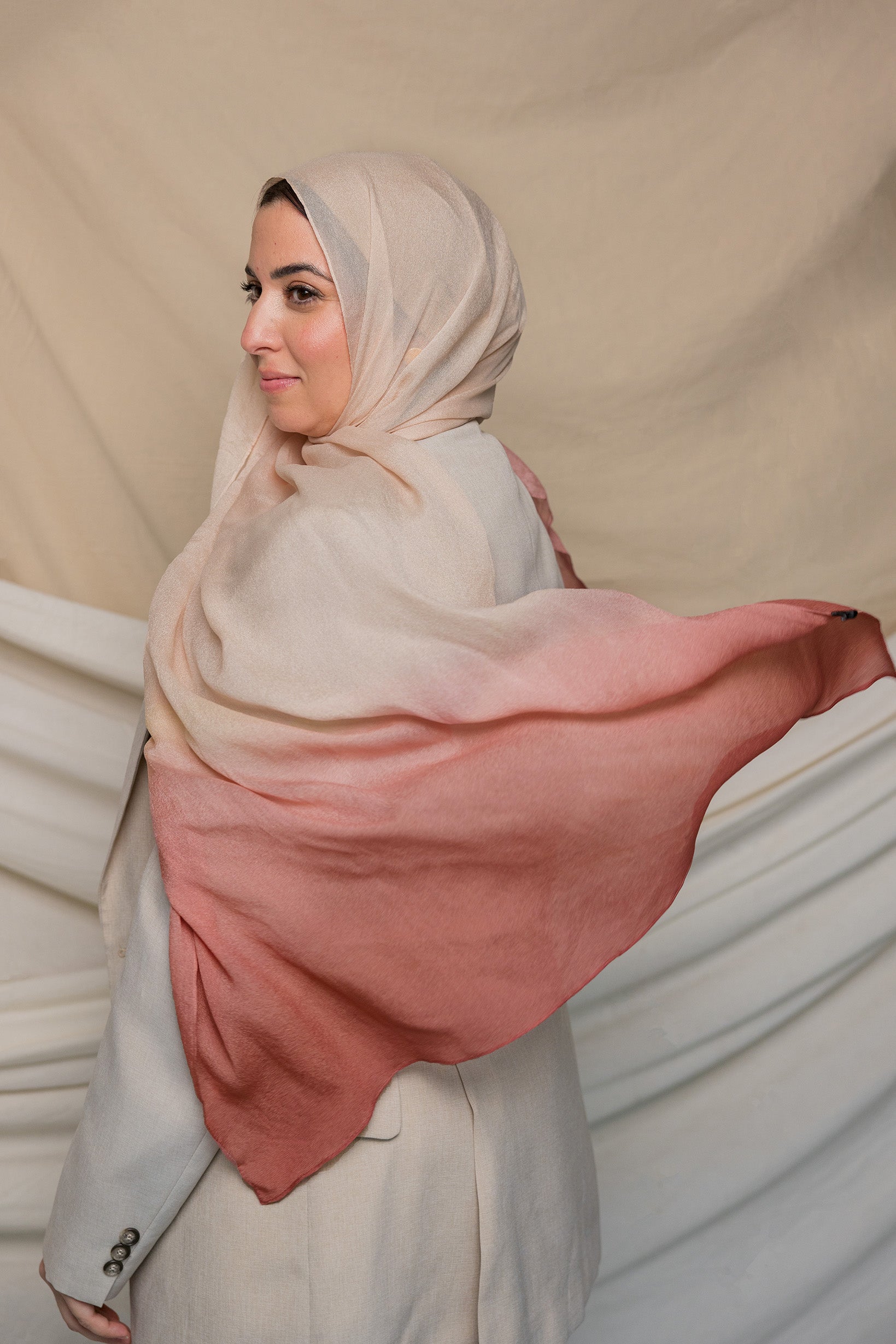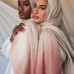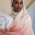 Flower petals dipped in cream come to mind in this decadent hijab. Crafted in our cooling, flowy silk chiffon, you won’t be able to stop wearing it. Made from luxurious Blush Ombre Silk Chiffon Fabric, it features a stunning gradient of soft blush hues. The delicate blend of Ombre Silk Chiffon Fabric ensures a breathable and elegant drape, perfect for any occasion.
