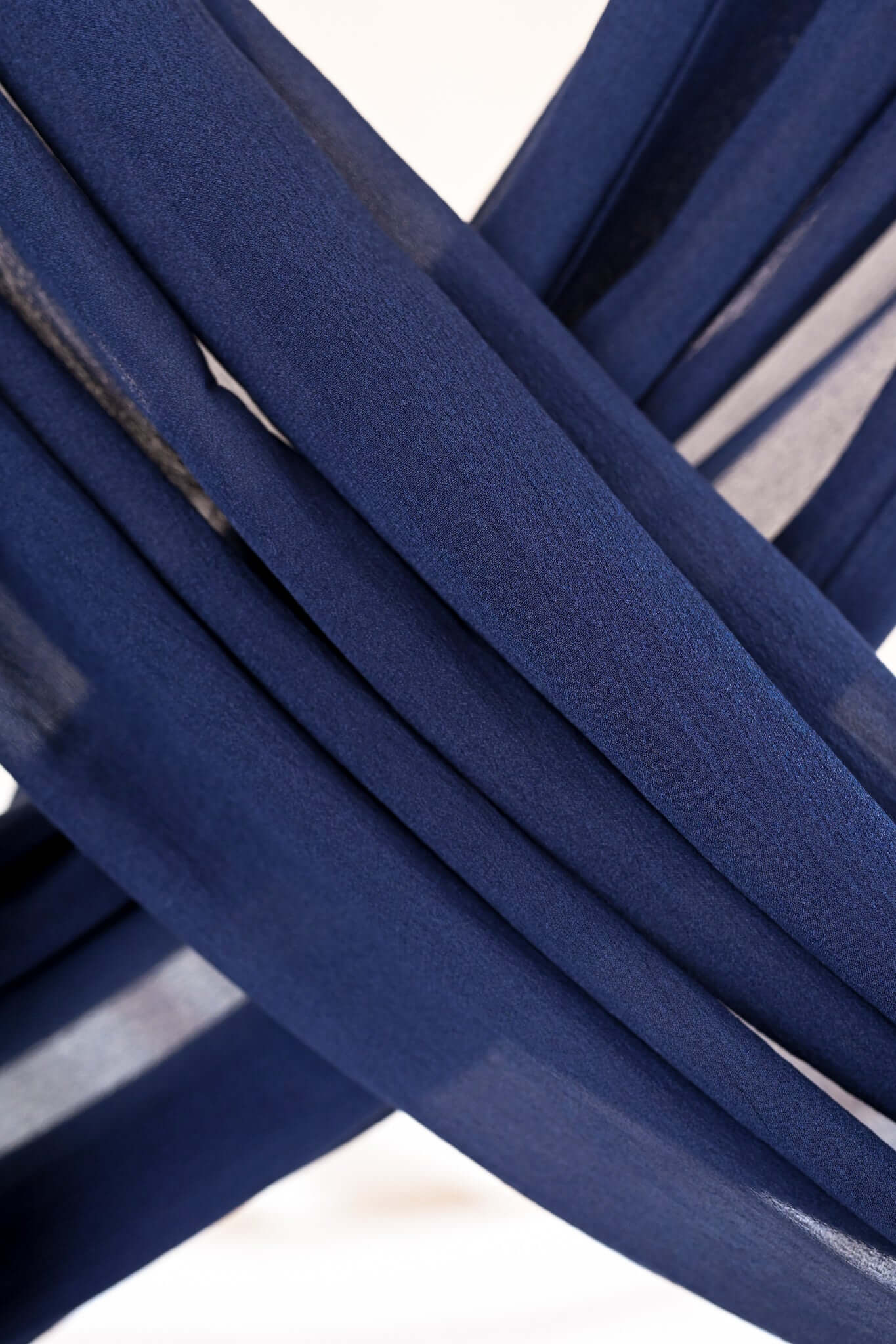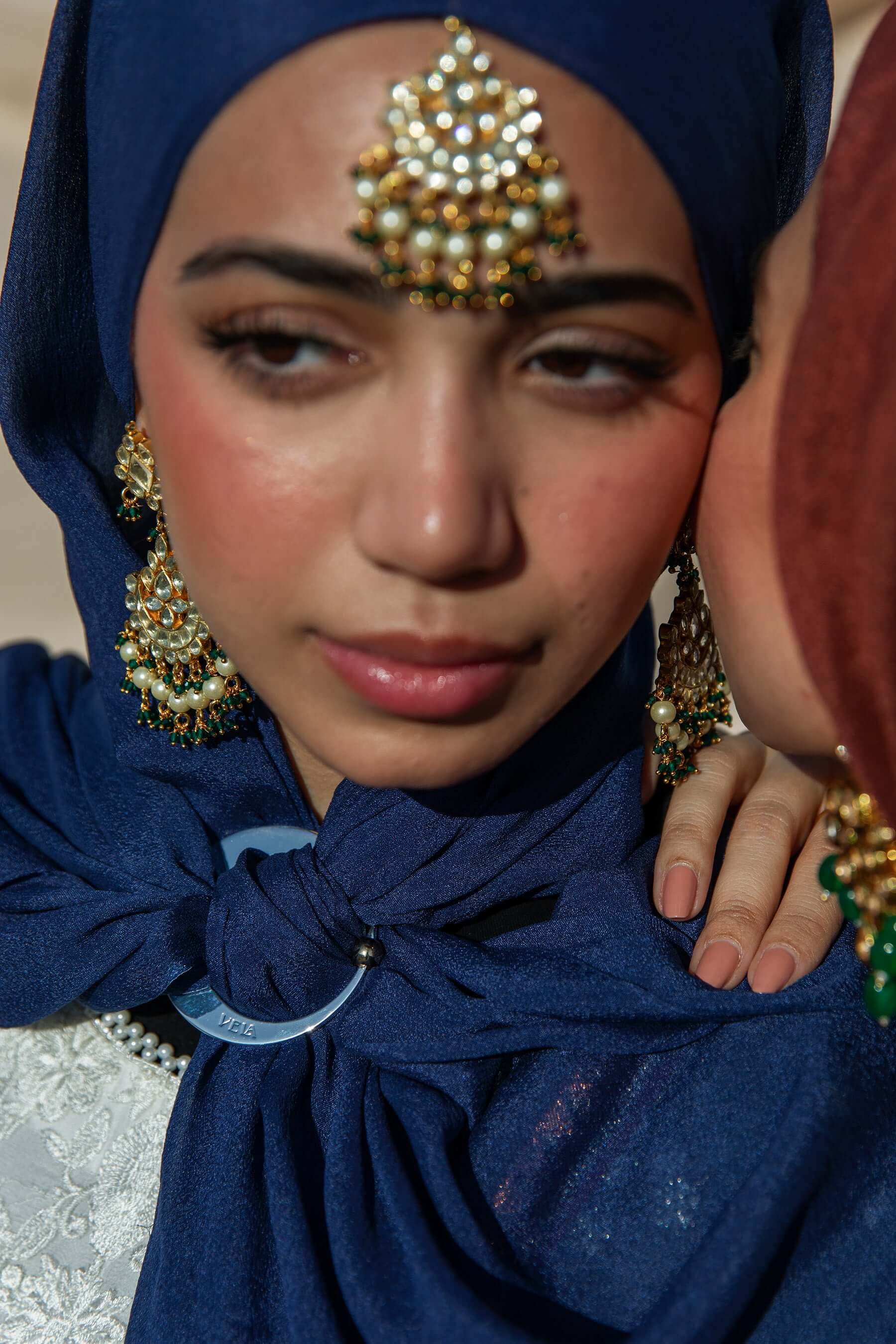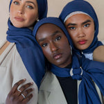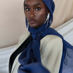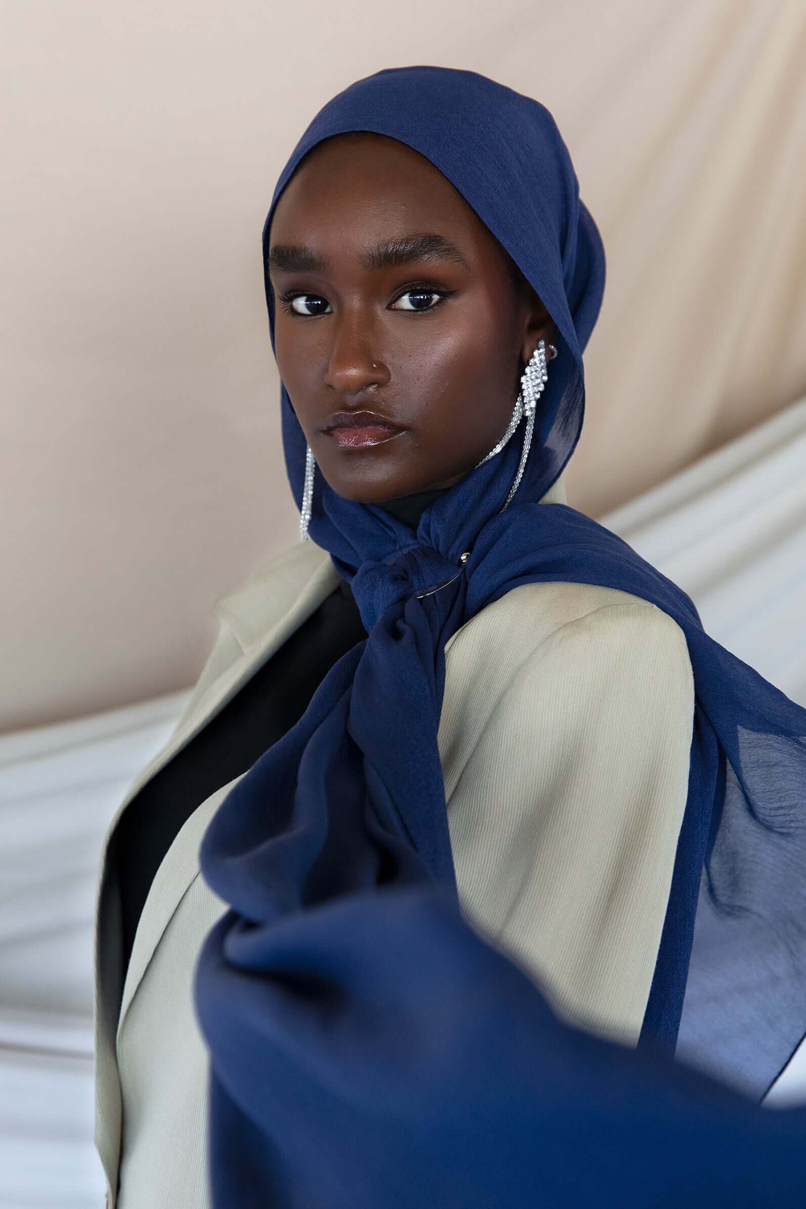 This 100% pure silk chiffon hijab is pure elegance. A deep sea blue with a subtle shine, it will effortlessly take your look from day to night.