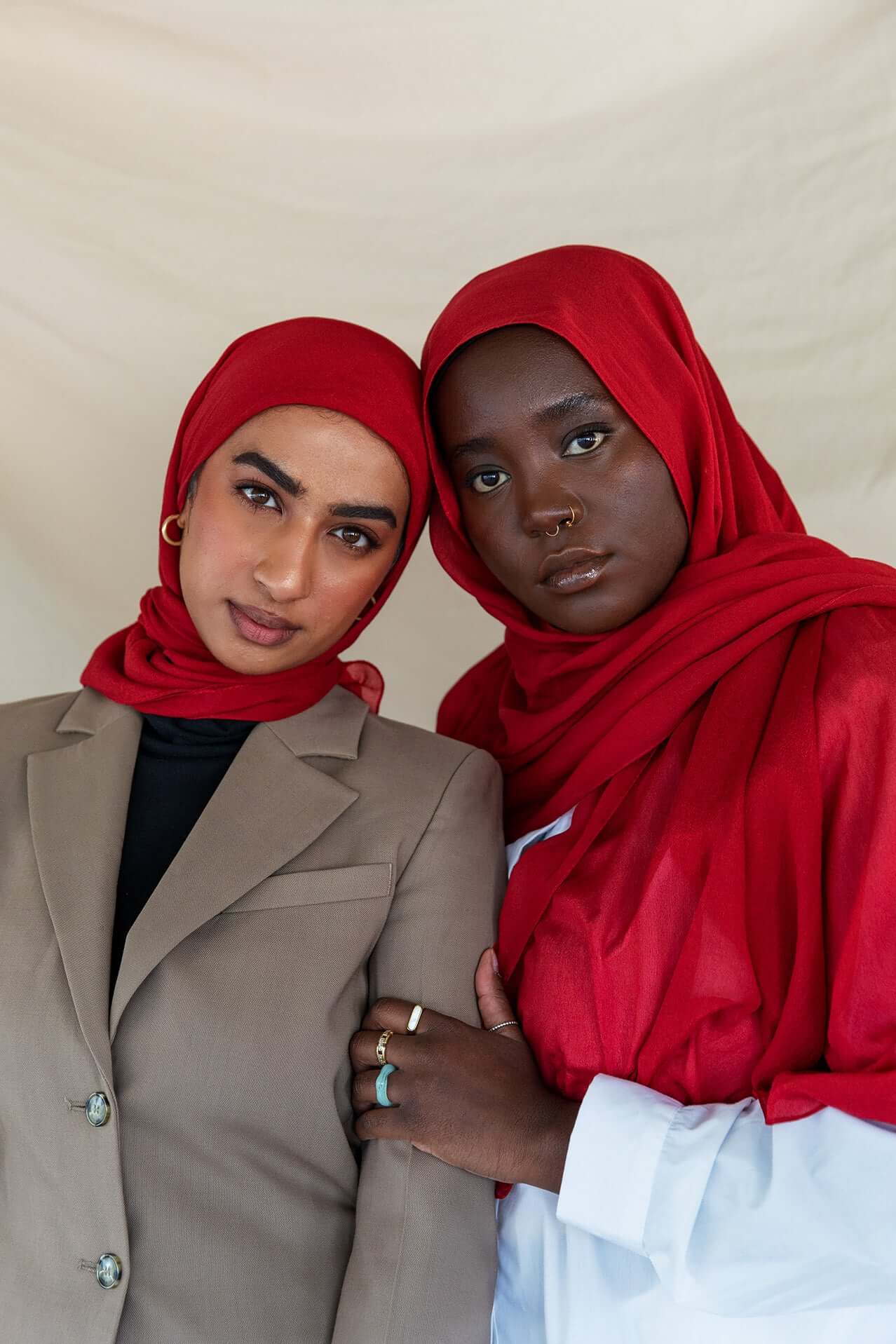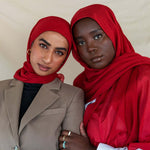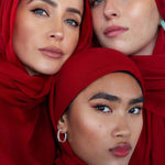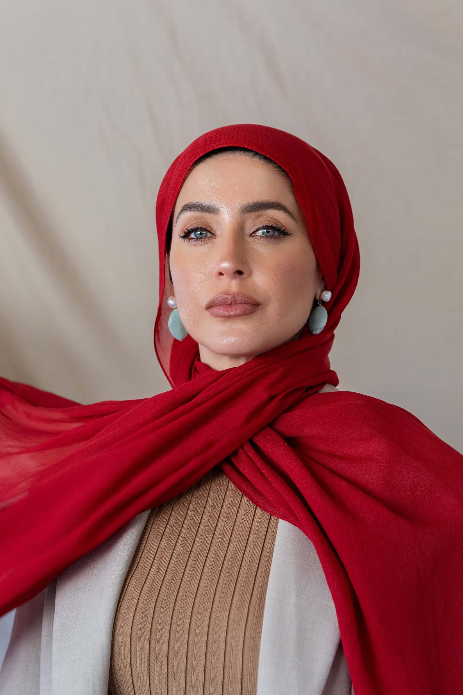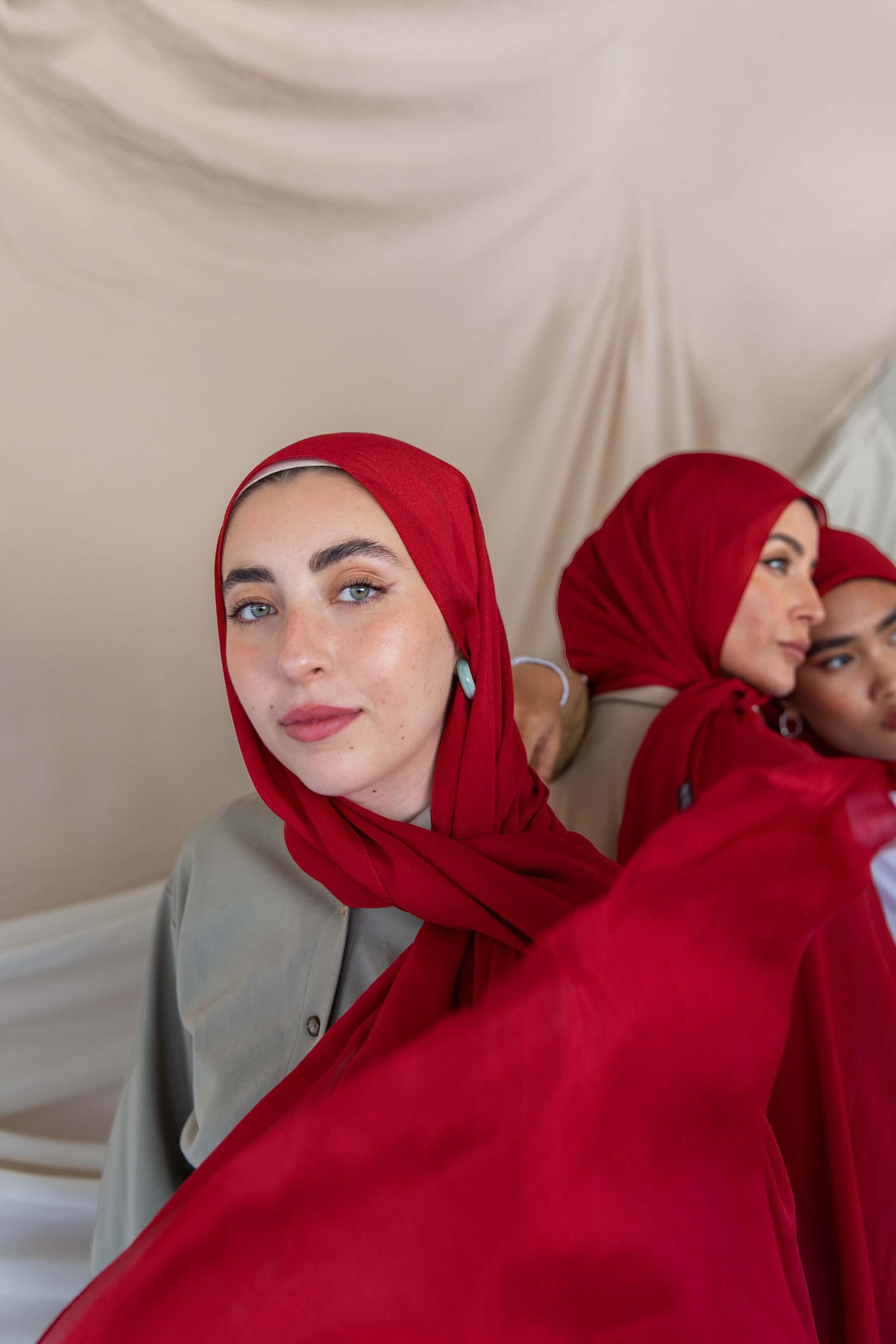 I was looking for a specific hue of red and when I saw this in the site I was amazed. It’s such a stunning color and the material is everything I wanted. Doesn't wrinkle easily or slip even without a cap! This us by far one of my all time favorite hijabs. Absolutely stunning and worth it!