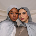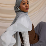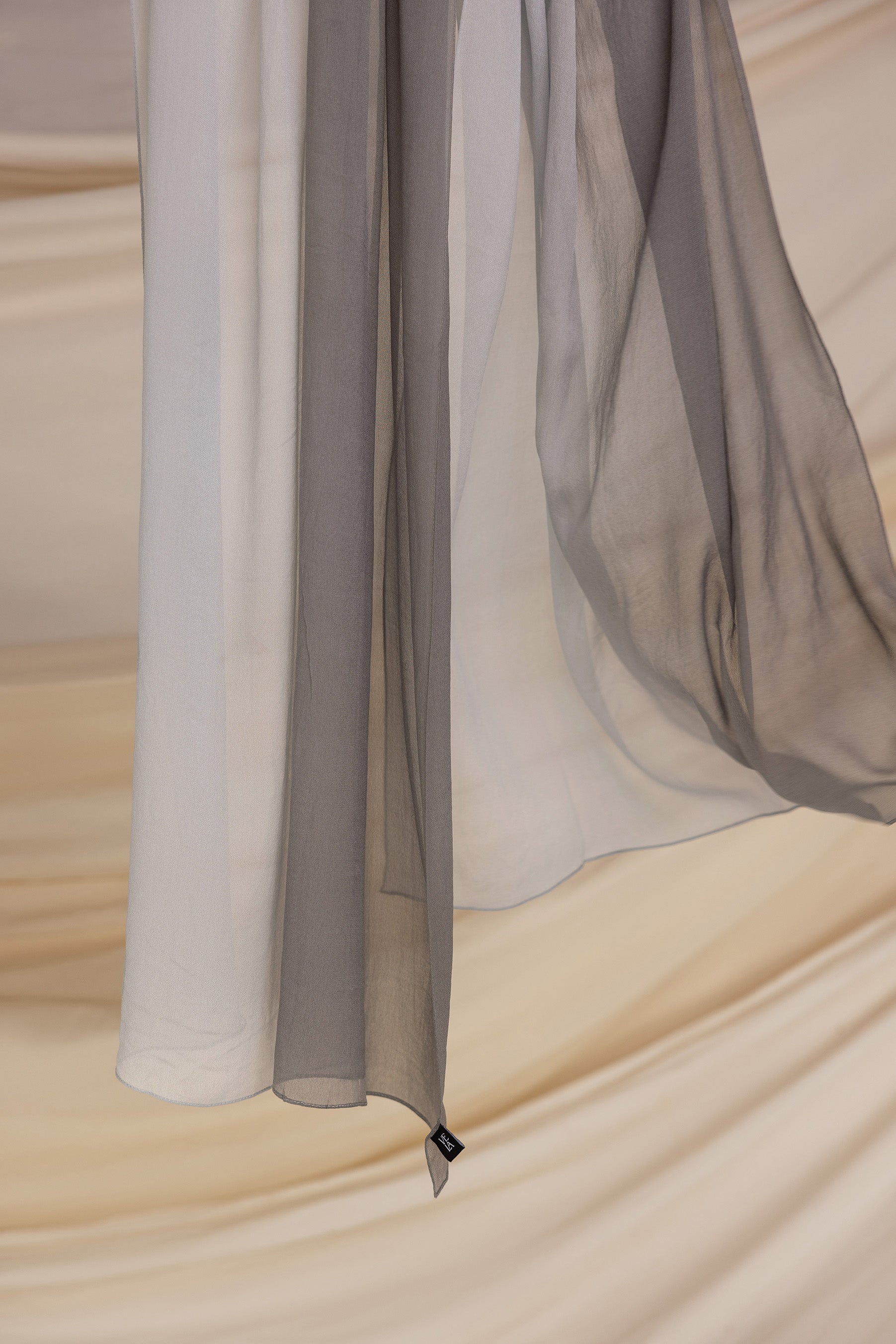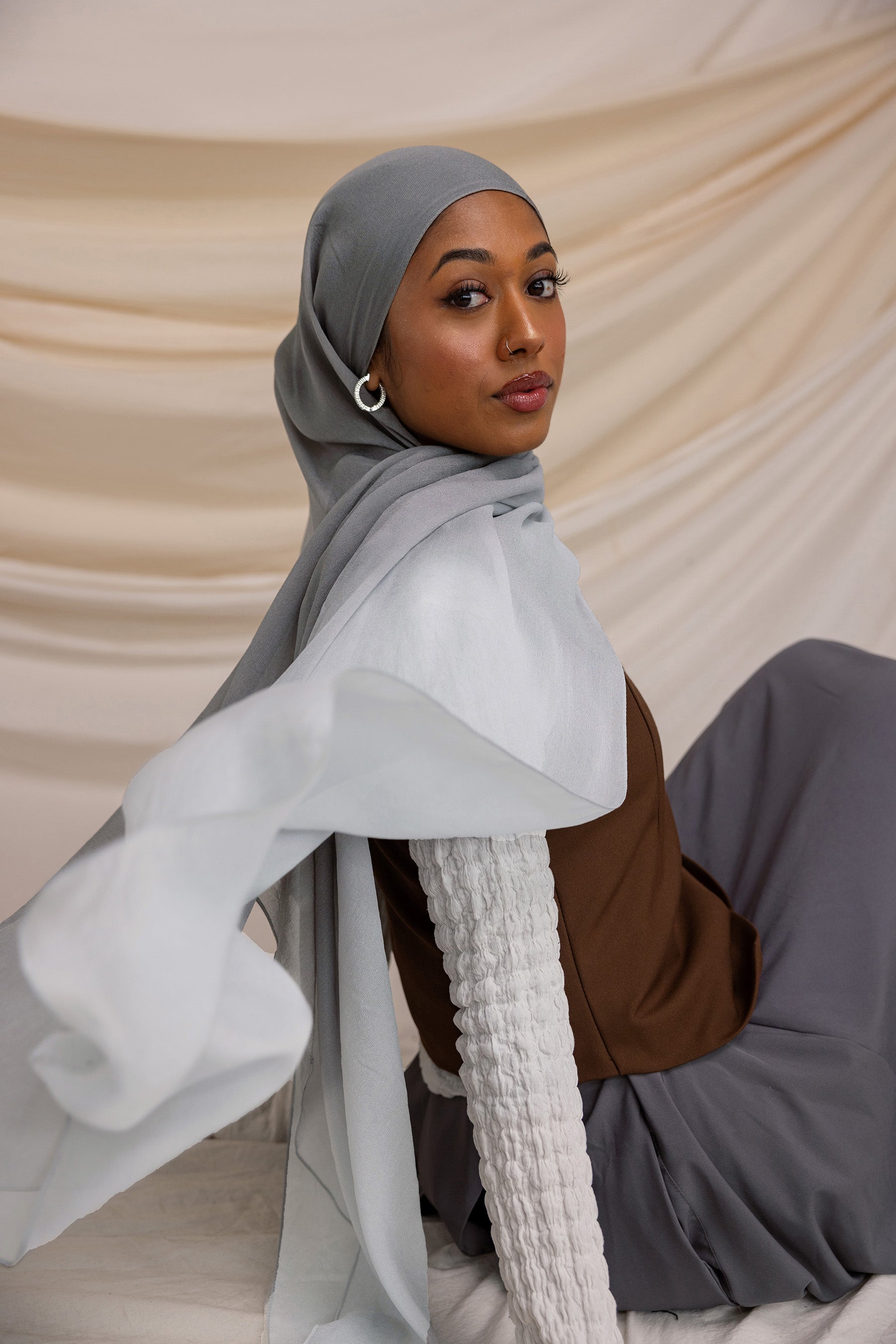 Step into sophistication with this stunning Ombre Silk Chiffon hijab. Featuring a seamless fade from cool gray to light silver, this lightweight 100% silk piece is designed to elevate your everyday or formal looks with its luxe shine and breathable texture. Made with premium Ombre Silk Chiffon Fabric, it’s ideal for adding a touch of grace to any outfit. The luxurious Silver Ombre Silk Chiffon fabric ensures a flawless drape, making it a must-have Ombre Silk Chiffon hijab.