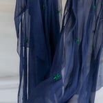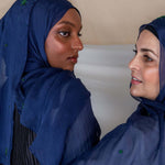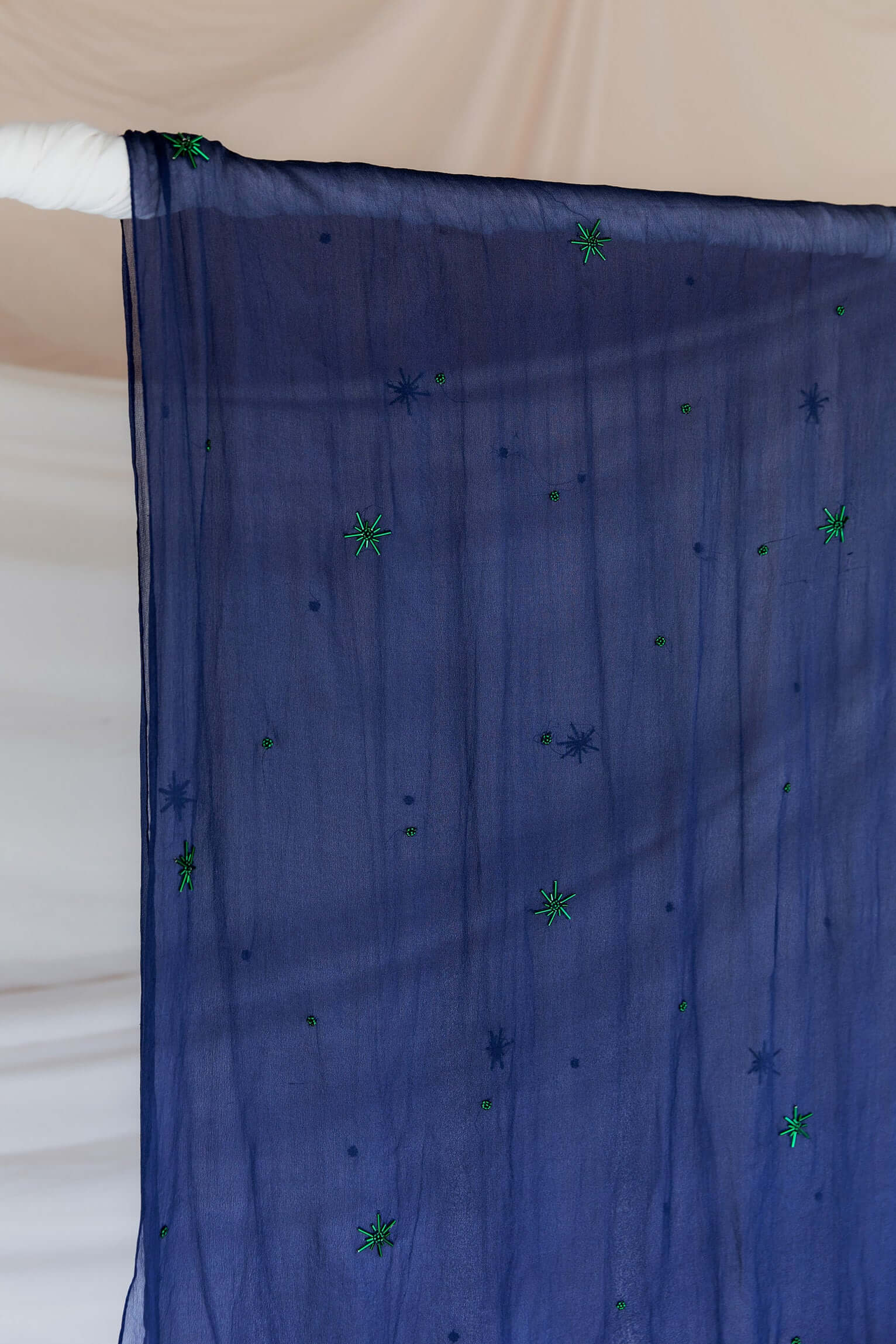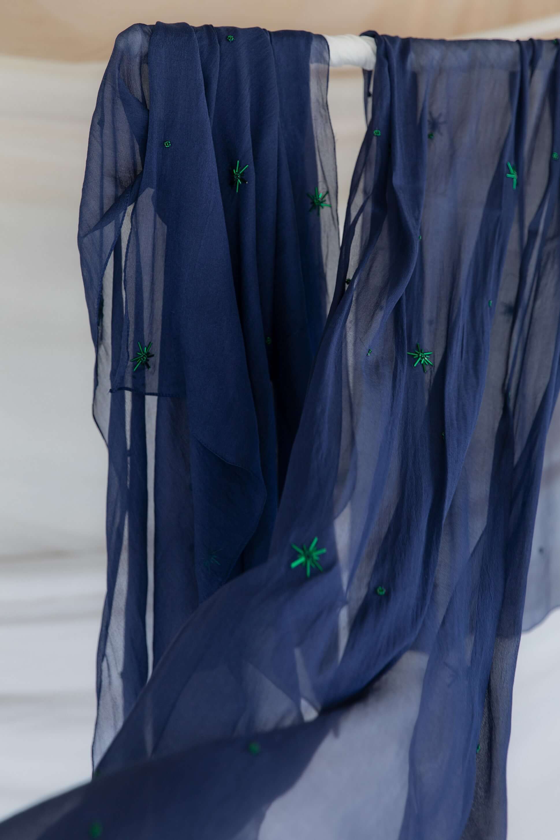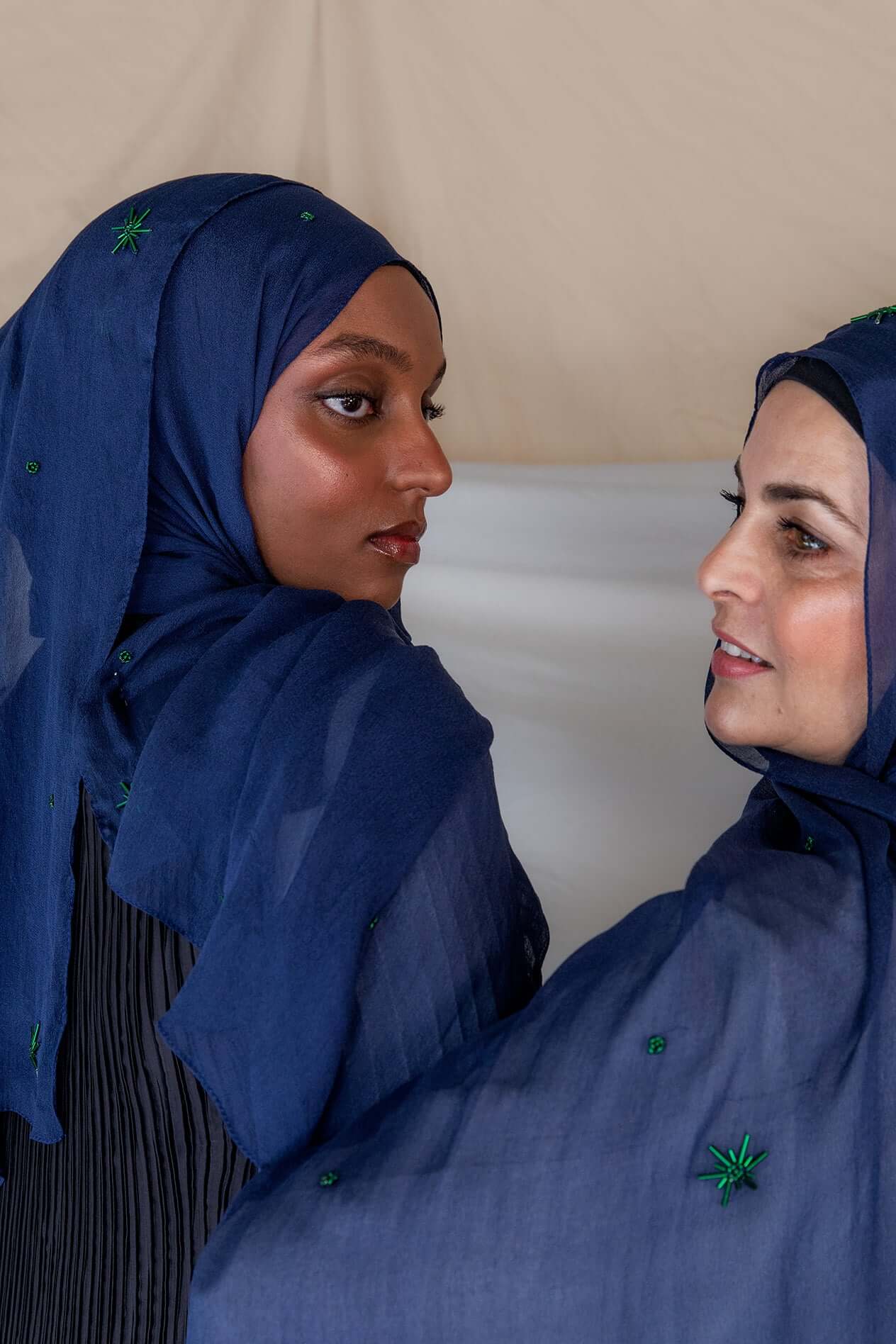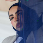 Stargazer Navy Blue: When a formal hijab is so pretty you want to wear it every day. Classic blue silk crepe fabric is artfully embroidered with emerald green starbursts that contrast beautifully. Explore the elegance of the Stargazer navy blue hijab, and discover complementary styles like the Rose Gold hijab and Serenity blue Vela for a complete, sophisticated look.